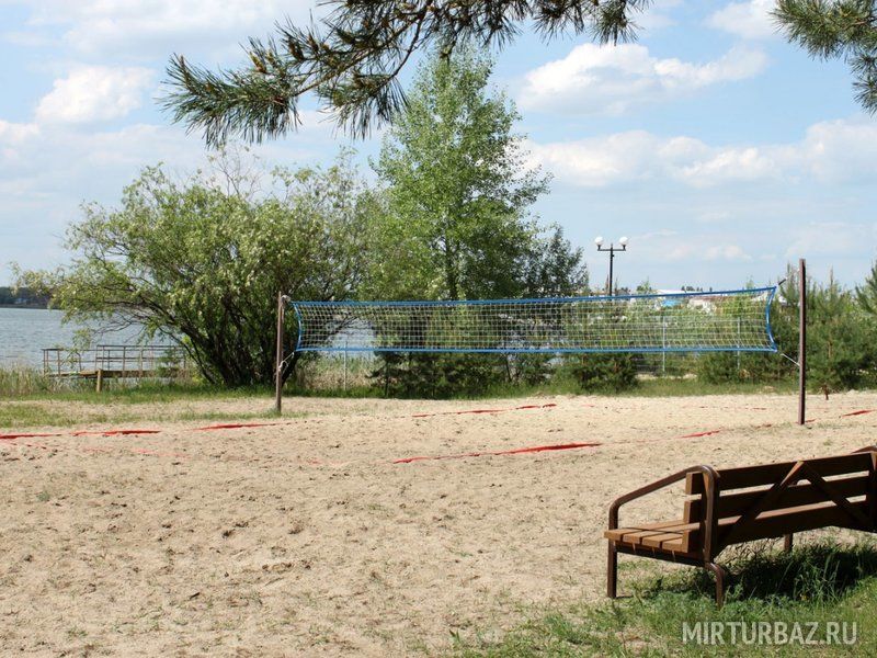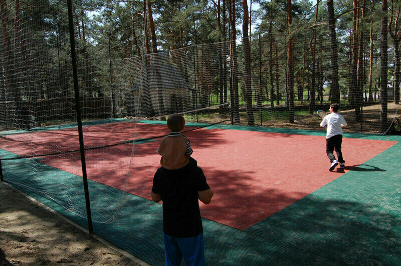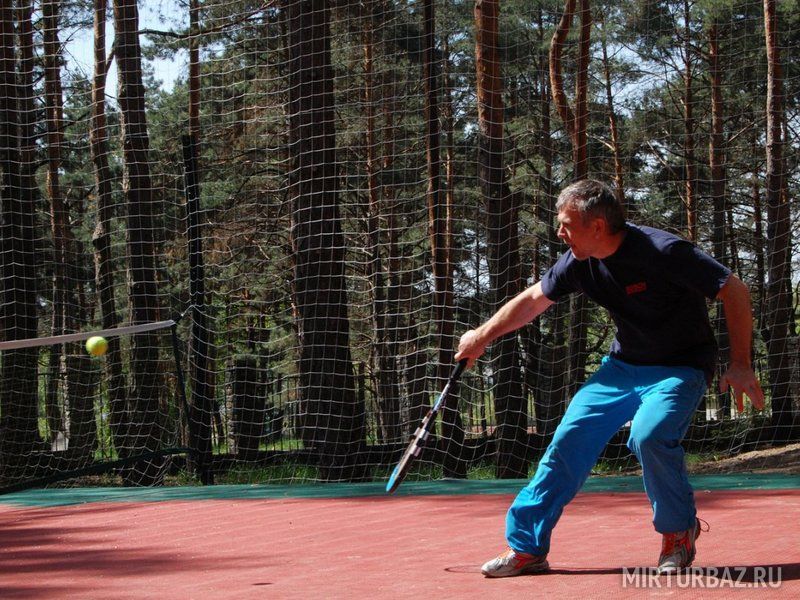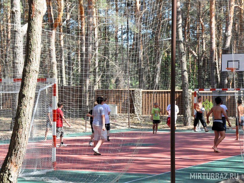 На базе для активного отдыха предлагается универсальная спортивная площадка со специальным покрытием и вечерним освещением для игр: