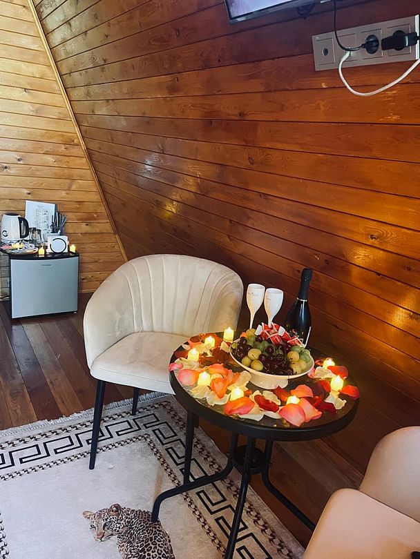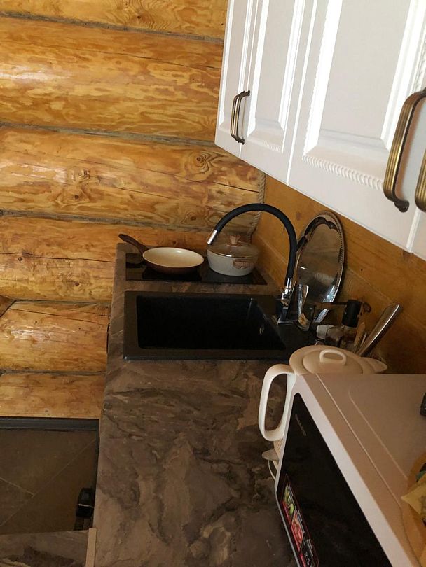 Внутри дома: одна комната, двуспальная кровать, столик, два стула, холодильник, чайник, посуда, приборы, ТВ, Wi-Fi. Душевая, совмещенная с санузлом.