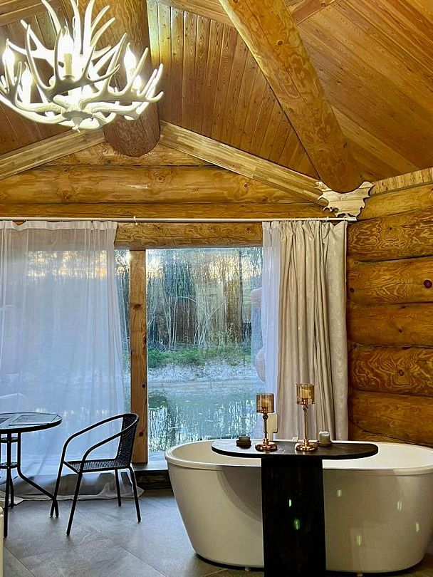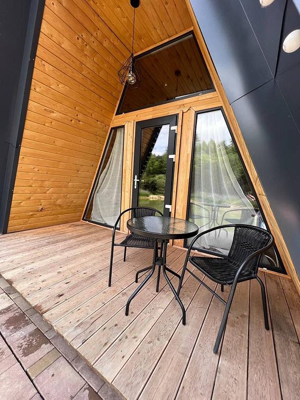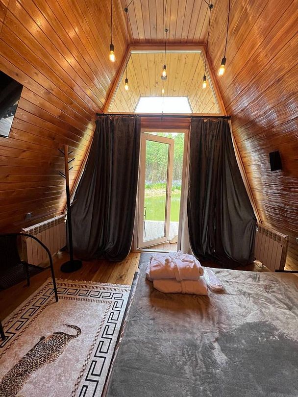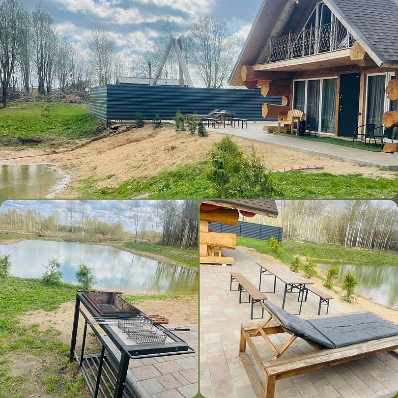 Уютный дом для двоих на берегу пруда с панорамным видом, идеален для романтического отдыха на природе.