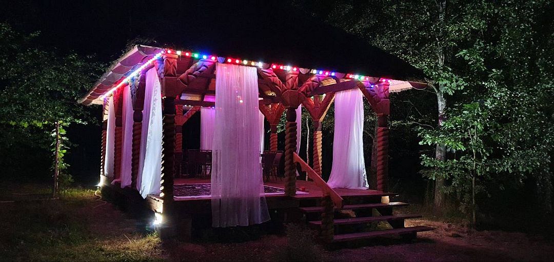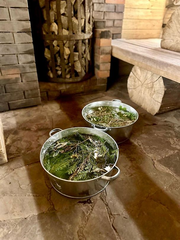Банный комплекс — баня на дровах и банный чан с наполнением травами. Комплексная услуга для ценителей бани и парения с травами на открытом воздухе. Для компаний не более 8 человек.
