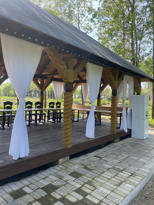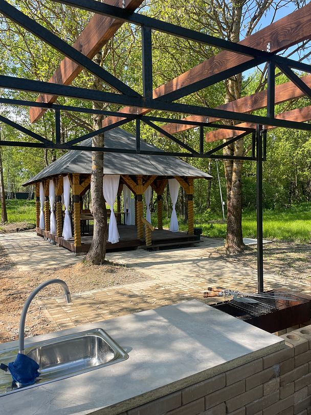 Беседка открытого типа, подойдет как для небольшой компании, так и для компании до 25 человек. Вокруг беседки территория из брусчатки, есть место для установки звукового и прочего оборудования, и, конечно же, для танцев. Рядом с беседкой расположена зона для барбекю с мангалом, рабочей поверхностью и раковиной — удобно вымыть и нарезать продукты. Шампура, решетку, уголь и розжиг предоставляются за дополнительную плату.