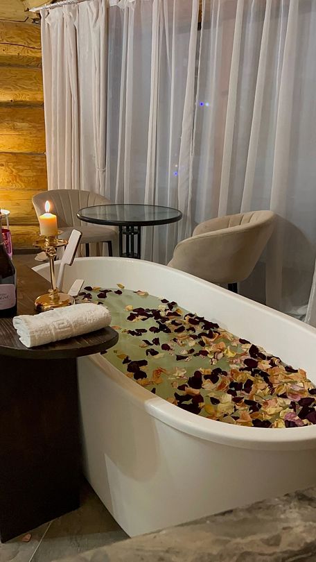 В услугу входят: букет цветов, лепестки роз, свечи, игристое вино, фрукты, конфеты, наполнение для ванной.