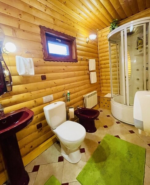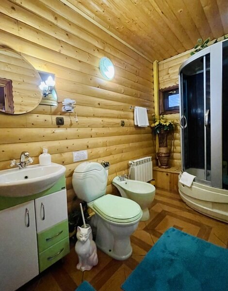 Туалетная зона находится в самом коттедже. Система теплого пола не даст Вам замерзнуть. Душевая кабина и биде сделают Ваш отдых еще более комфортабельным. Кроме того, мы предоставляем все необходимые туалетные принадлежности, в число которых входят тапочки, халаты и предметы личной гигиены.