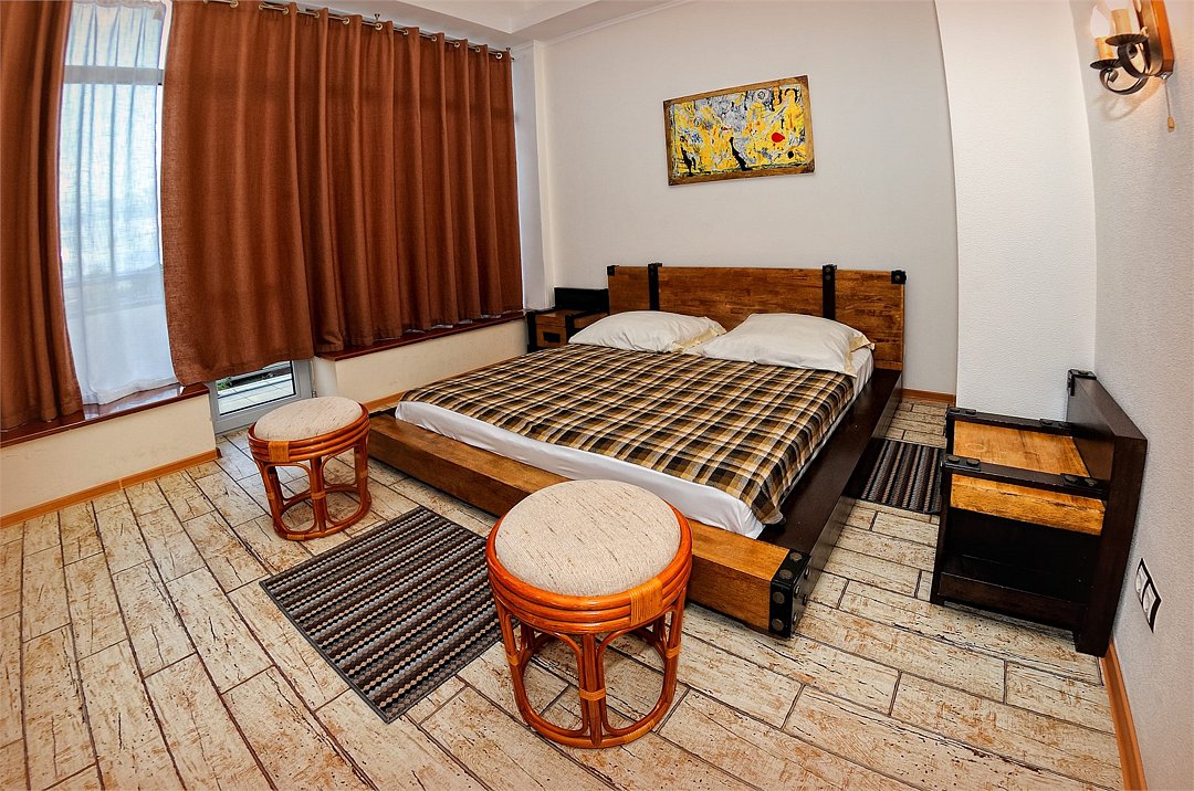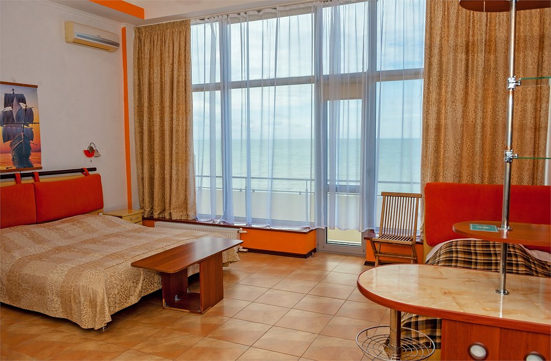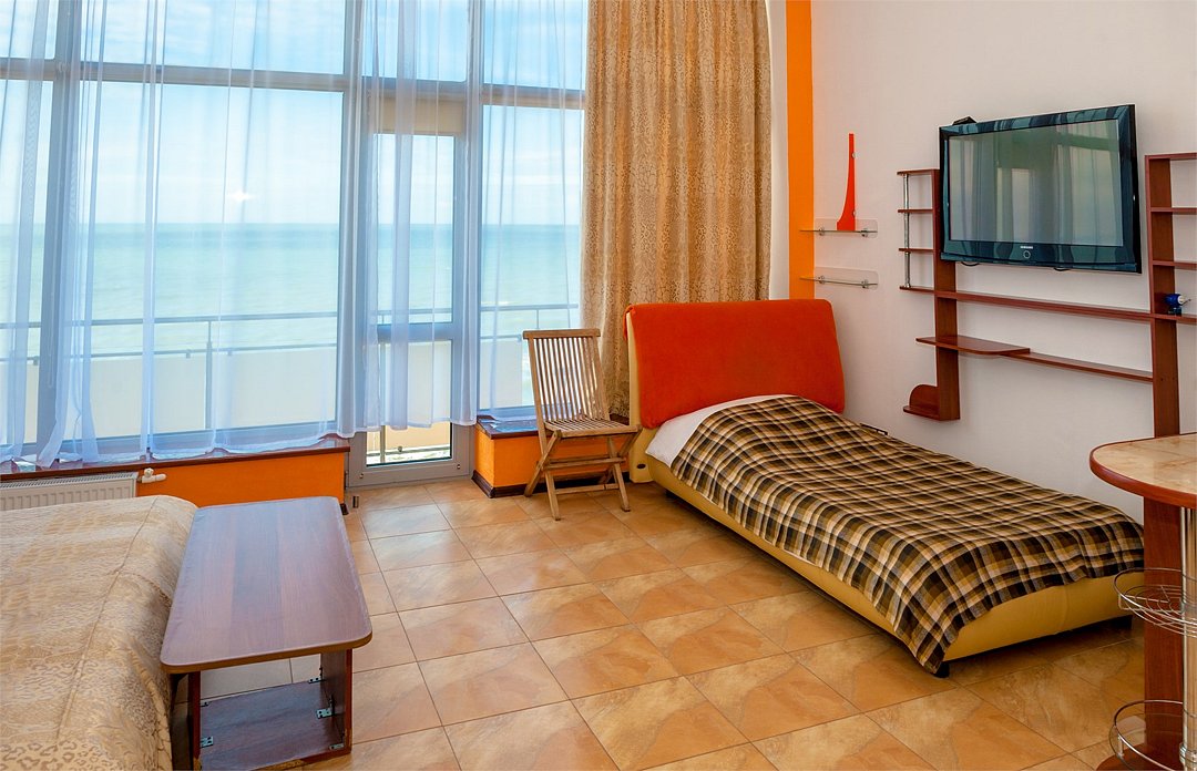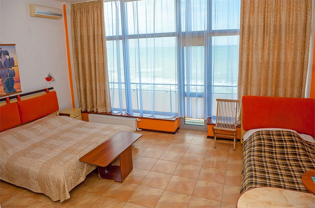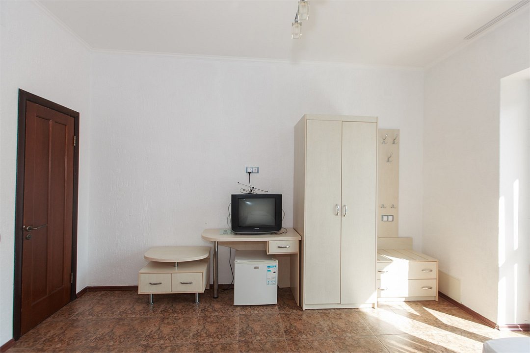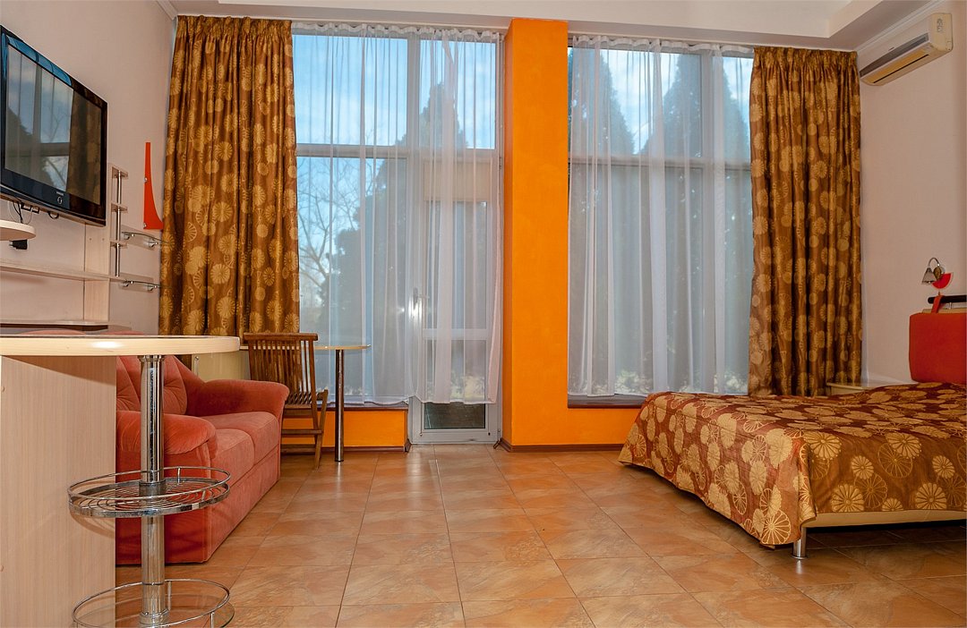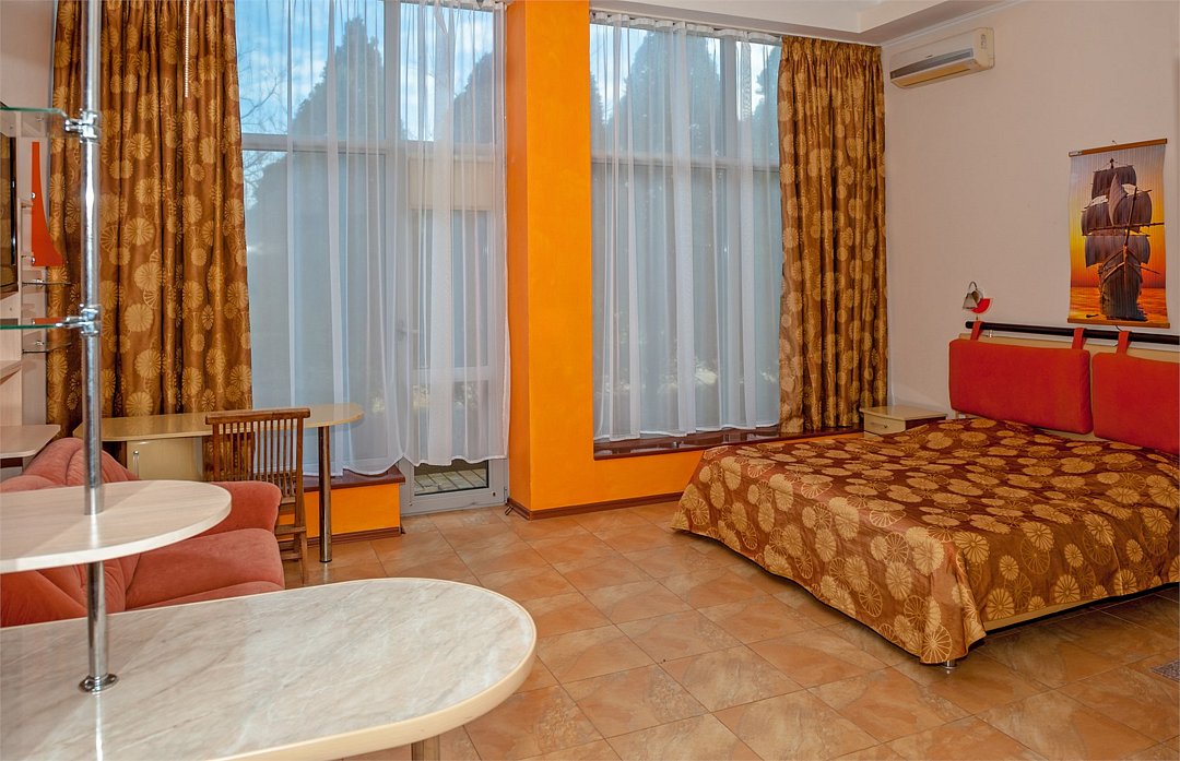 Просторные светлые однокомнатные номера с панорамными окнами, расположены на первом этаже трехэтажного корпуса. Ванная комната. Двуспальная кровать и полуторная кровать. Холодильник, телевизор, кондиционер. В каждом номере балконУслуги и удобства