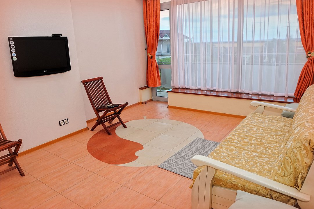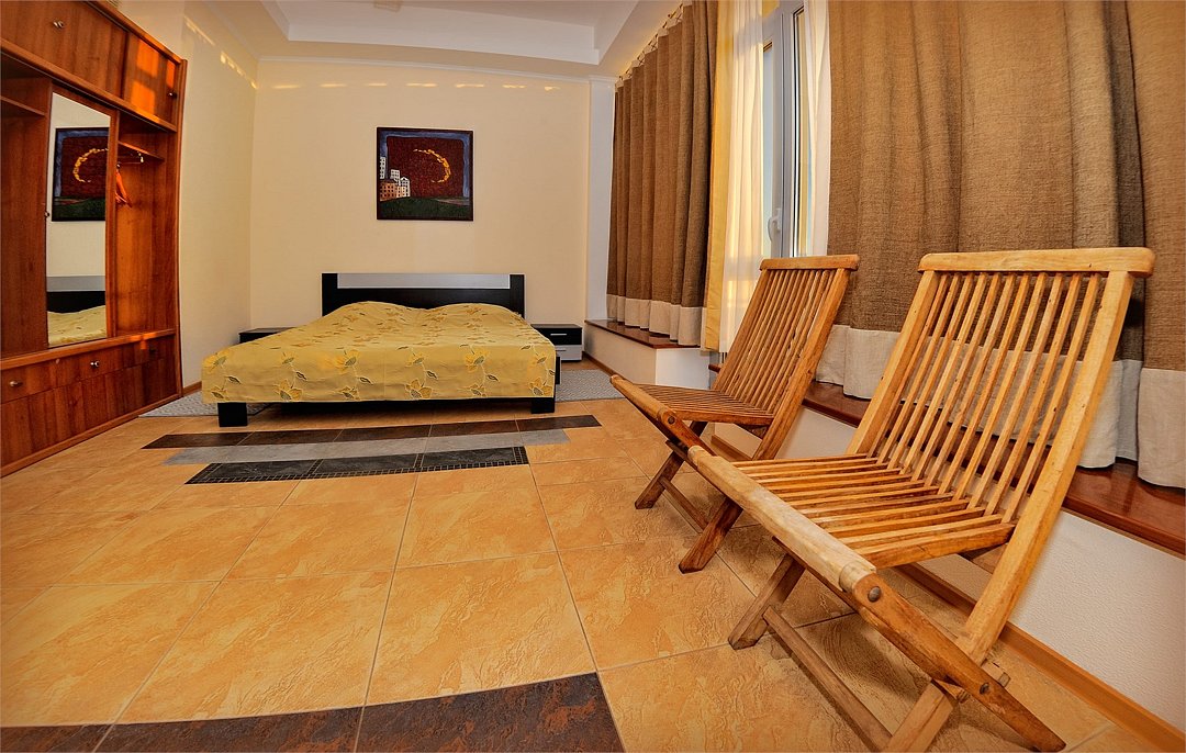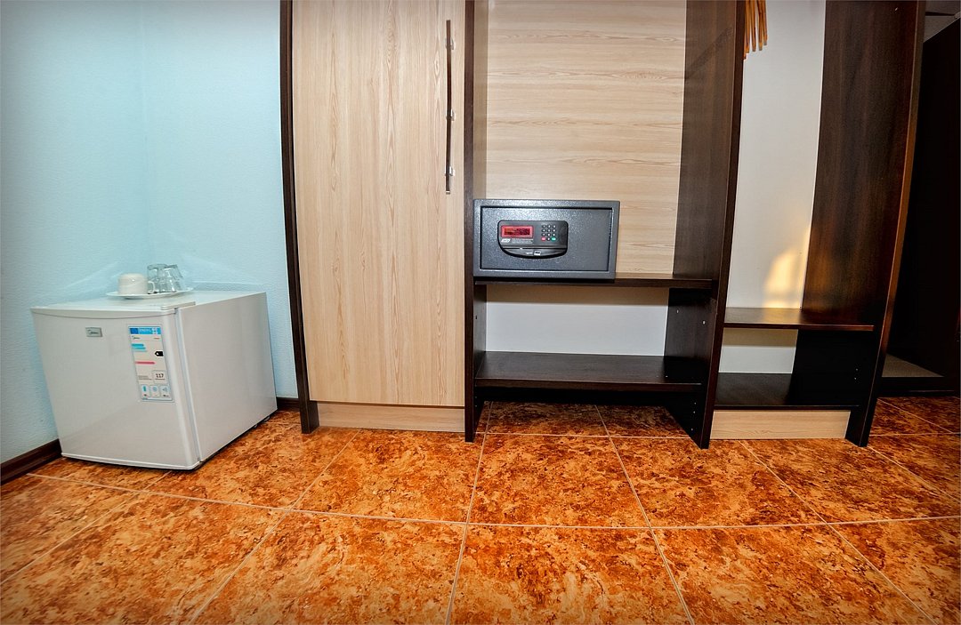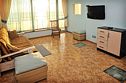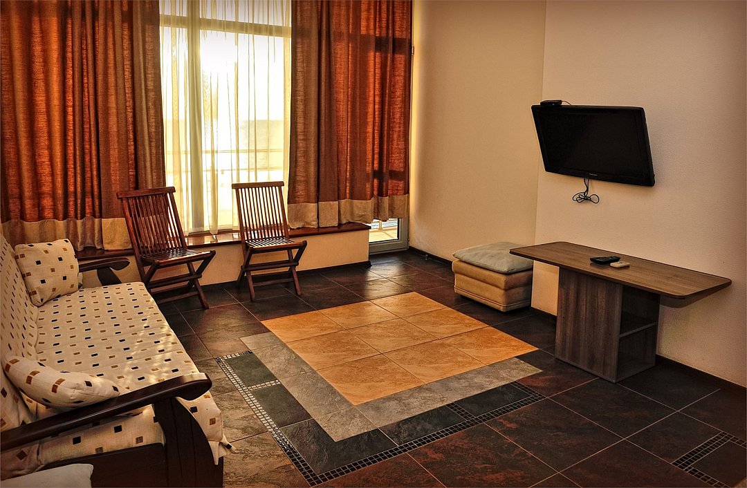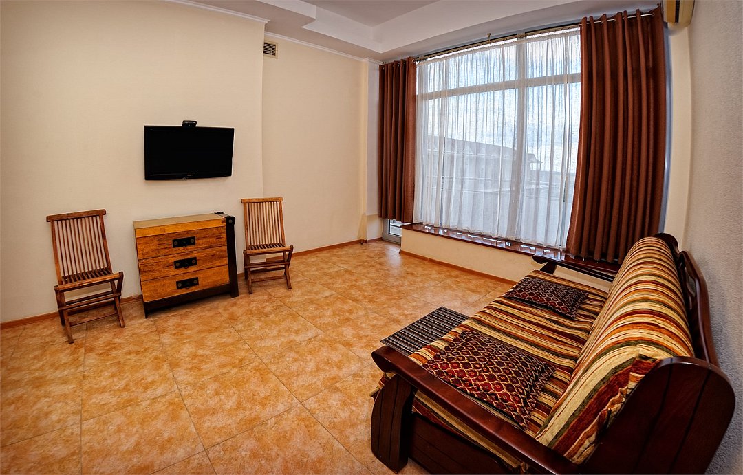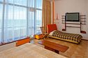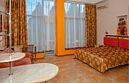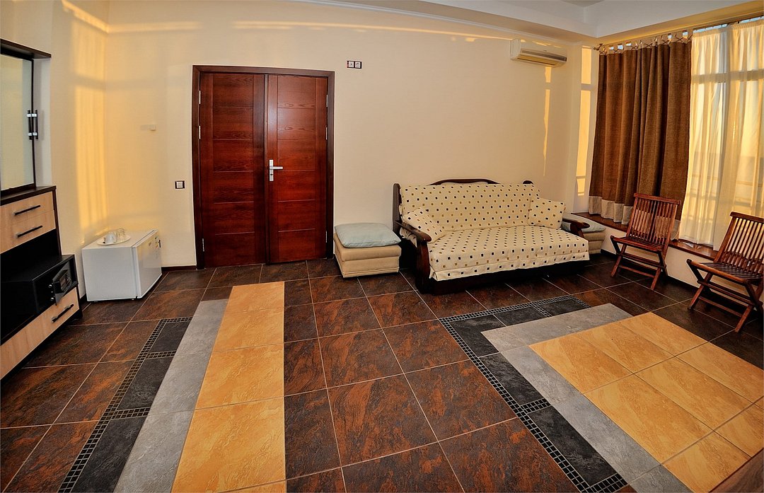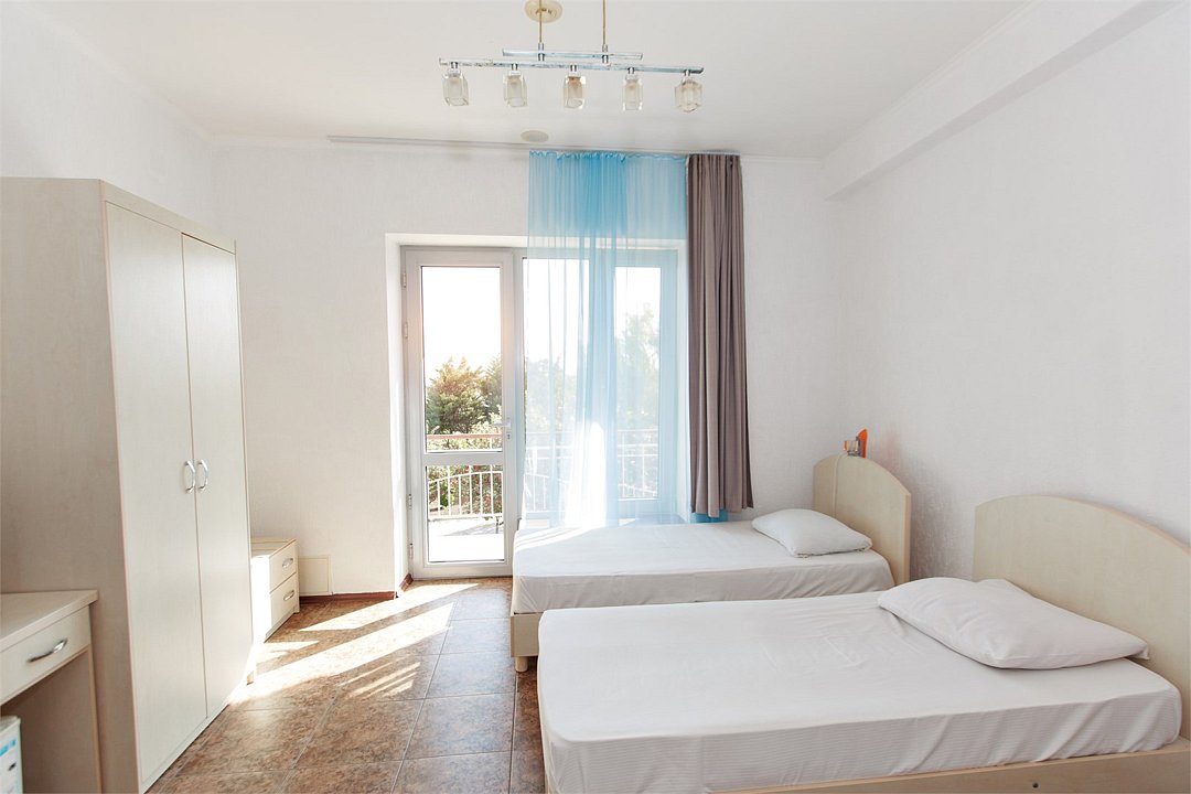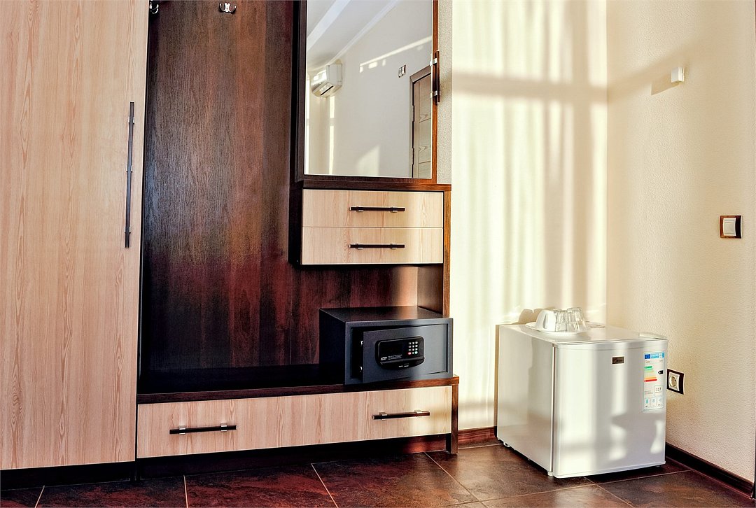 Просторные светлые однокомнатные номера с панорамными окнами, расположены на первом этаже трехэтажного корпуса. Ванная комната. Двуспальная кровать и полуторная кровать. Холодильник, телевизор, кондиционер. В каждом номере балконУслуги и удобства