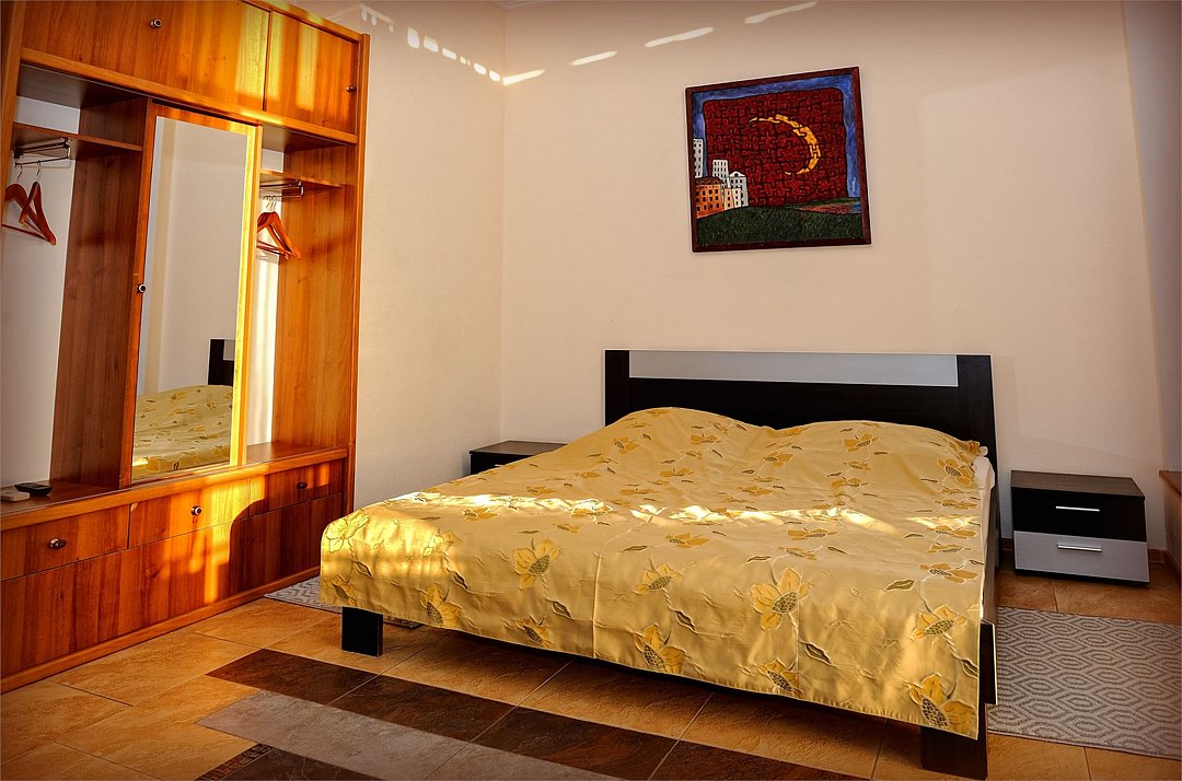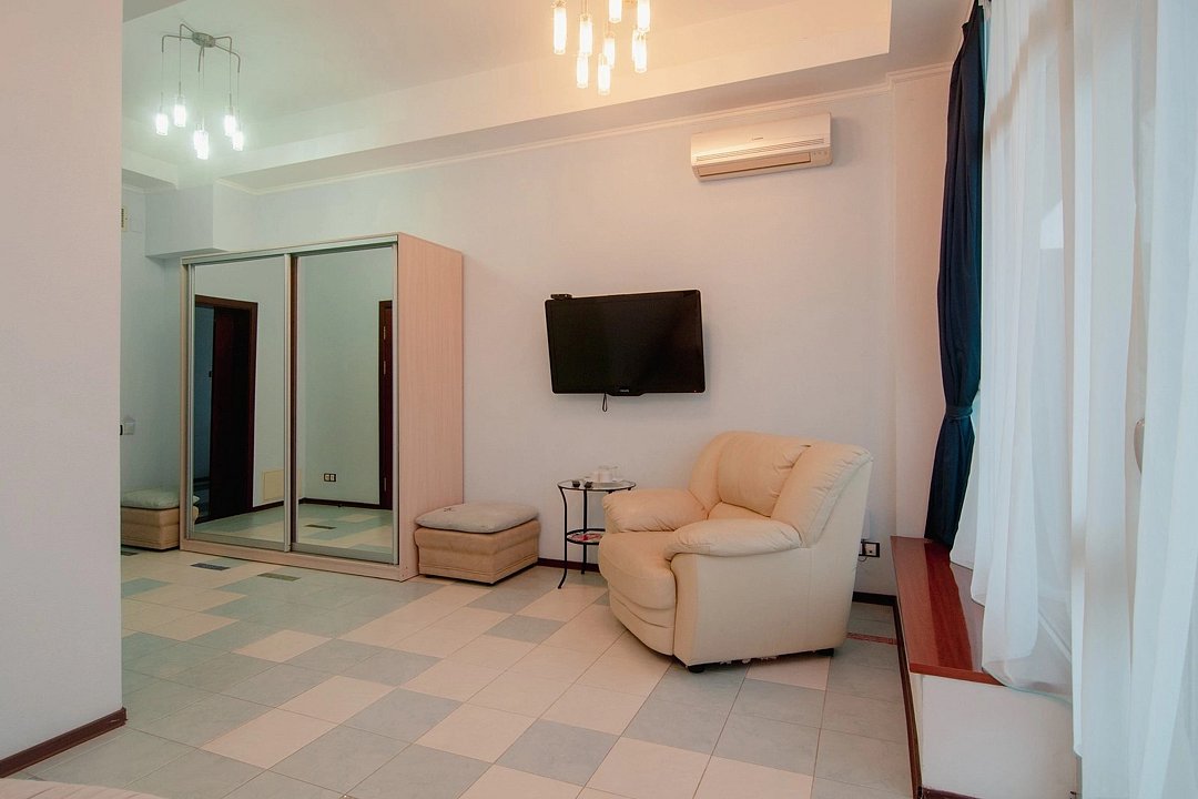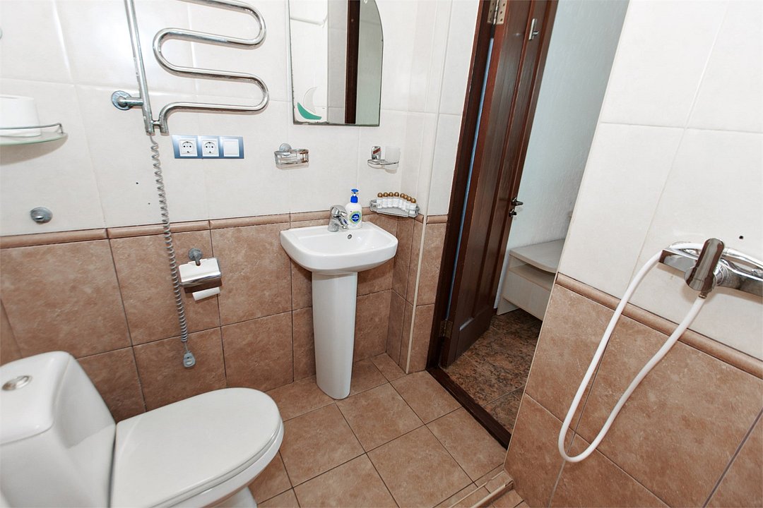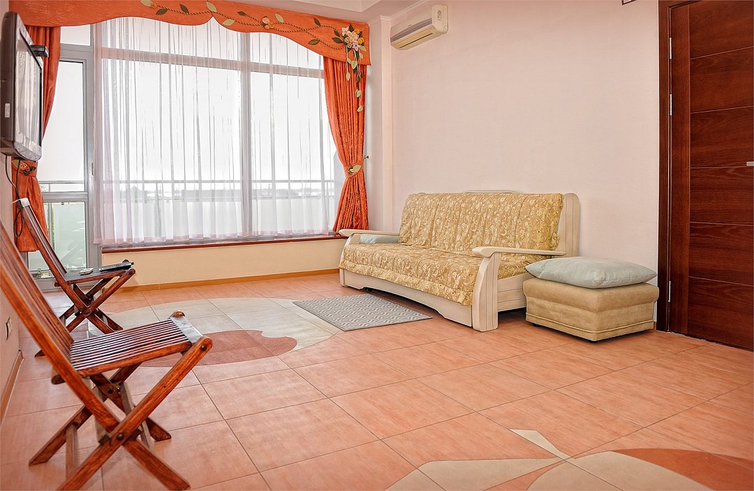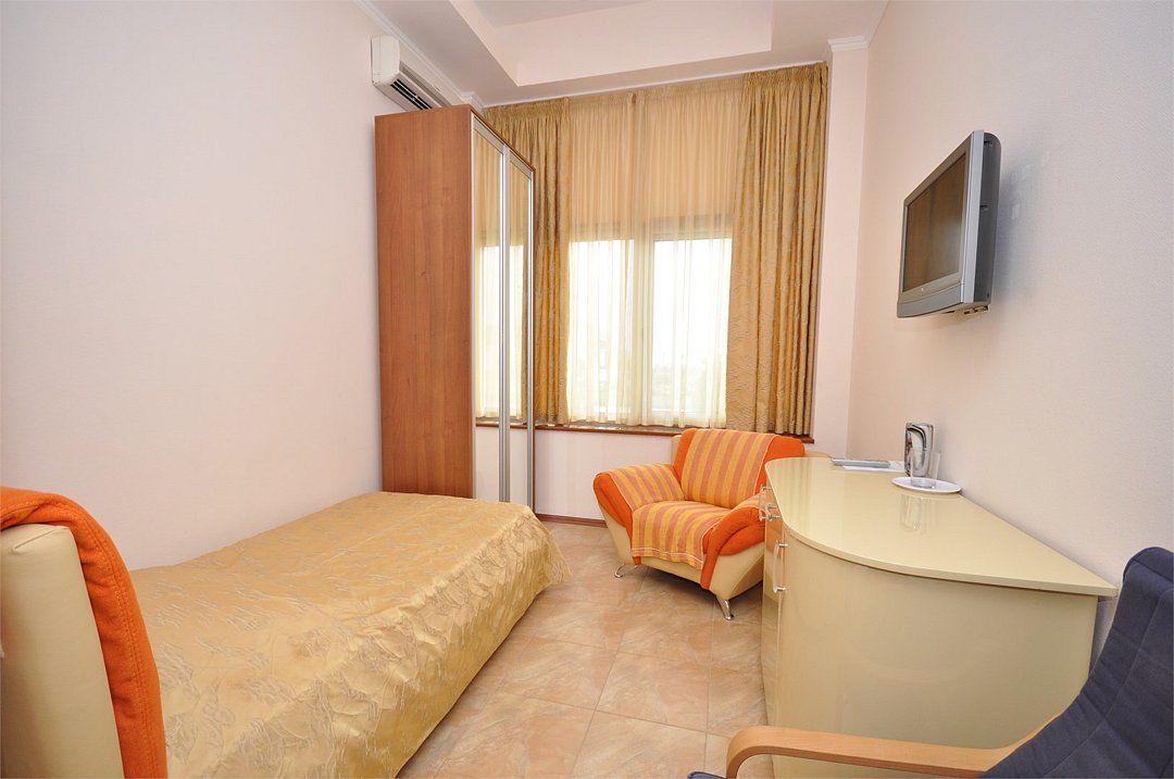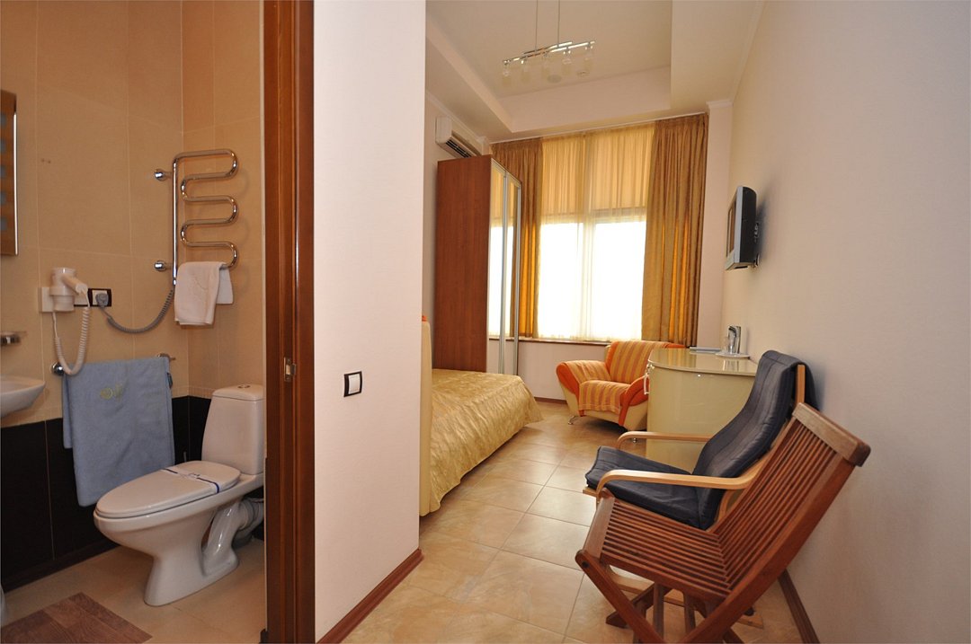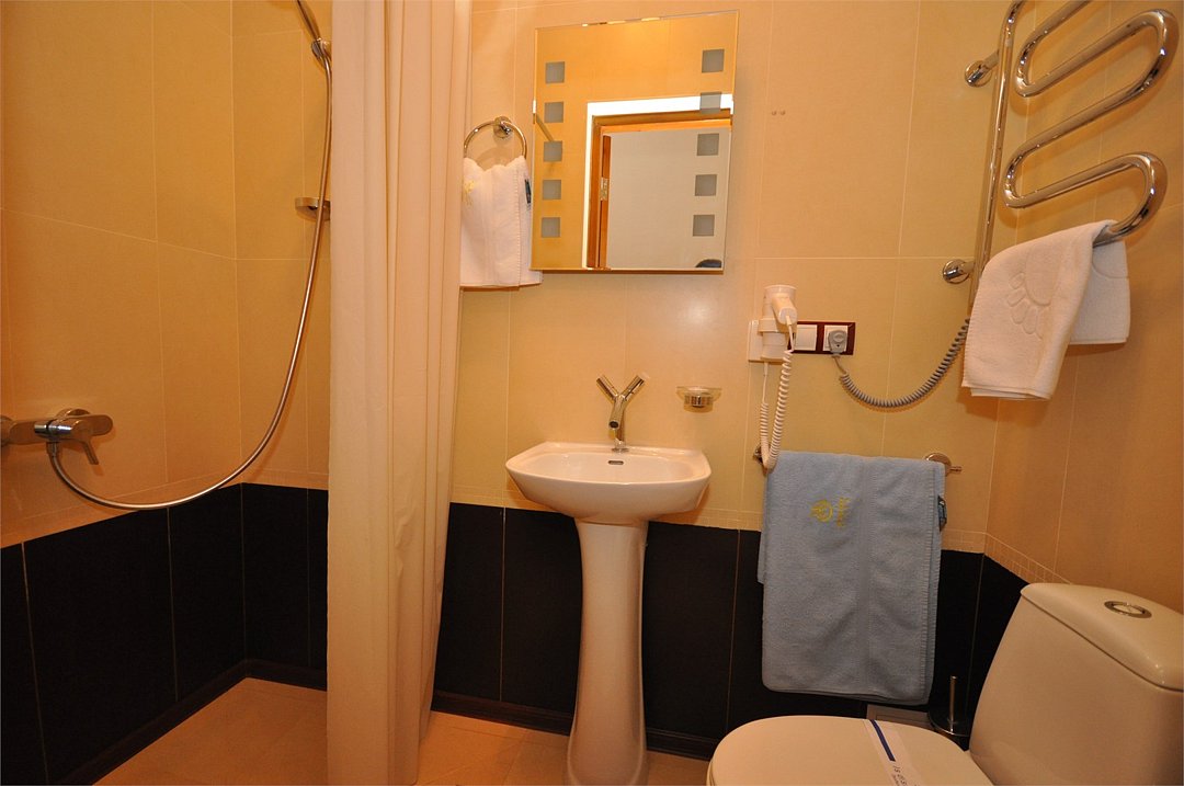 Просторные светлые однокомнатные номера с панорамными окнами, расположены на первом этаже трехэтажного корпуса. Ванная комната. Двуспальная кровать и полуторная кровать. Холодильник, телевизор, кондиционер. В каждом номере балконУслуги и удобства