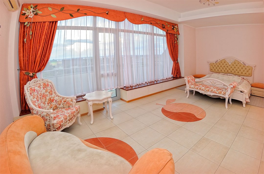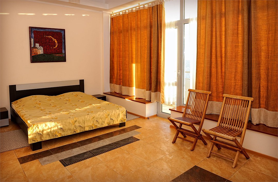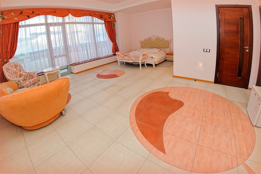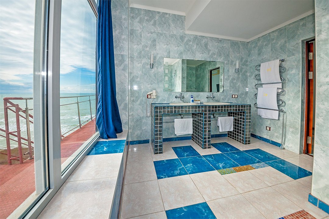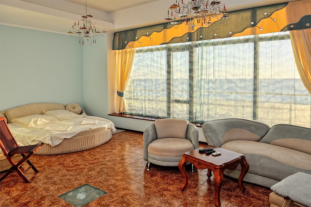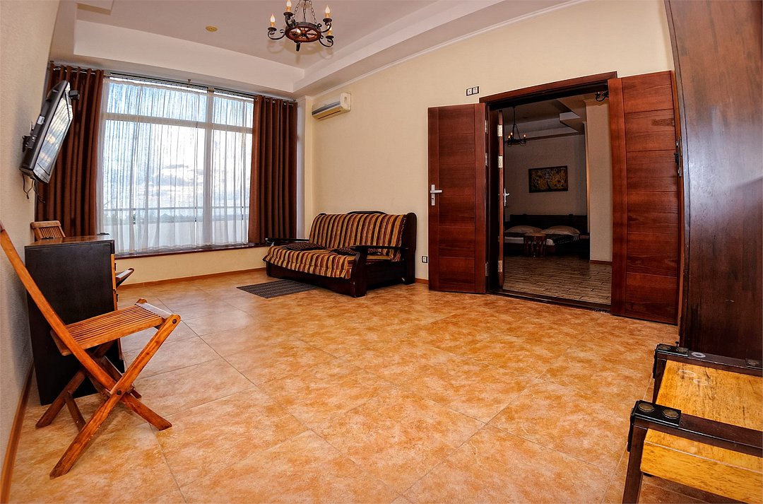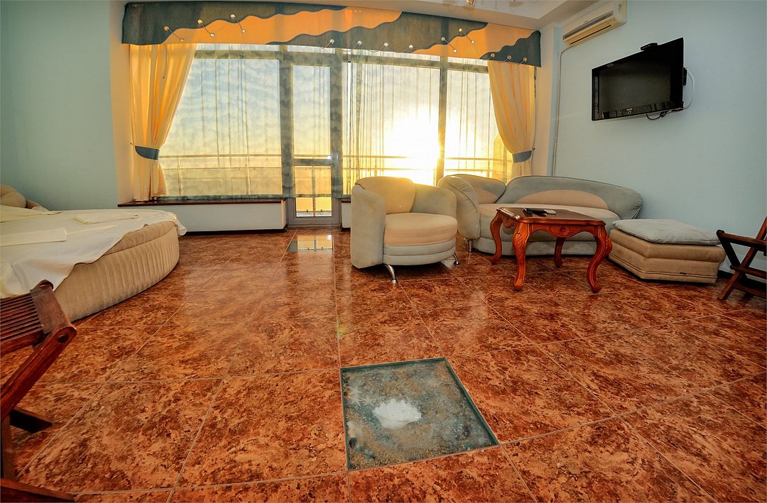 Двухкомнатный номер "Аквариум" расположен на втором этаже основного корпуса отеля, с видом на море. Номер оформлен в индивидуальном авторском стиле. В каждой комнате отдельный санузел с ванной и душевой кабиной. В номере: кровать двуспальная, диван двуспальный, телевизор, холодильник, чайник, кондиционер, сейф. В "Аквариуме" Вы попадете в царство водного мира, а в сочетании с прекрасным видом на море, который открывается с балкона, Вы сможете получить эстетическое наслаждение.Услуги и удобства