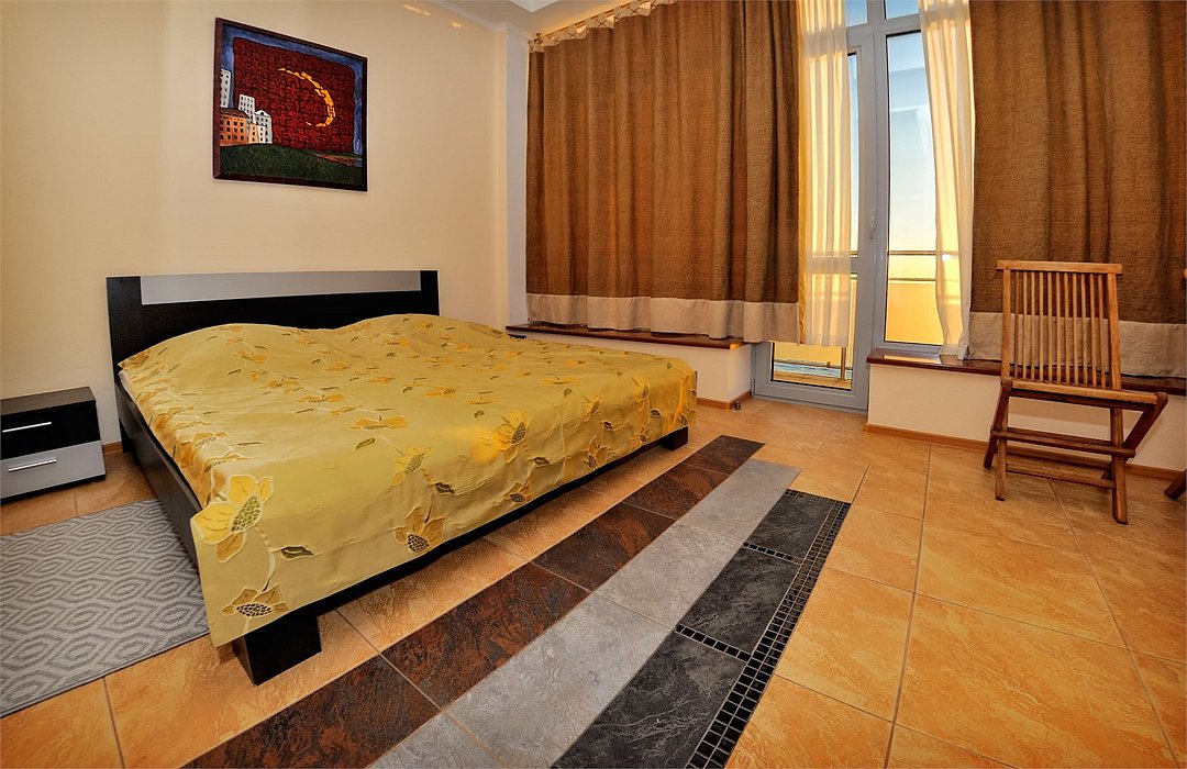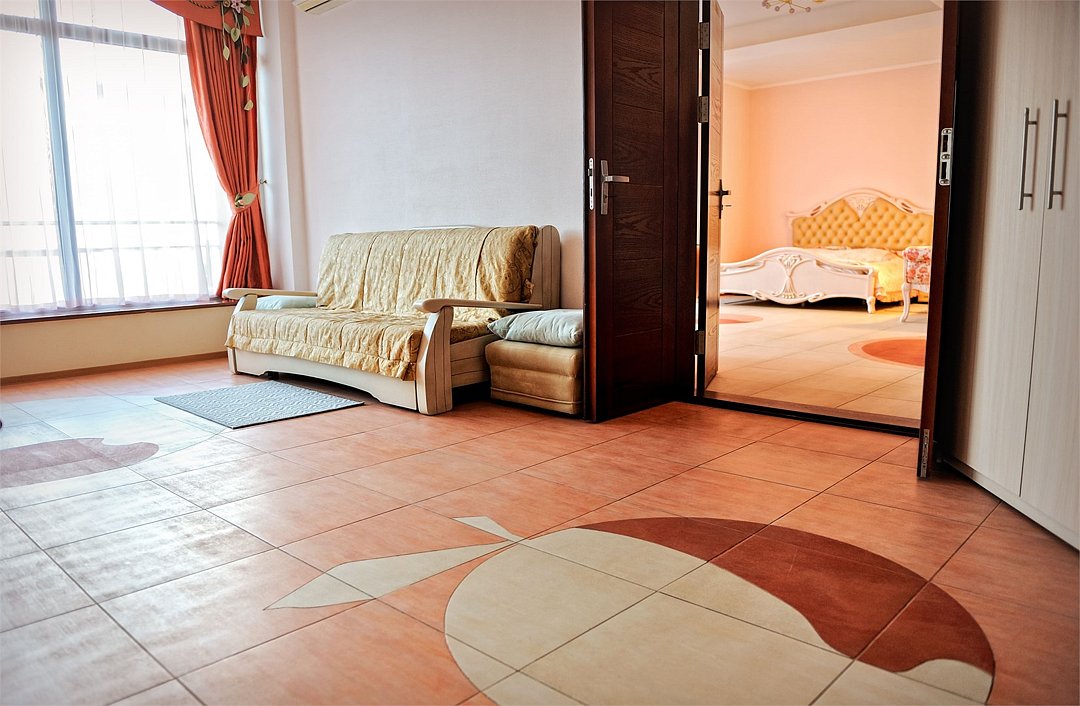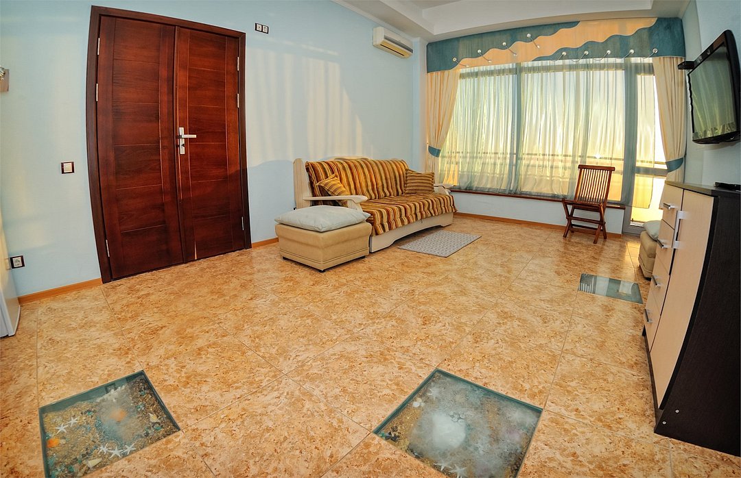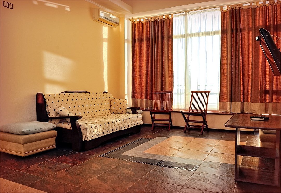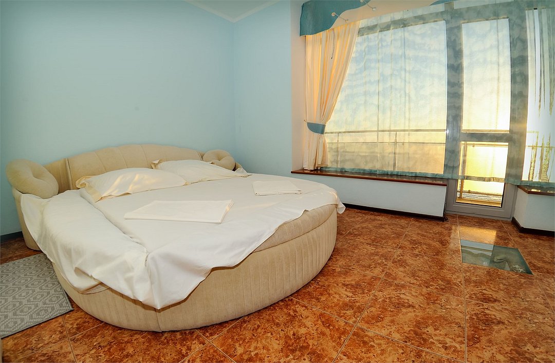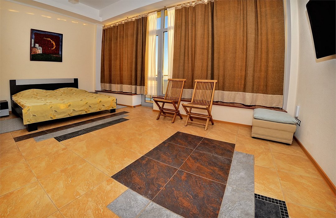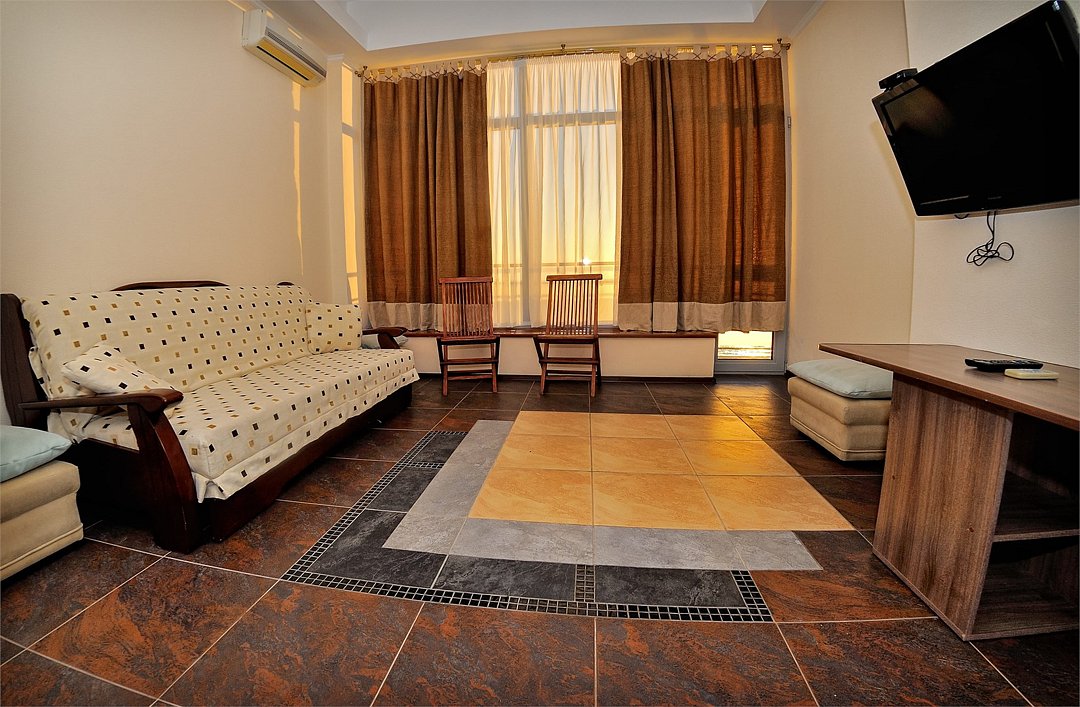 Двухкомнатный номер "Аквариум" расположен на втором этаже основного корпуса отеля, с видом на море. Номер оформлен в индивидуальном авторском стиле. В каждой комнате отдельный санузел с ванной и душевой кабиной. В номере: кровать двуспальная, диван двуспальный, телевизор, холодильник, чайник, кондиционер, сейф. В "Аквариуме" Вы попадете в царство водного мира, а в сочетании с прекрасным видом на море, который открывается с балкона, Вы сможете получить эстетическое наслаждение.Услуги и удобства