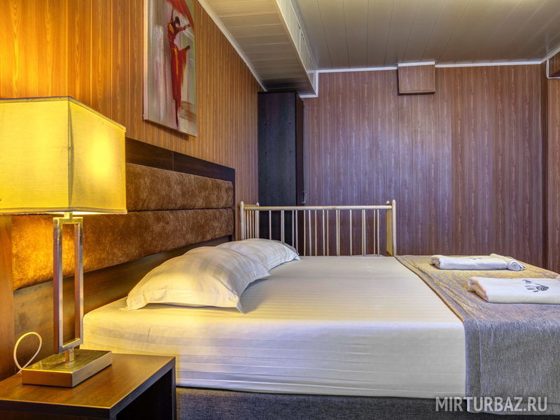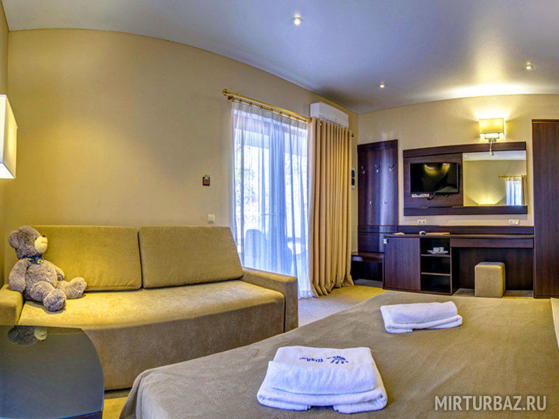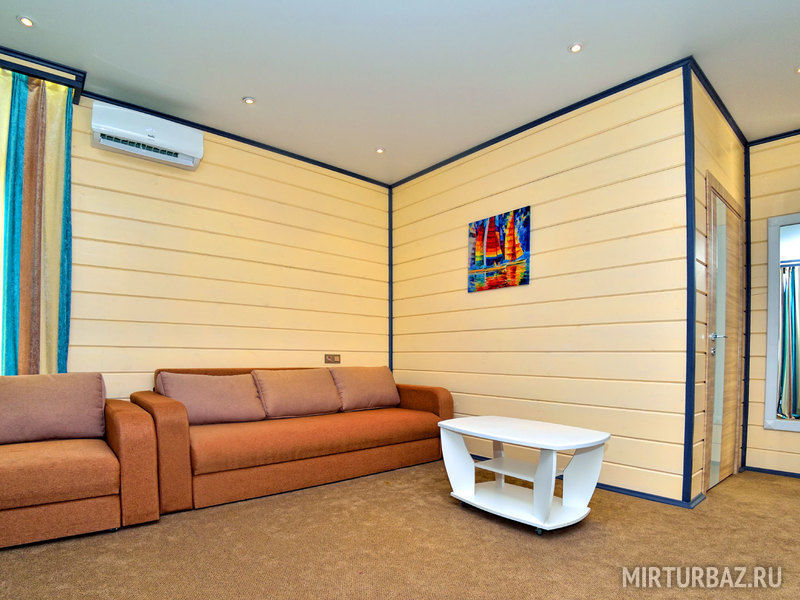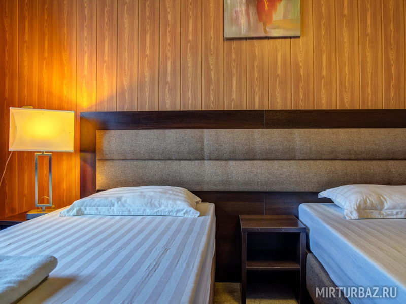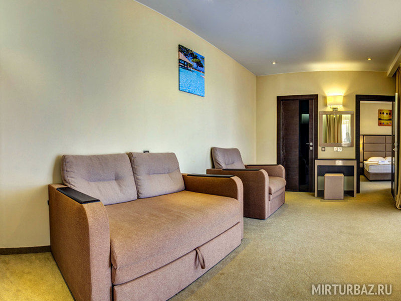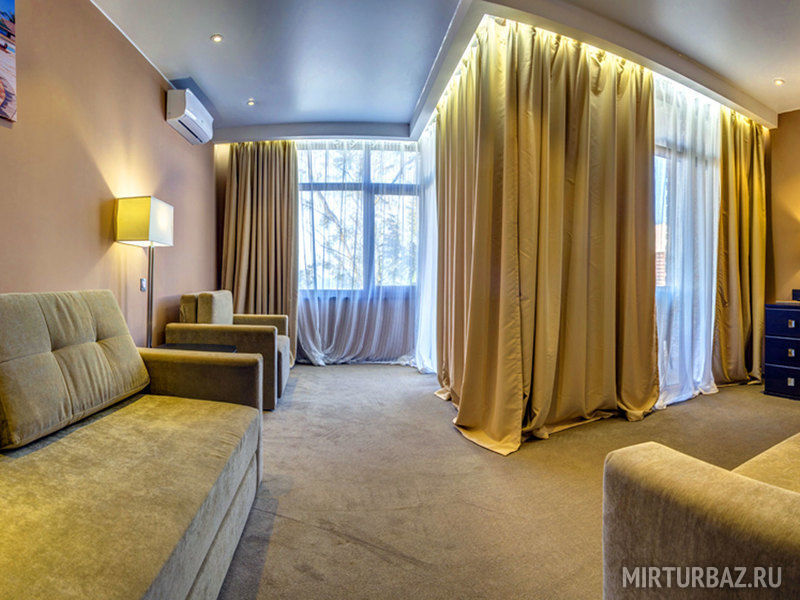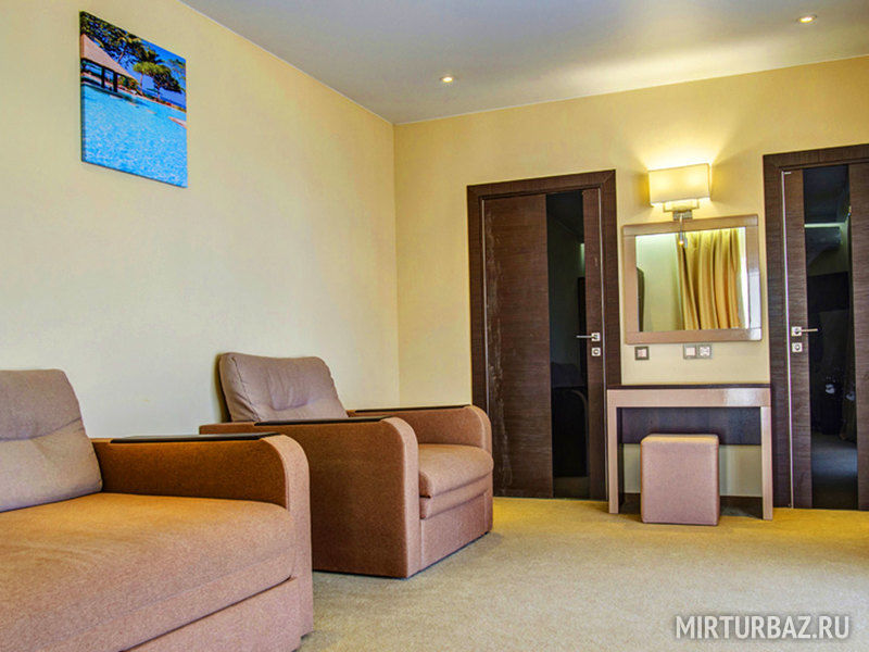 В номере есть большая двуспальная кровать в отдельной комнате, а во второй – две односпальные. Наличие холодильника, телевизора, кондиционера, шкафа, тумбочек, столика и прочих предметов, обеспечивает уютное и приятное времяпрепровождение. В отдельной ванной комнате душ, туалет, раковина, зеркало, мягкие полотенца, а также все необходимые косметические принадлежности. По желанию отдыхающих в номер могут доставить раскладной диван или детскую кроватку.