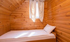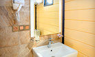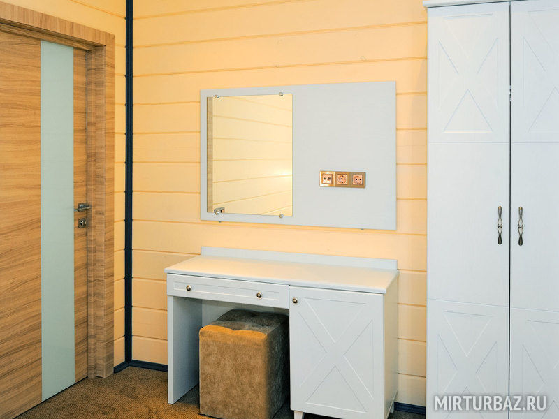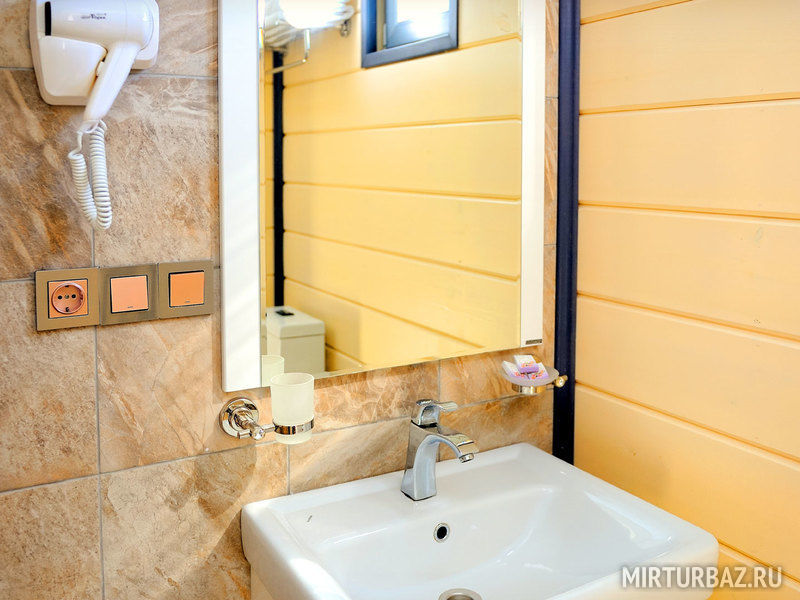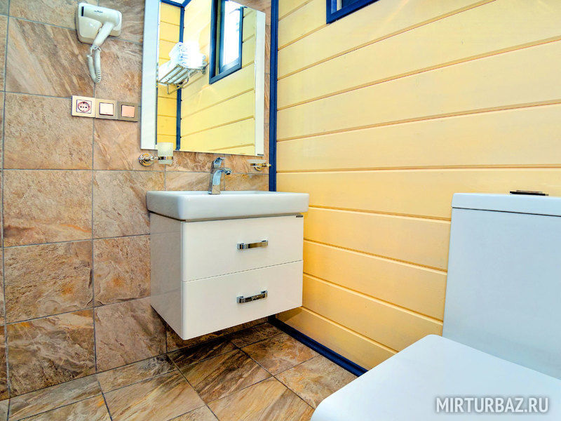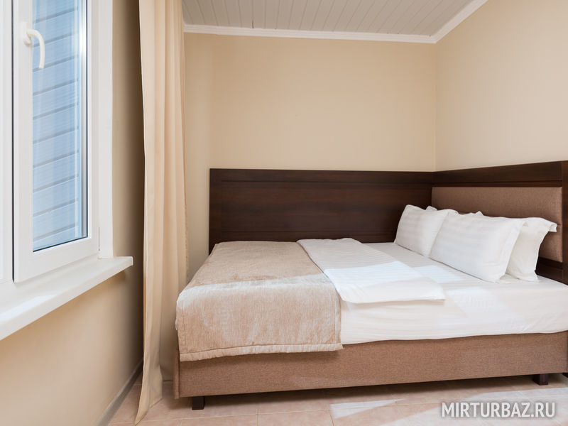 В каждом отдельно стоящем домике имеется по три номера с раздельными входами, благодаря чему вы сможете почувствовать себя максимально комфортно и уединенно. В уютной комнате площадью 13 квадратных метров есть все необходимое для приятного проживания. Одна двуспальная или две односпальные кровати, холодильник, телевизор, кондиционер и шкаф. В отдельной ванной комнате имеется душевая кабинка, туалет, раковина, зеркало, мягкие полотенца и косметические принадлежности – одним словом, все то, что нужно для ежедневного ухода за собой. При необходимости в номер можно доставить детскую кроватку, поэтому здесь с легкостью сможет разместиться семья с маленьким ребенком.