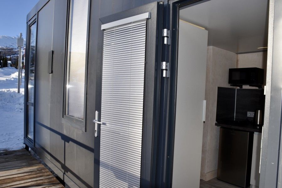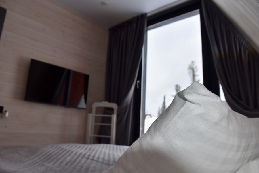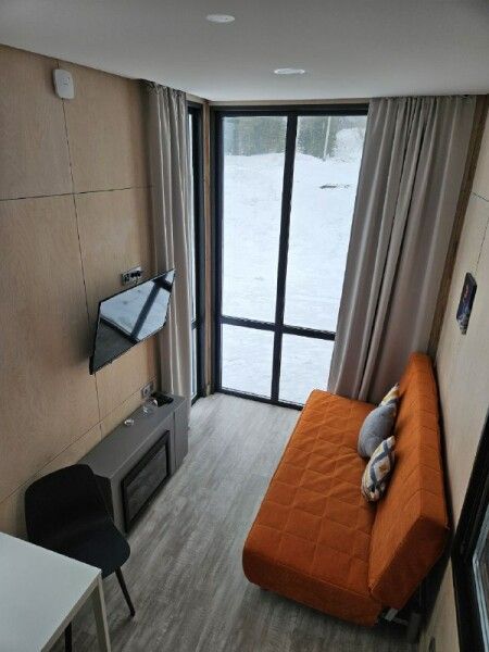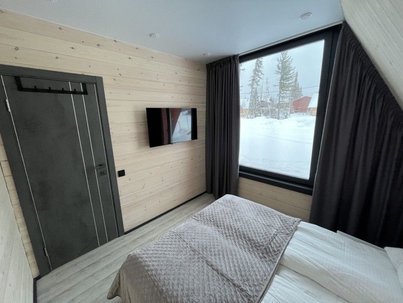 Небольшой домик площадью 25 кв м с панорамными окнами. Подходит для размещения 2-4 человек.