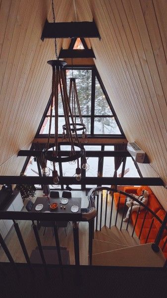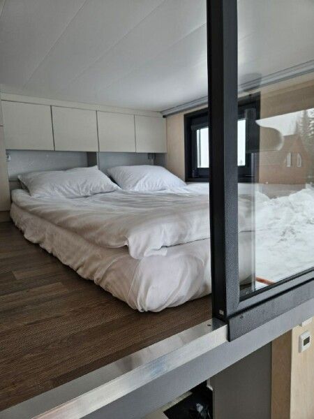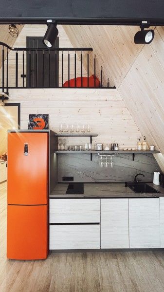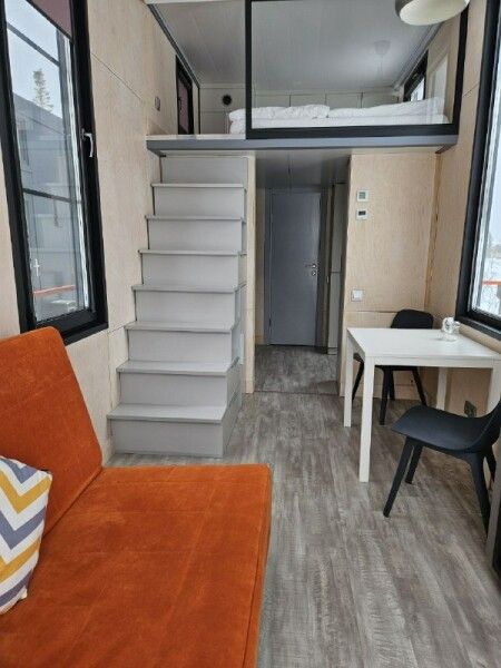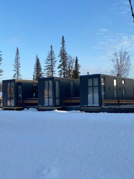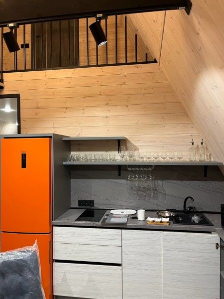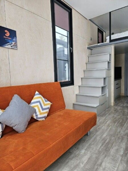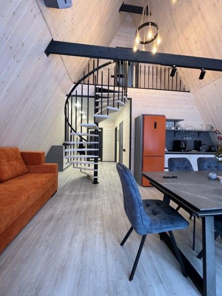 Небольшой домик площадью 25 кв м с панорамными окнами и антресолью. Подходит для размещения 2-4 человек.