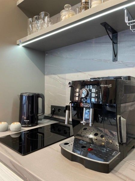 Кофемашина с зерновым кофе, чайник, тостер. Весь необходимый набор посуды до мелочей, бокалы для всех видов напитков.