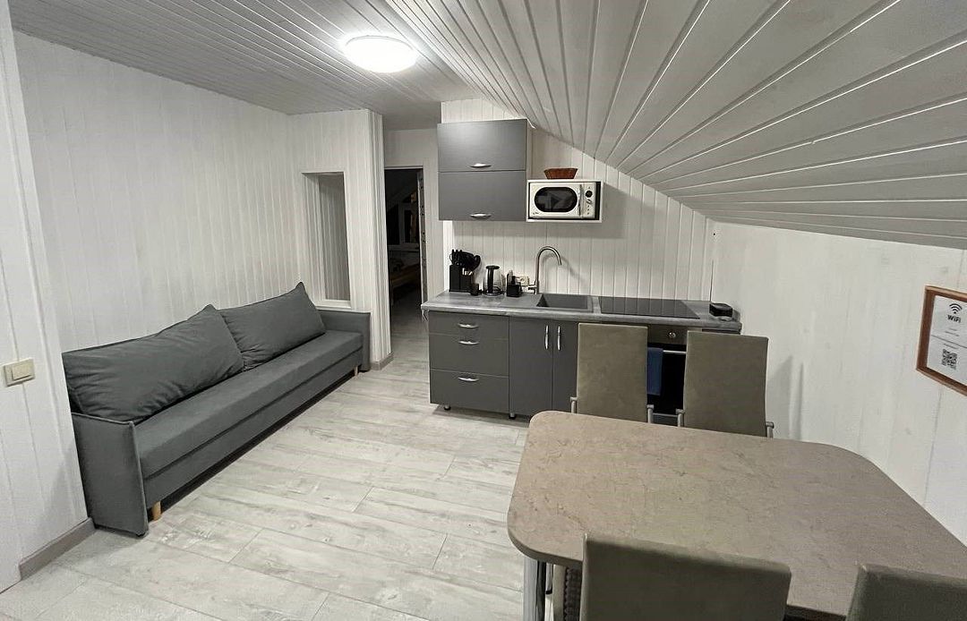 две 2-спальные кровати, раскладной диван, кухонная зона, с/у с душем