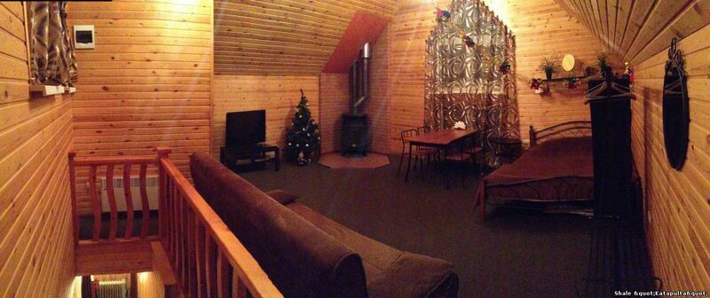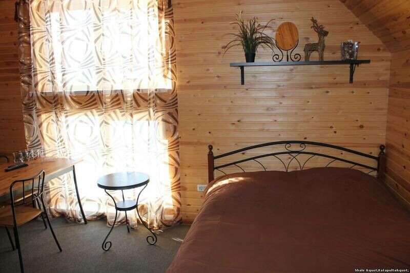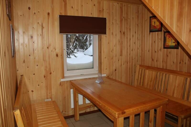 - 3 этаж - однокомнатный номер с камином 36 кв.м. с видом на гору Зеленую, ковровое покрытие пола, двуспальная кровать, диван-кровать, обеденная зона на четыре персоны, журнальный столик, телевизор, спутниковое ТВ.