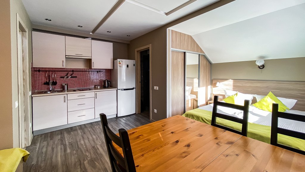 В гостевом доме два корпуса с двухместными номерами: в большом корпусе 7 номеров, в малом — 4 номера. Отдельно расположен четырехместный семейный номер-студия со встроенной кухней. Бесплатный Wi-Fi на территории поможет всегда оставаться на связи. Припарковаться можно будет на бесплатной парковке. Среди услуг для красоты и здоровья — баня на дровах с ледяной купелью. Для любителей шашлыков есть мангалы. Исключительно в летний сезон на территории гостиницы работает крытый бассейн с подогревом