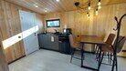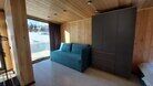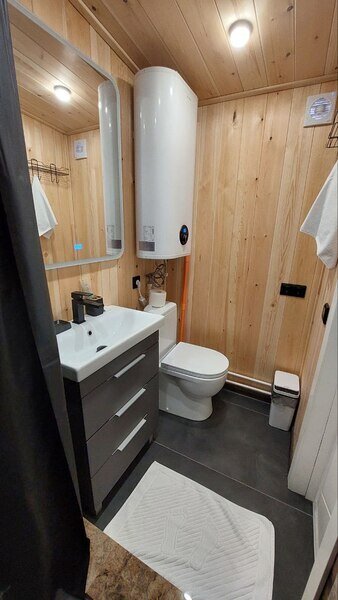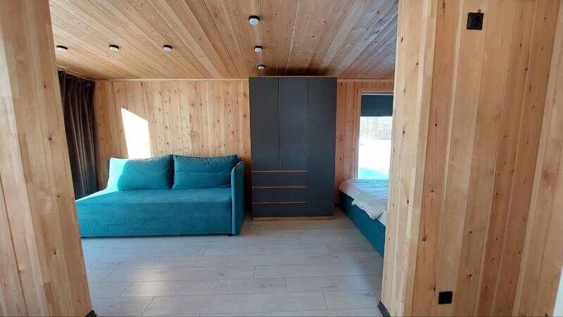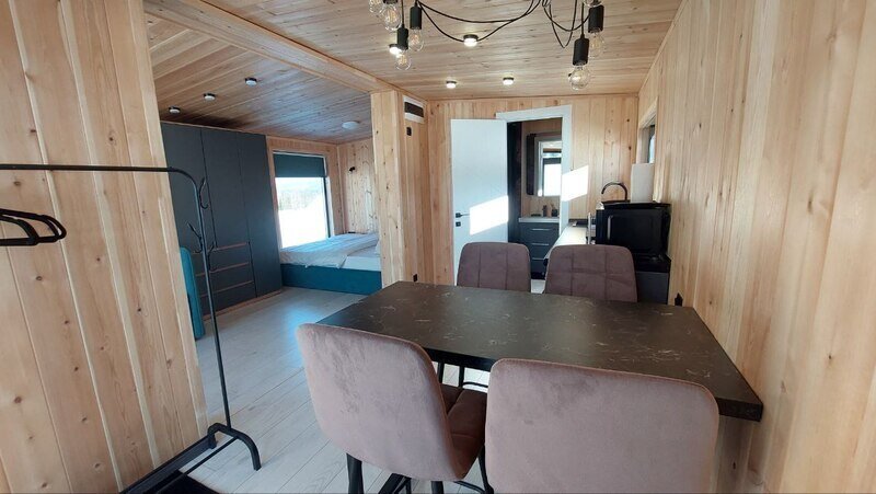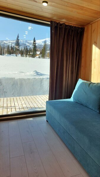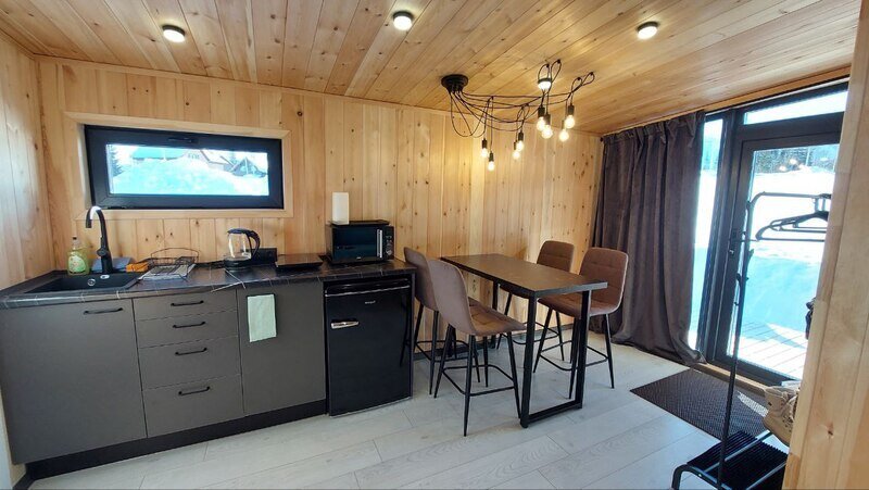 В доме имеется все необходимое для комфортного проживания. Спальное место представлено кроватью, также есть диван. Для хранения вещей установлен шкаф, а также рейл с вешалками. Собственный санузел оснащен зеркалом, душем, водонагревателем и набором полотенец. А с панорамного окна открывается красивый вид.