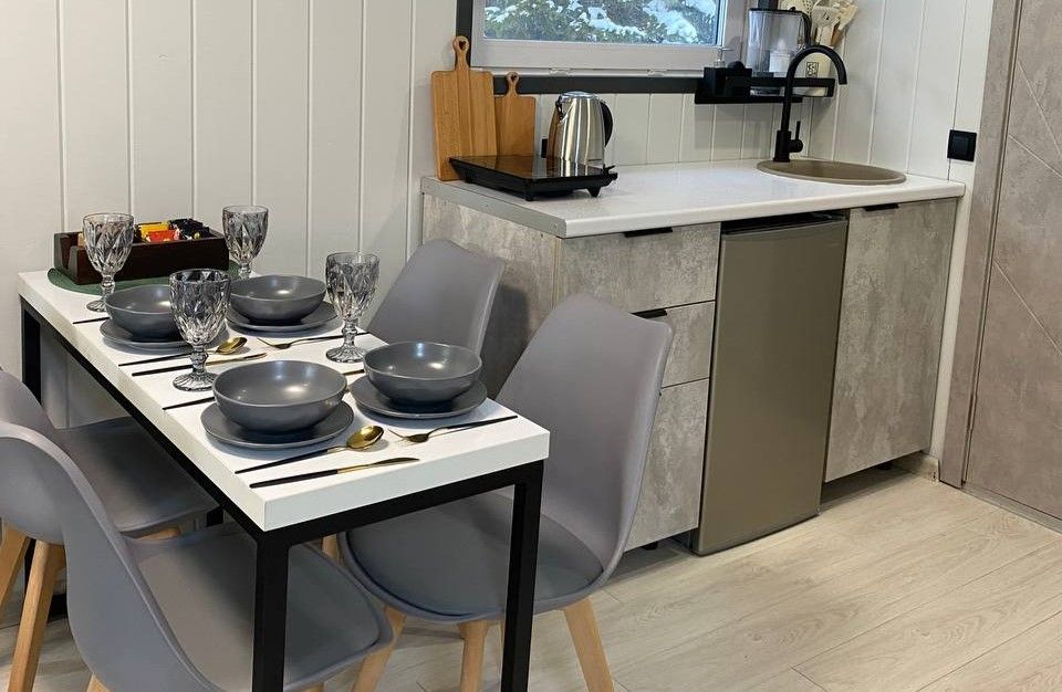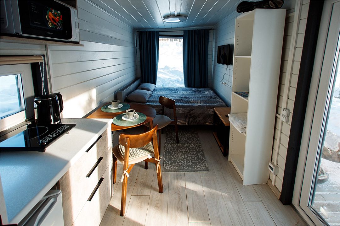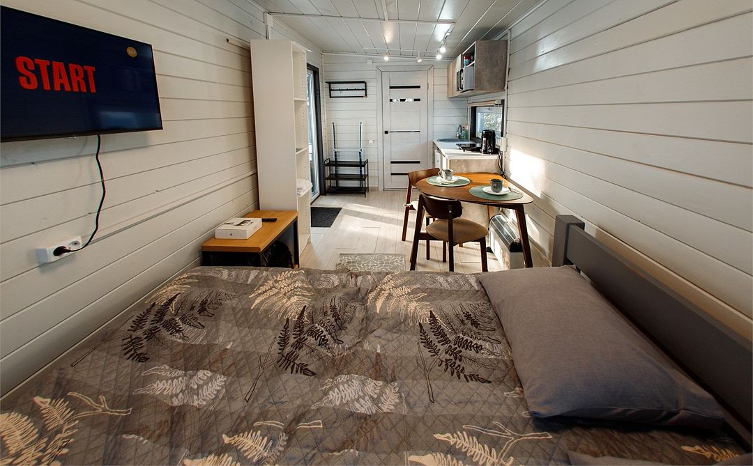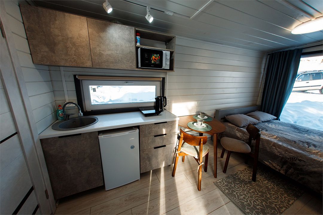 Небольшой и уютный домик на двоих человек, большая двухспальная кровать, есть место для хранения, кухонный уголок (микроволновка, чайник, электроплитка, стаканы и чашки, посуда и кухонная утварь.) Мини холодильник, обеденный стол и два стула, совмещенный санузел, новый ремонт и год постройки, большой телевизор и дважды продублированный вай фай + теплые полы позволят вам ощутить себя как дома, в любое время года!Услуги и удобства