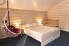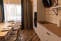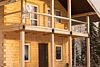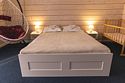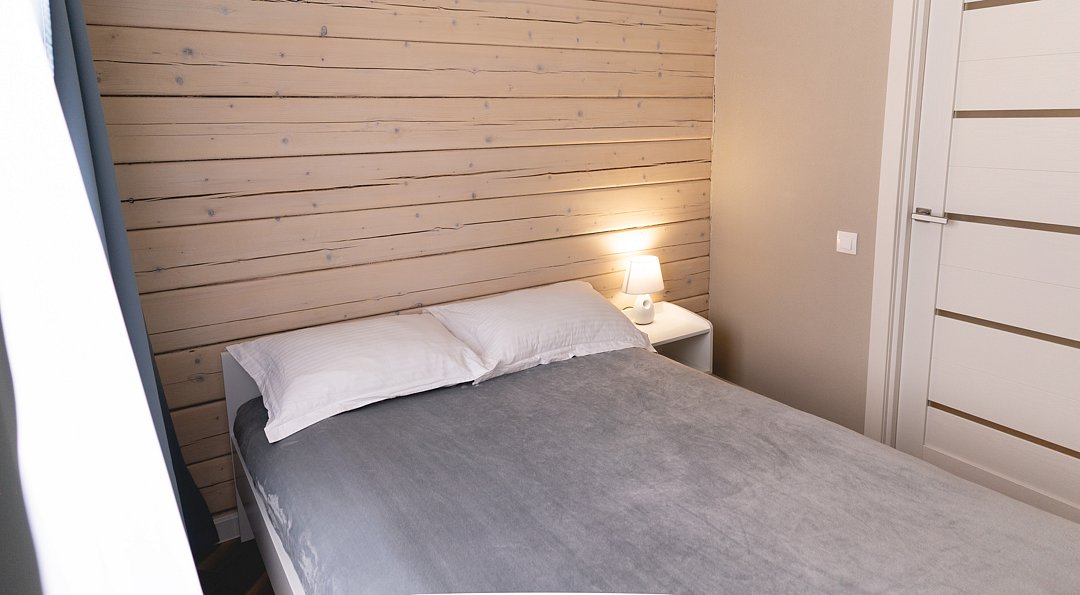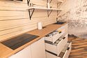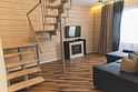 Деревянный двухэтажный гостевой дом выстроен в эко-стиле. В коттедже – 5 отдельных спален, гостиная с камином, помещение для хранения спортивного инвентаря, полноценная оборудованная кухня. Последняя оснащена всем необходимым: есть варочная панель, посудомоечная машина, холодильник, электрочайник, микроволновая печь, а также посуда и прочая кухонная утварь. В доме два санузла, в одном – душевая кабина, во втором установлена ванна. Среди прочих удобств – стиральная машина и безлимитный интернет.