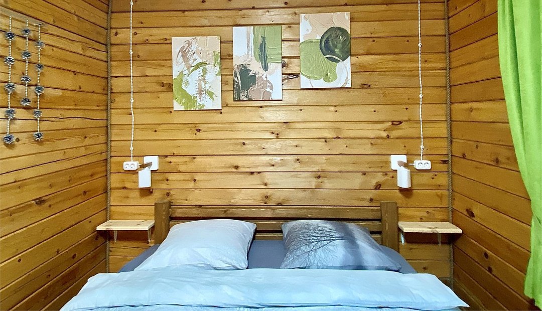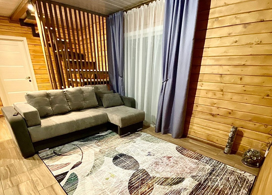 Двухэтажное здание гостевого дома, выстроенное из кедрового бруса, расположено на благоустроенной территории на Рябиновой улице. Дом рассчитан на 13 человек, внутри - шесть спален, удобная гостиная и кухня. Коттедж оснащен всей современной бытовой техникой: есть микроволновка, посудомоечная машина, холодильник, ЖК-телевизор, фен, стиральная машина.