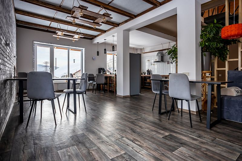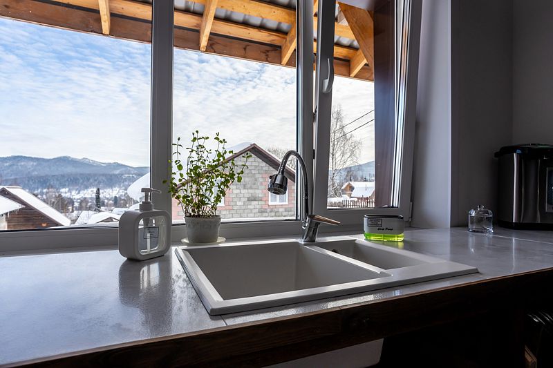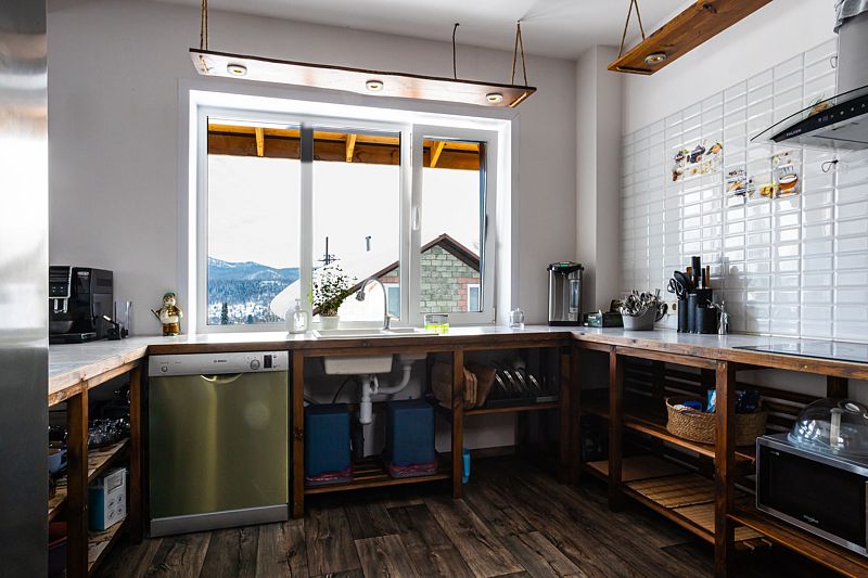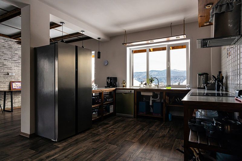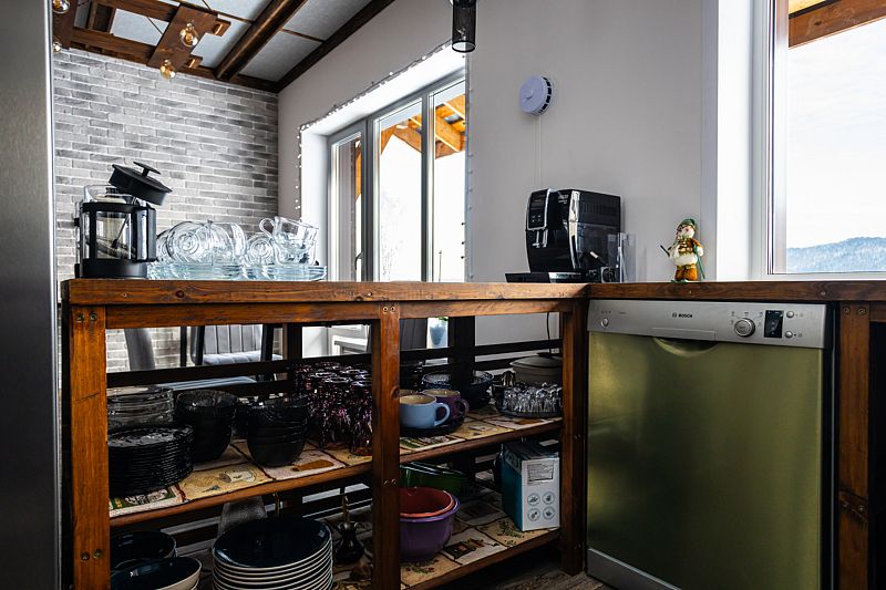 Гости проживают в комнатах, но полноценно пользуются всем имеющимся в доме. К удобству гостей большая гостиная и кухня. На кухне есть все необходимое для приготовления еды, в том числе на большую компанию. Кухонная утварь — кастрюли и сковороды, ножи, столовые приборы, тарелки, кружки, салатники, посуда для спиртных напитков и прочее необходимые предметы для организации ужина компании. Есть вместительный холодильник, плита, посудомоечная машина, электрочайник, микроволновка, кофемашина.