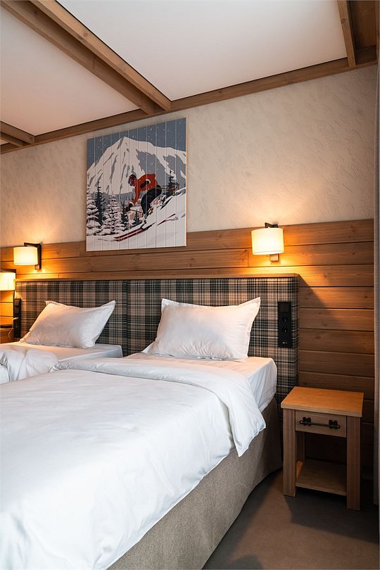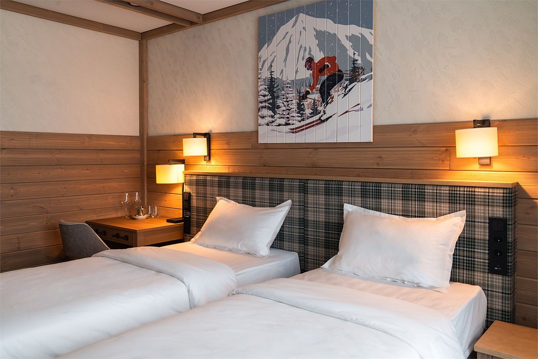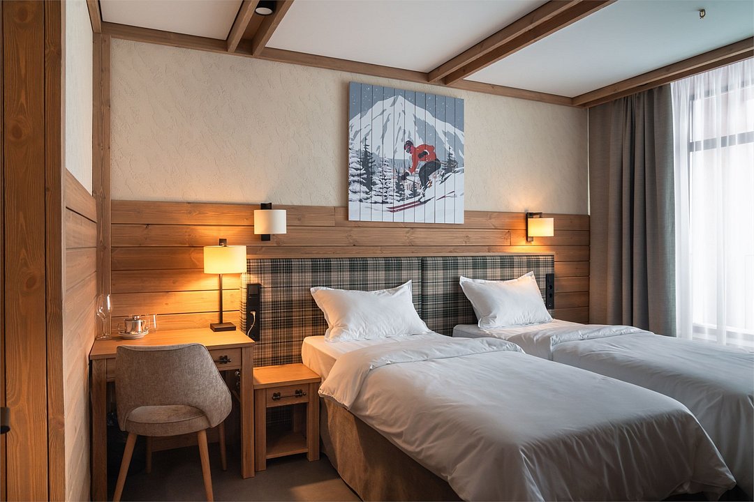 Номер категории «Стандарт с 2 односпальными кроватями» — это практичное пространство, созданное для комфортного отдыха в компании друзей или коллег. Тёплый интерьер с мягкими акцентами и элементами натурального дерева помогает восстановить силы после насыщенного дня. Вас ждут две удобные раздельные кровати, отдельная ванная комната, панорамное окно с видом на живописную природу Шерегеша и балкон. Этот вариант идеально подойдёт тем, кто ценит практичность, уют и функциональность, а также возможность комфортного размещения для двух человек с сохранением личного пространства.Услуги и удобства