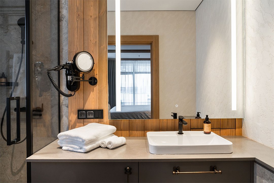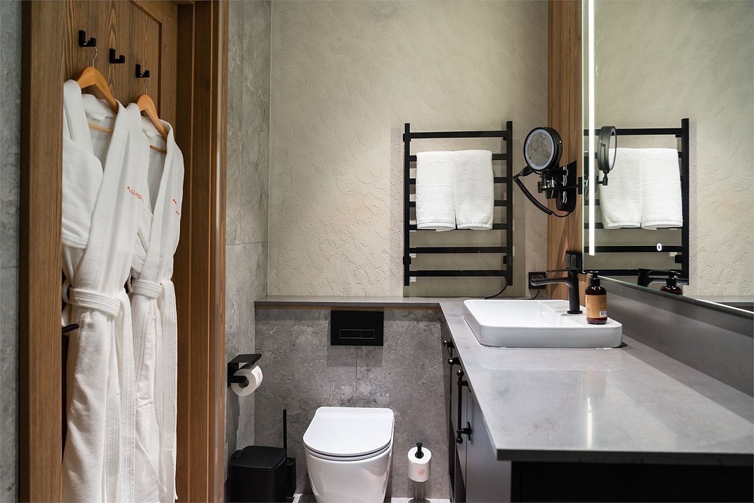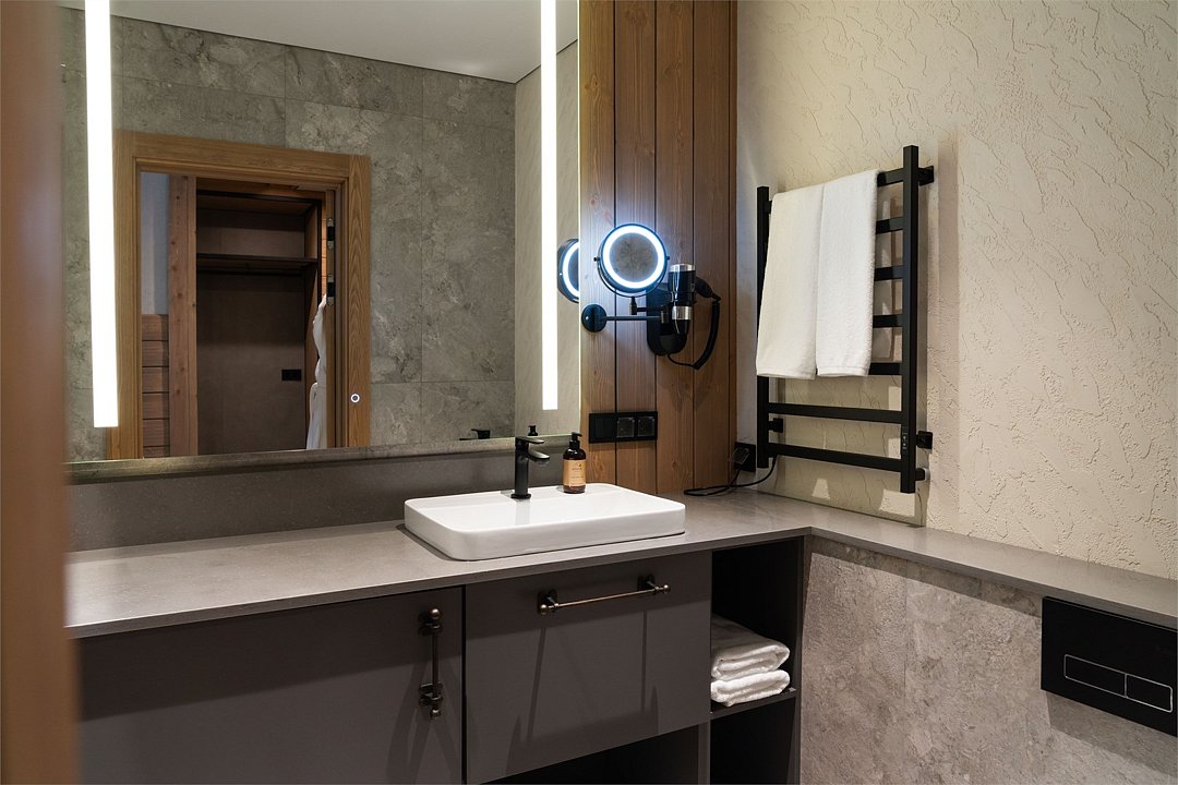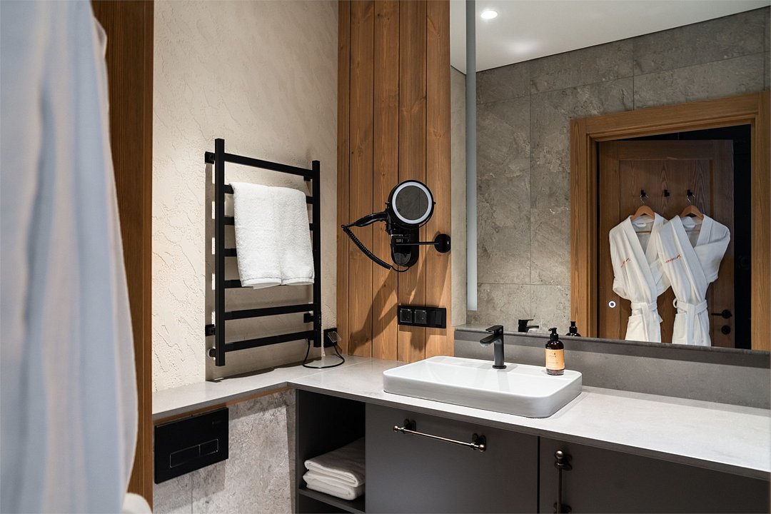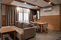 Просторный номер, объединяющий две категории — комфортный «Люкс» и уютный «Стандарт». Они соединены дополнительной межкомнатной дверью для вашего удобства. Вас ждут две отдельные спальни с кроватями King Size и балконами, две ванные комнаты, полноценная кухня и элегантная гостиная зона. Гарантию хорошего сна обеспечат шторы blackout. Панорамные окна открывают захватывающие виды на природу Горной Шории, а интерьер в благородных древесных тонах создаёт атмосферу уединения, спокойствия и солидности. Это выбор для тех, кто ценит личное пространство, роскошь деталей и возможность провести время вместе, не отказывая себе ни в чём.Услуги и удобства