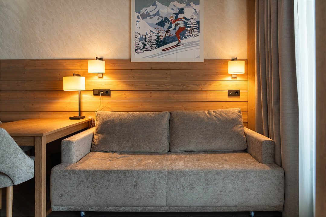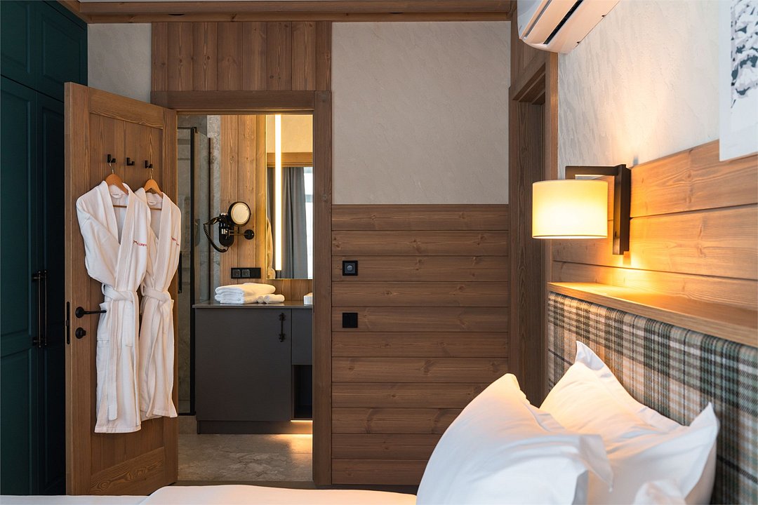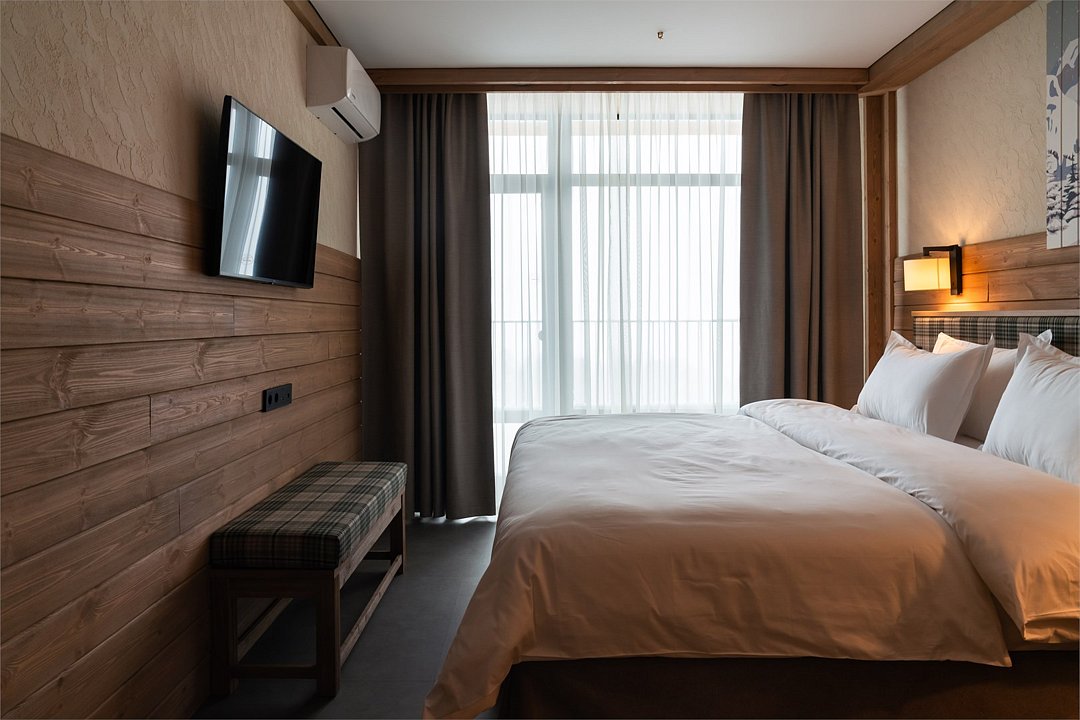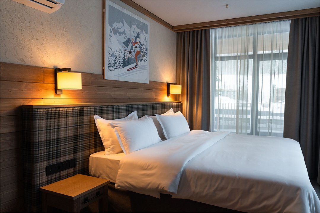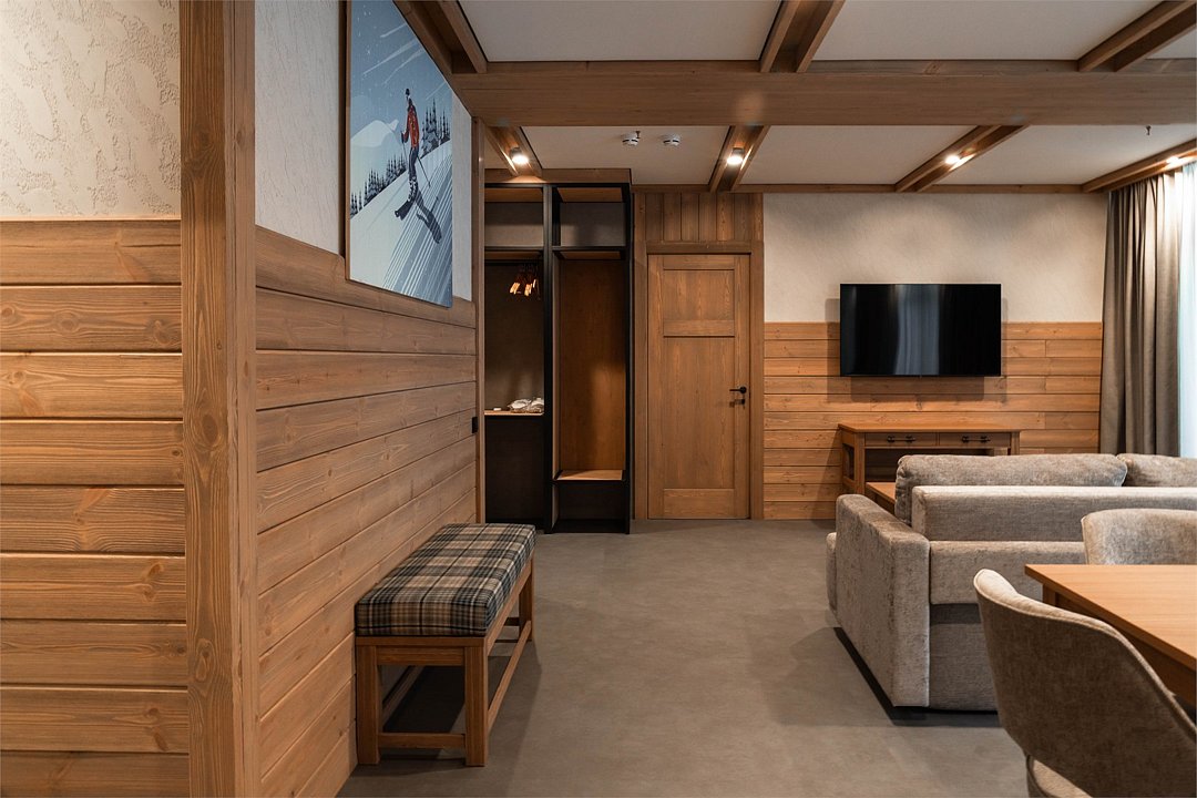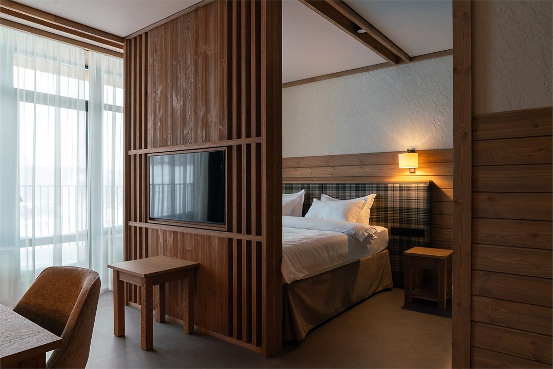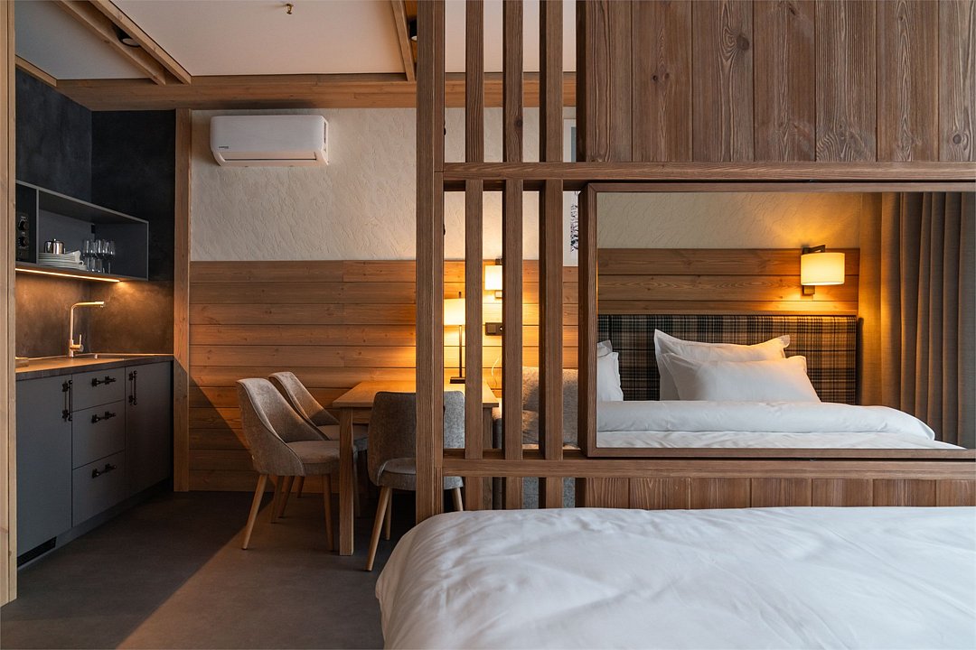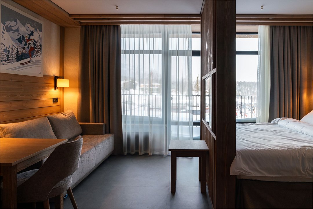 Номер категории «Полулюкс» — уютное и практичное пространство для отдыха вдвоём или небольшой семьи. Здесь есть всё необходимое для комфортного проживания: уютная гостиная, компактная кухня и изолированная спальня с двуспальной кроватью и выходом на балкон. Тёплая цветовая гамма с акцентами из натурального дерева создаёт ощущение домашнего тепла и помогает по-настоящему расслабиться после насыщенного дня на горнолыжном курорте. Шторы blackout обеспечат хороший сон.Услуги и удобства