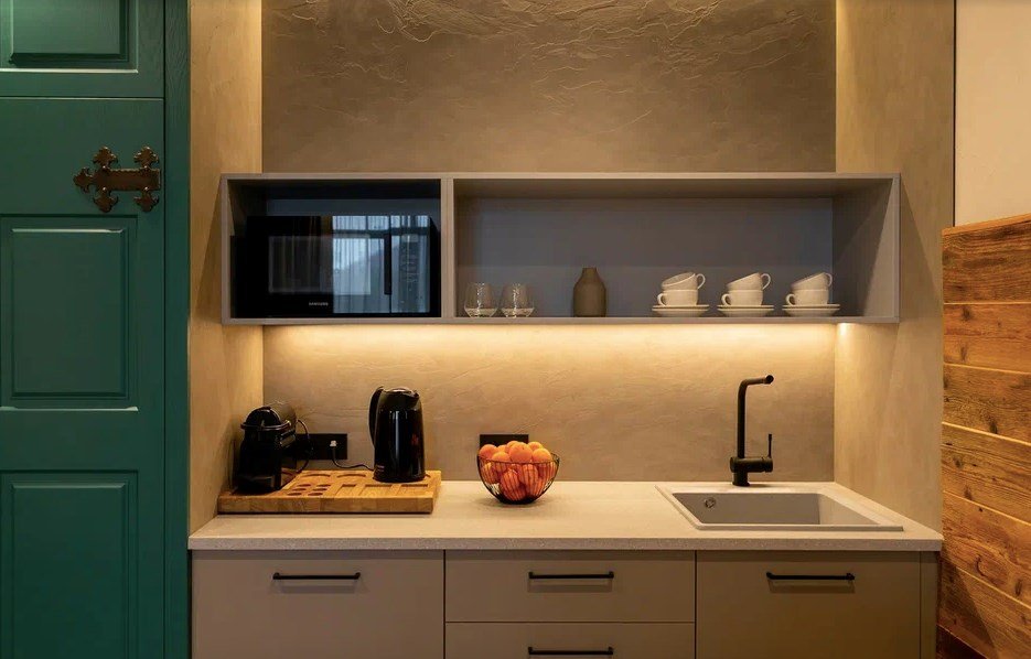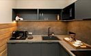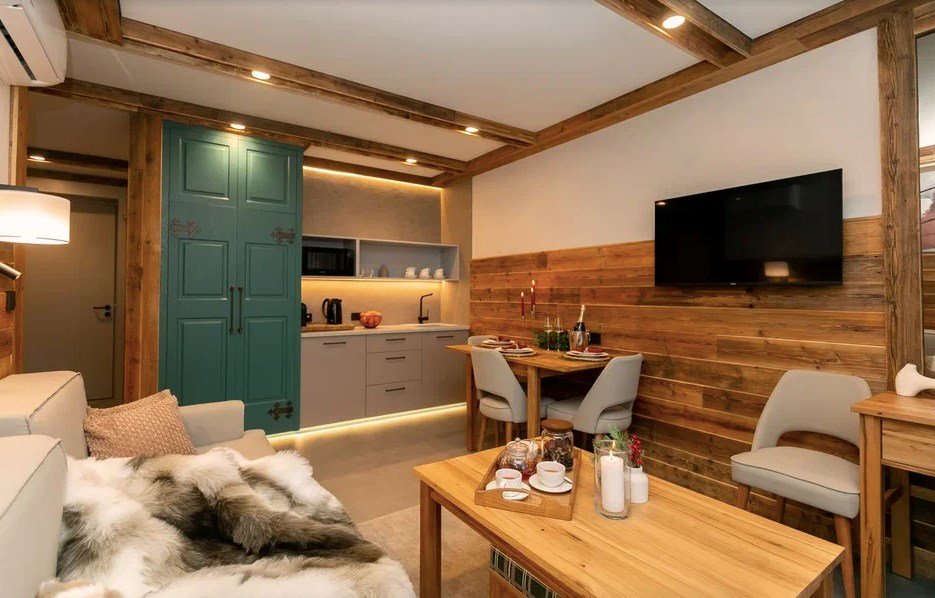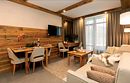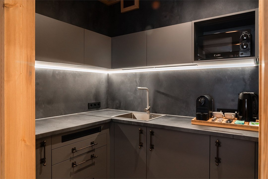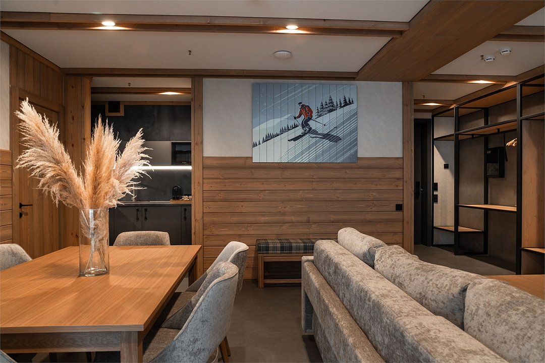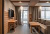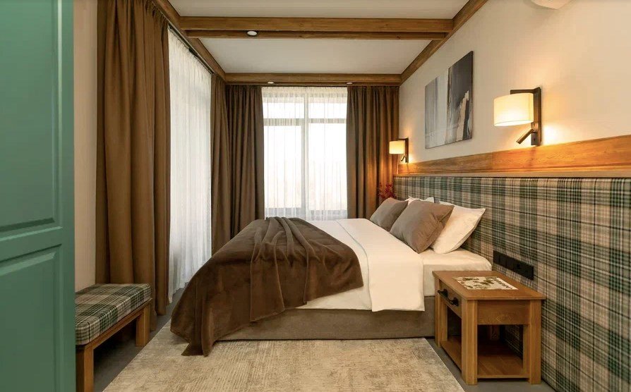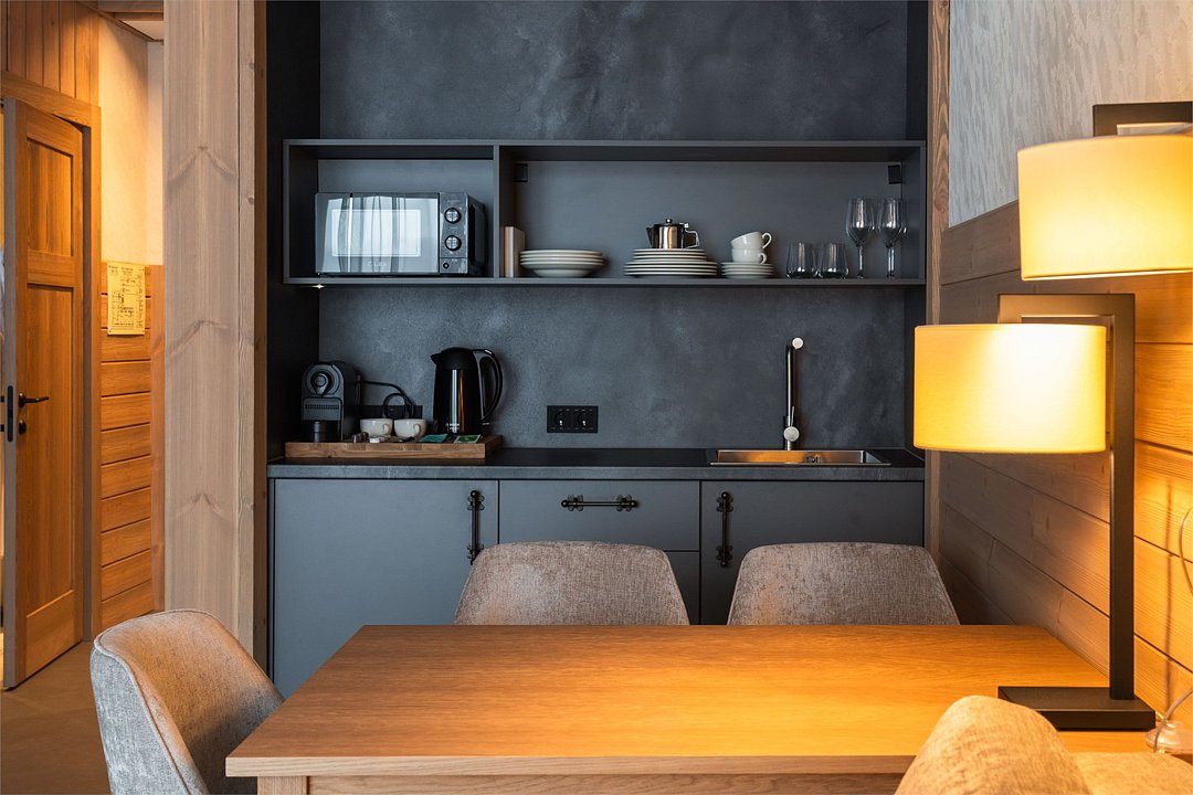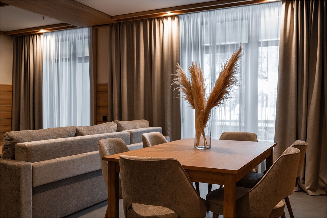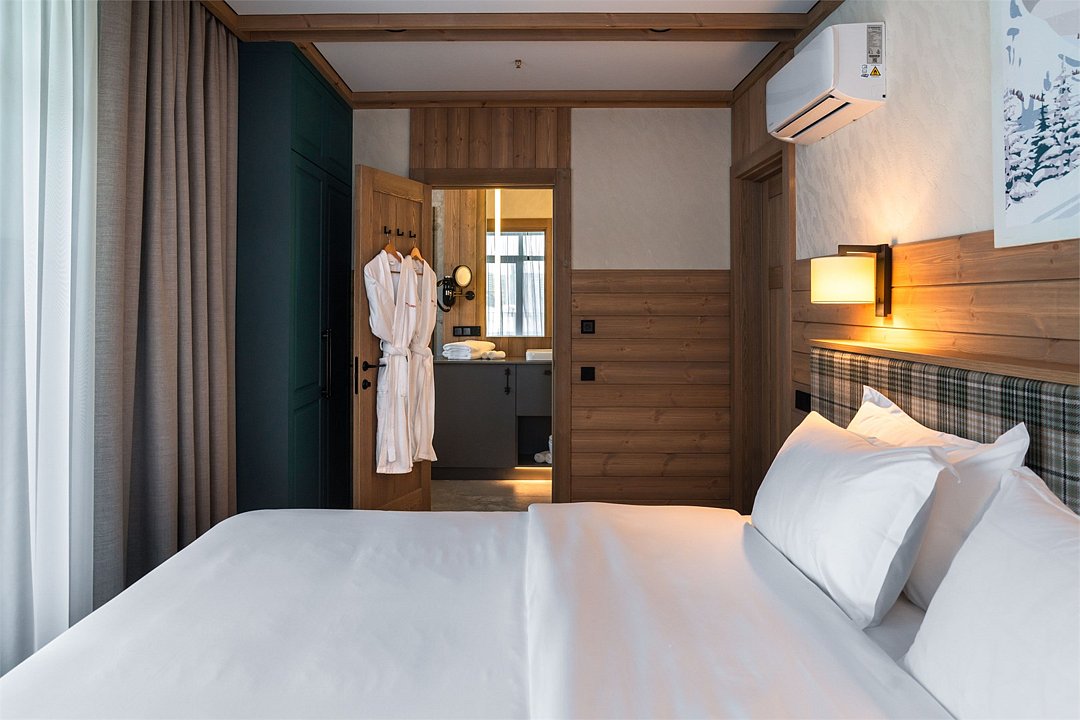 Номер категории «Полулюкс» — уютное и практичное пространство для отдыха вдвоём или небольшой семьи. Здесь есть всё необходимое для комфортного проживания: уютная гостиная, компактная кухня и изолированная спальня с двуспальной кроватью и выходом на балкон. Тёплая цветовая гамма с акцентами из натурального дерева создаёт ощущение домашнего тепла и помогает по-настоящему расслабиться после насыщенного дня на горнолыжном курорте. Шторы blackout обеспечат хороший сон.Услуги и удобства