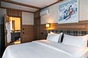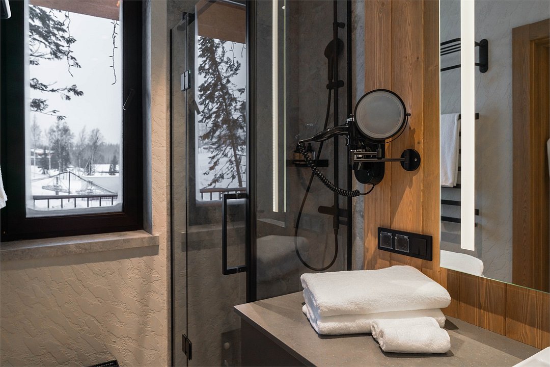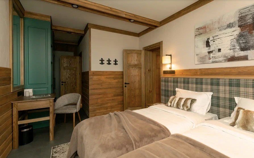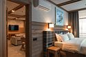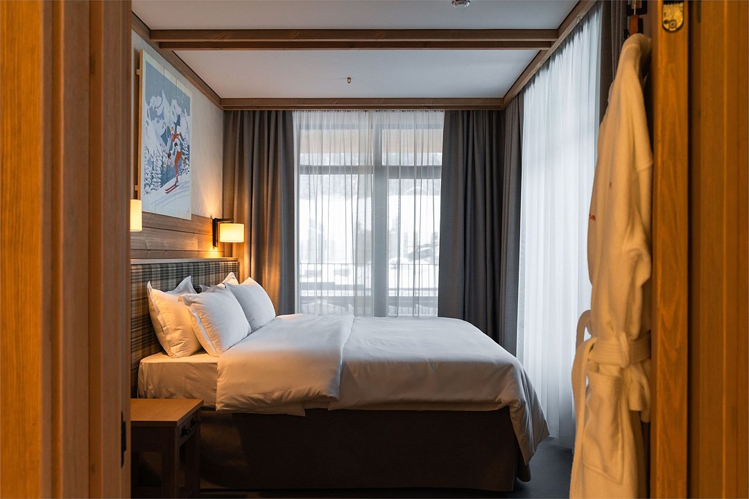 Номер, объединённый из двух номеров категории «Стандарт» и оснащённый дополнительной межкомнатной дверью, станет отличным выбором для семей или компании друзей. Тёплый интерьер в спокойных тонах с элементами натурального дерева, шторами blackout создаёт атмосферу уюта и помогает отдохнуть после активного дня. Вас ждут две отдельные спальни с двуспальными кроватями King Size и две ванные комнаты. Из панорамных окон и балконов открывается прекрасный вид на природу Шерегеша. Этот вариант отлично подходит для тех, кто ценит практичность, уют и возможность комфортного отдыха для всей компании в одном пространстве.Услуги и удобства