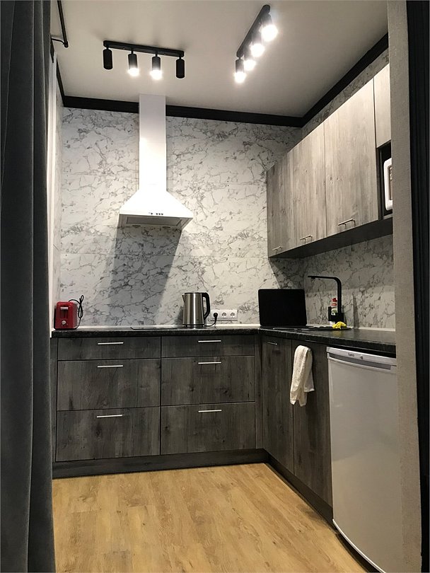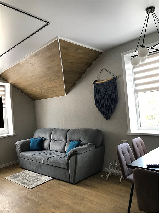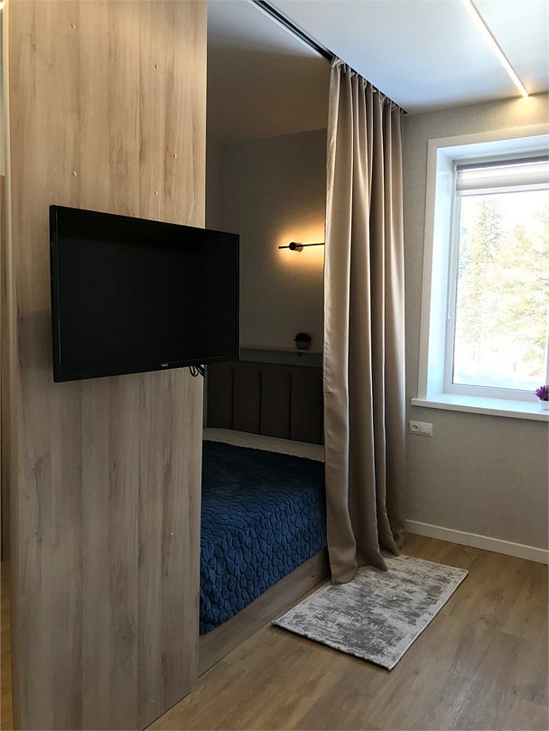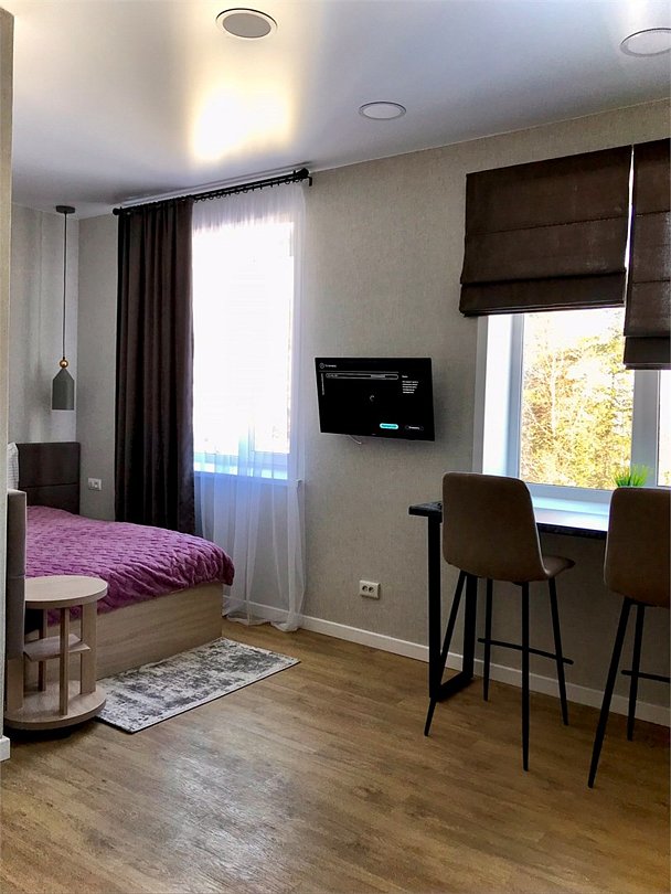 телевизор, кабельное телевидение, Wi-Fi, фен, плита для приготовления пищи, микроволновая печь, душевая кабина, санузел, теплый пол, двуспальная кровать, тумбы, стулья, шкаф для одежды, обеденный стол, зеркало, чайник, унитаз, раковина, кухонная посуда, стаканы, столовые приборы, туалетные средства, сушилка для белья, цифровое тв, мини-холодильник, мини-кухня, теплые полы, вид на лес, вешалки-плечики, мыло, затемняющая штора, не раскладной диванВ апартаментах