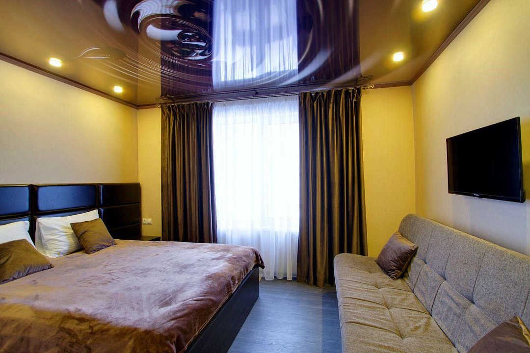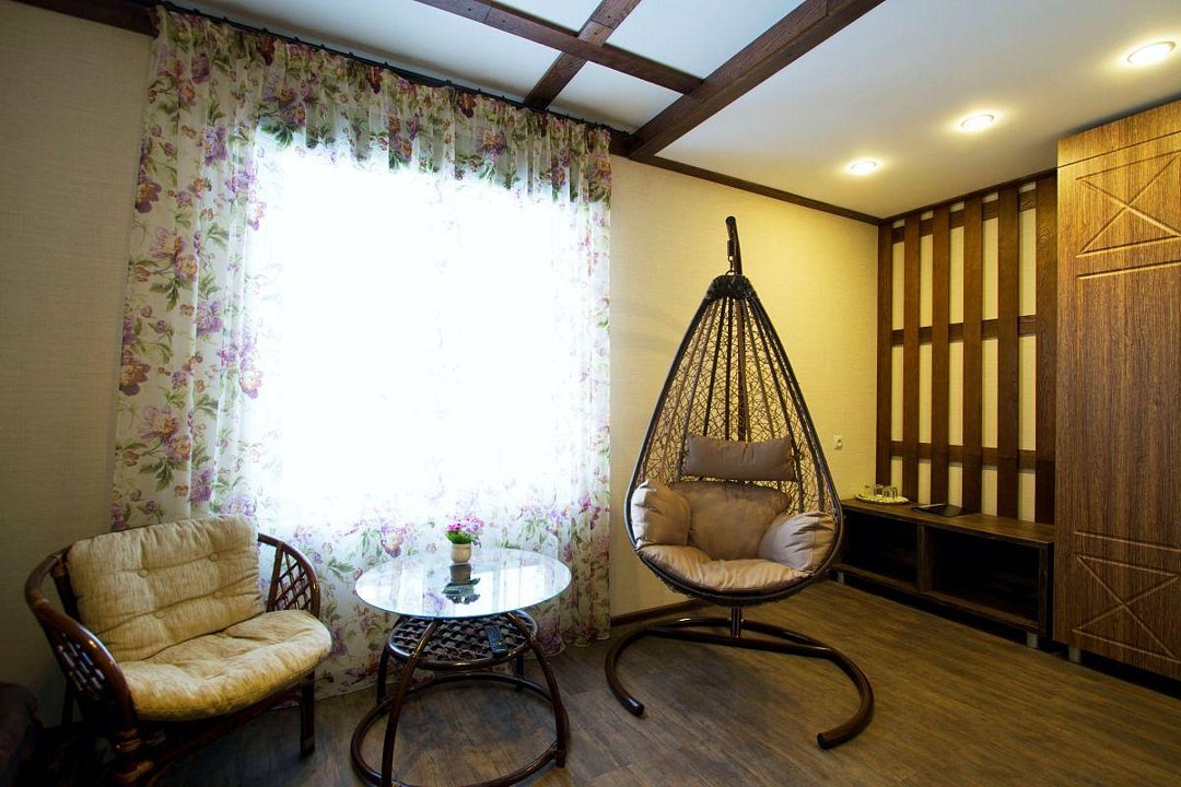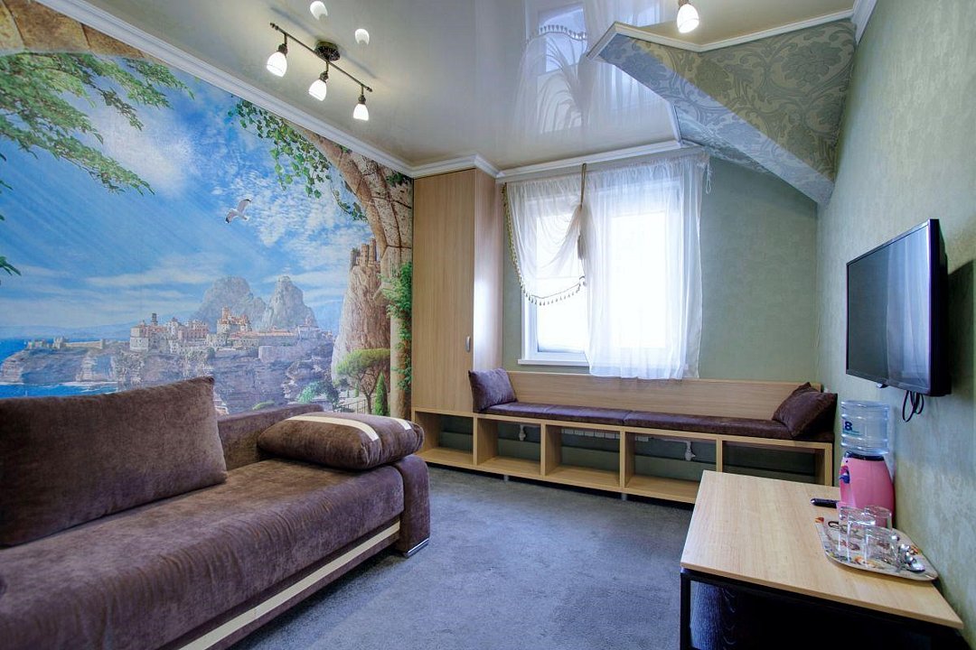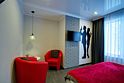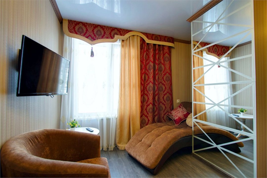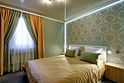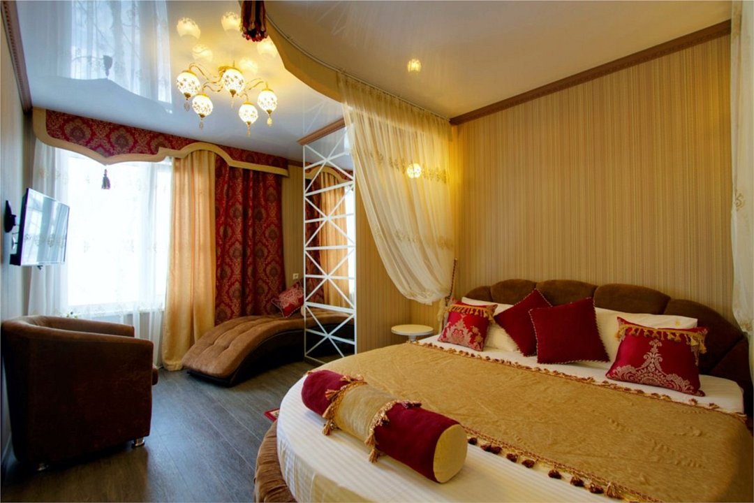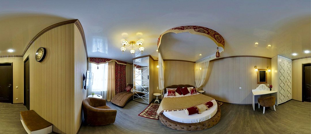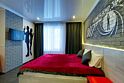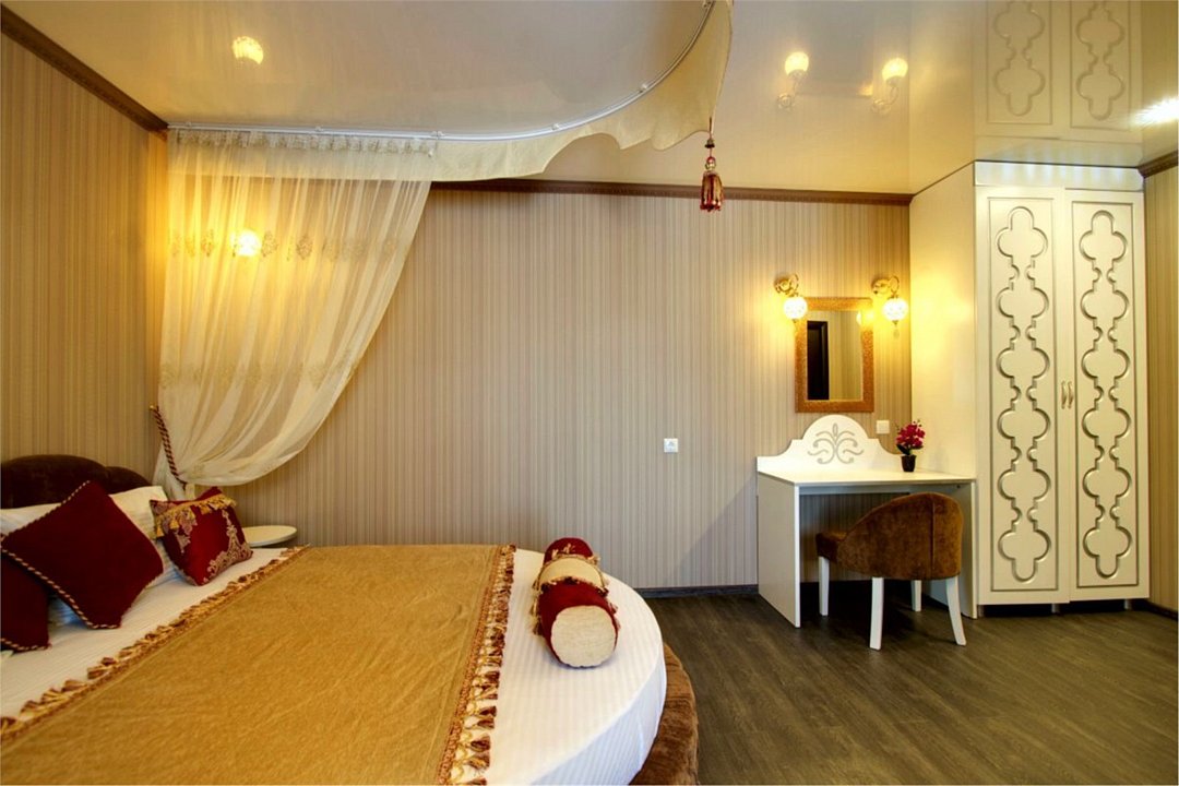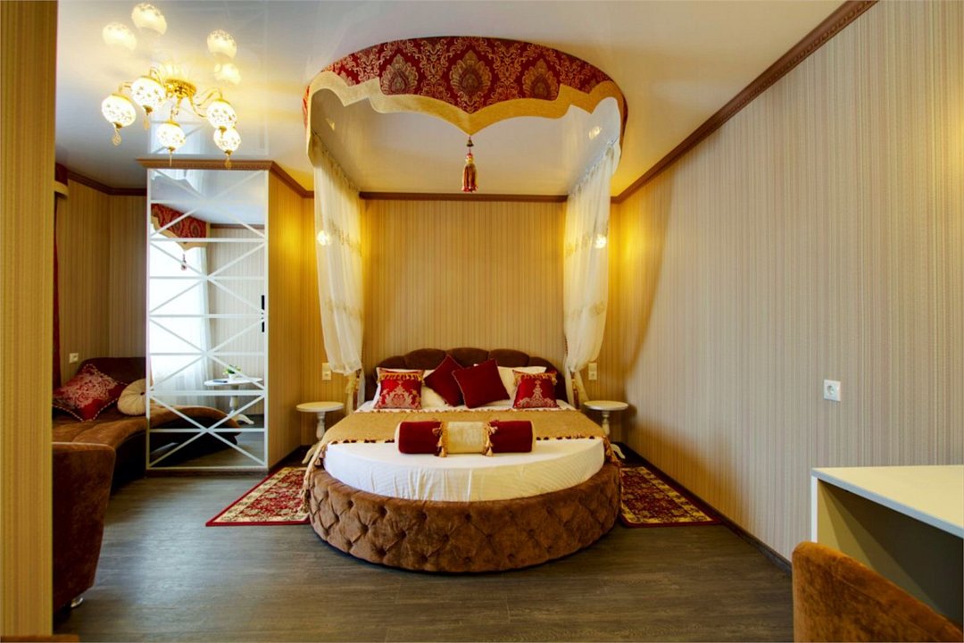 Площадь номера 20 кв.м. Санузел 4 кв.м. Находится на 2 этаже. В номере имеется большая круглая двуспальная кровать с ортопедическим матрасом, 2 тумбочки, шкаф для одежды, пуфик ,столик, туалетный столик, кресло удлиненное. ЖК телевизор, мини холодильник, сейф. В санузле: раковина, унитаз, фен, комплект полотенец, шампунь, кондиционер, гель для душа.Услуги и удобства