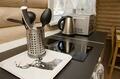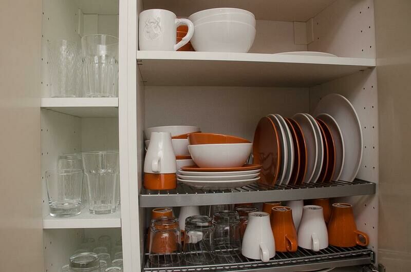 Кухонная зона оборудована для самостоятельного приготовления пищи: электроплита, духовка, микроволновая печь, холодильник, электрочайник, полный набор посуды, бокалы, столовые приборы.