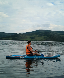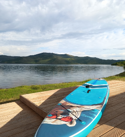 В глэмпинге имеется прокат сап-бордов, можно самостоятельно исследовать залив. В арендный комплект входит сап-борд 335 см, спасательный жилет, весло, страховка.