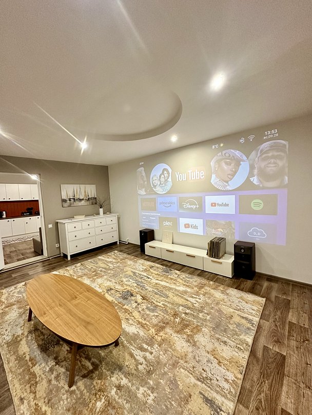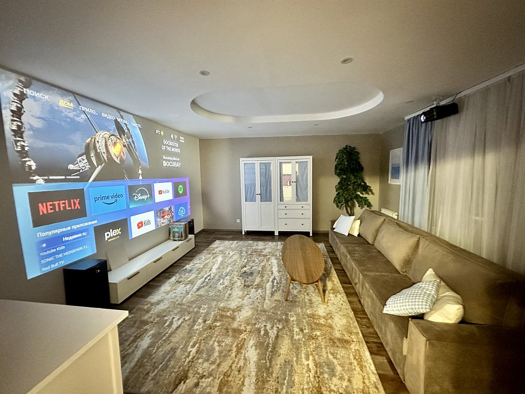 Домашний кинотеатр: Любимый вечерний ритуал гостей — просмотр фильмов на большом экране с кинопроектором и качественным звуком.