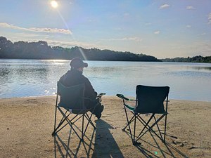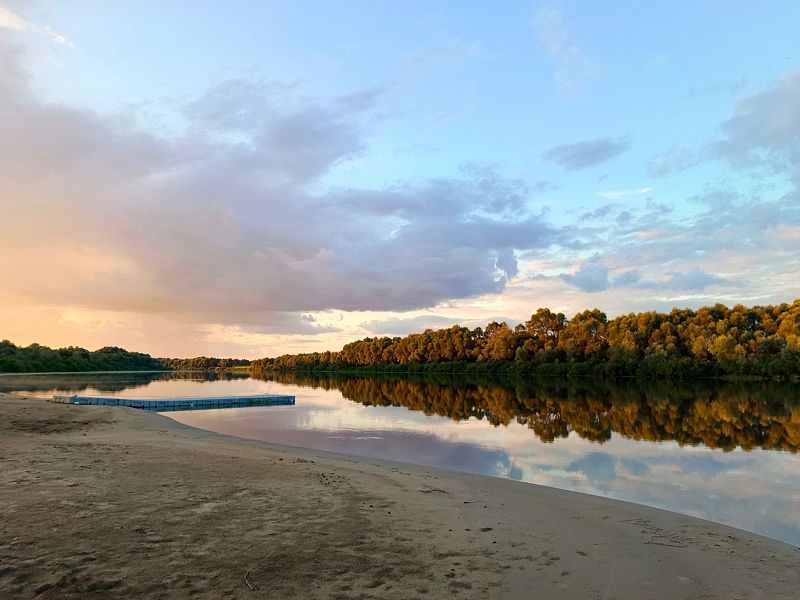 Чистая голубая вода, нежный речной песок и прекрасное чистое пологое дно реки встречают гостей базы.