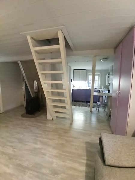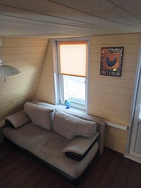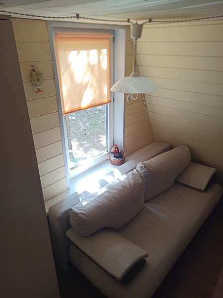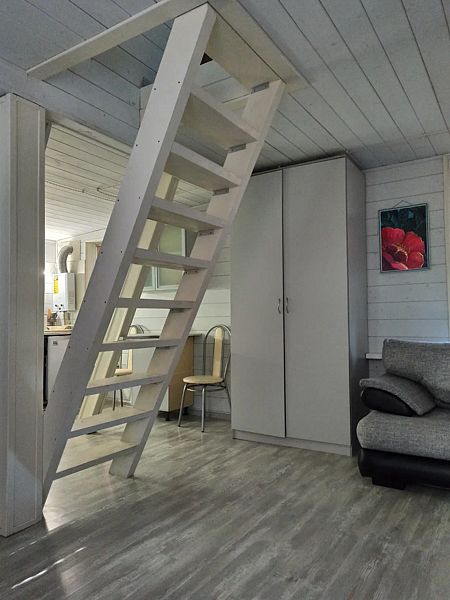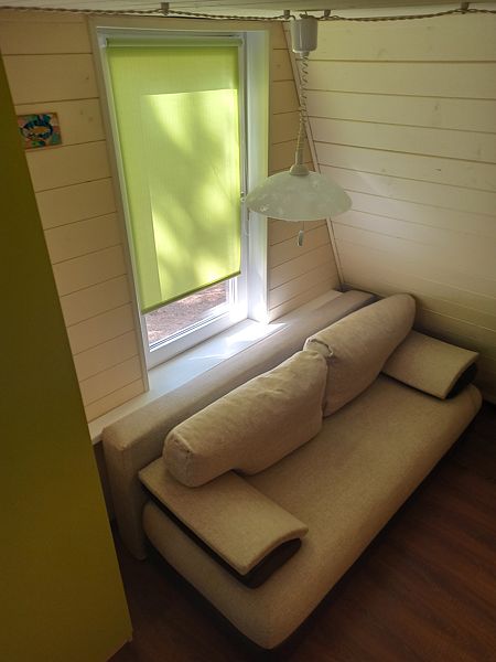 На второй этаж ведет лестница, здесь расположено одно спальное место 120*200 и раскладывающийся вперед диван 120*200.
