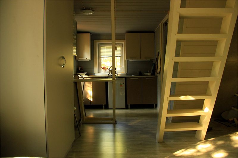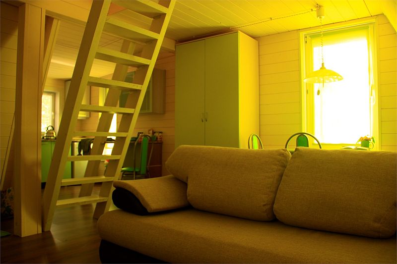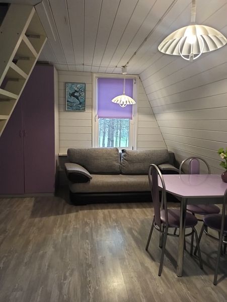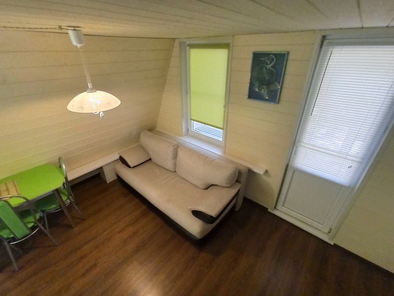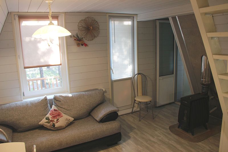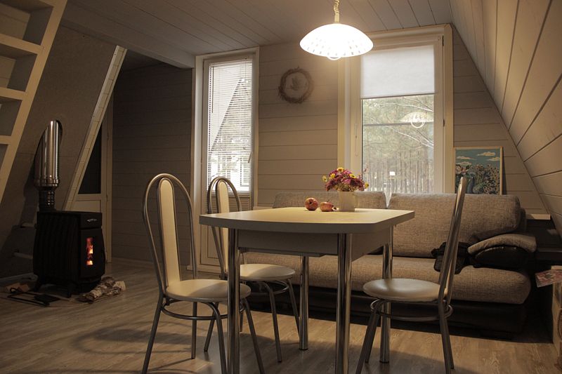 В каждом домике есть небольшая прихожая, на первом этаже расположена гостиная-столовая, в ней два раскладывающихся дивана с двумя спальными местами 140*200 см, обеденный стол, 6 стульев, платяной шкаф, кухонный гарнитур с мойкой, газовой плитой, посуда для приготовления пищи и сервировки, холодильник.