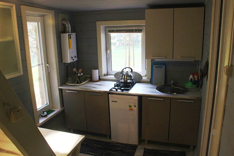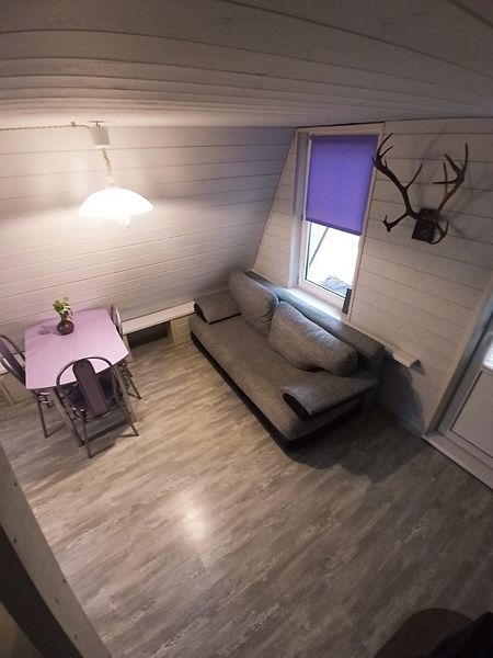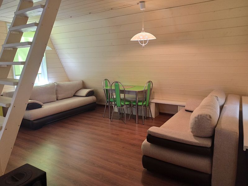 В каждом домике есть небольшая прихожая, на первом этаже расположена гостиная-столовая, в ней два раскладывающихся дивана с двумя спальными местами 140*200 см, обеденный стол, 6 стульев, платяной шкаф, кухонный гарнитур с мойкой, газовой плитой, с посудой для приготовления пищи и сервировки, холодильник.