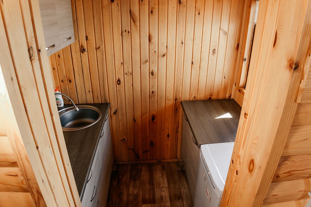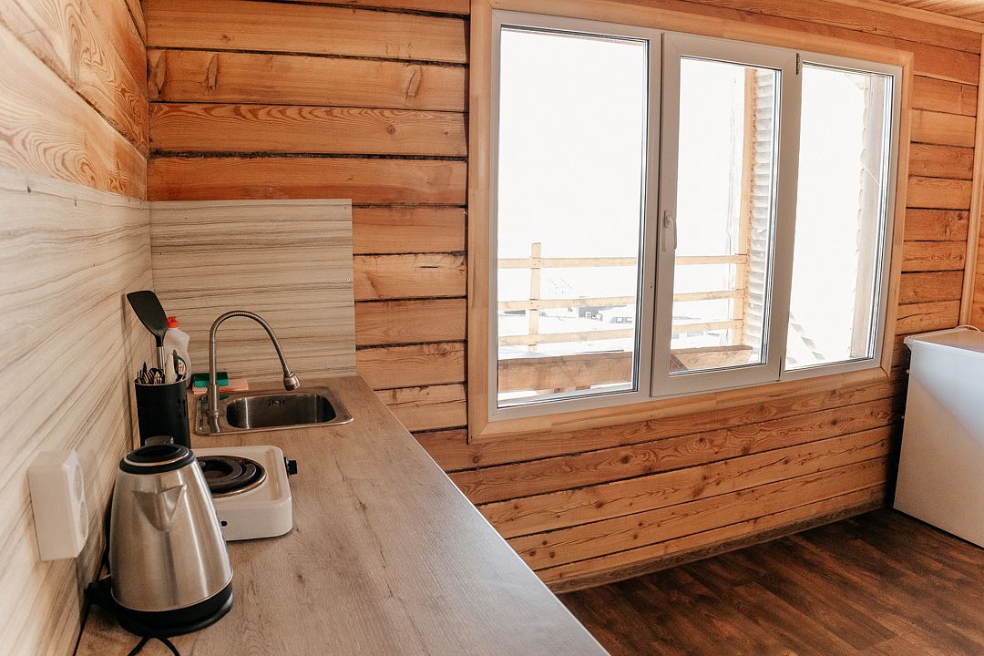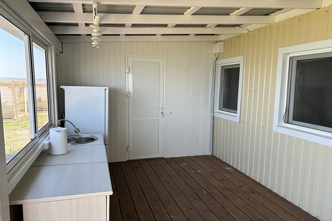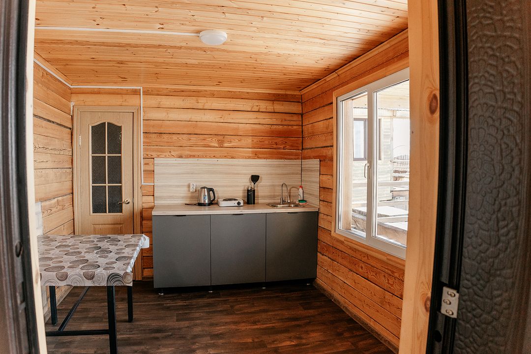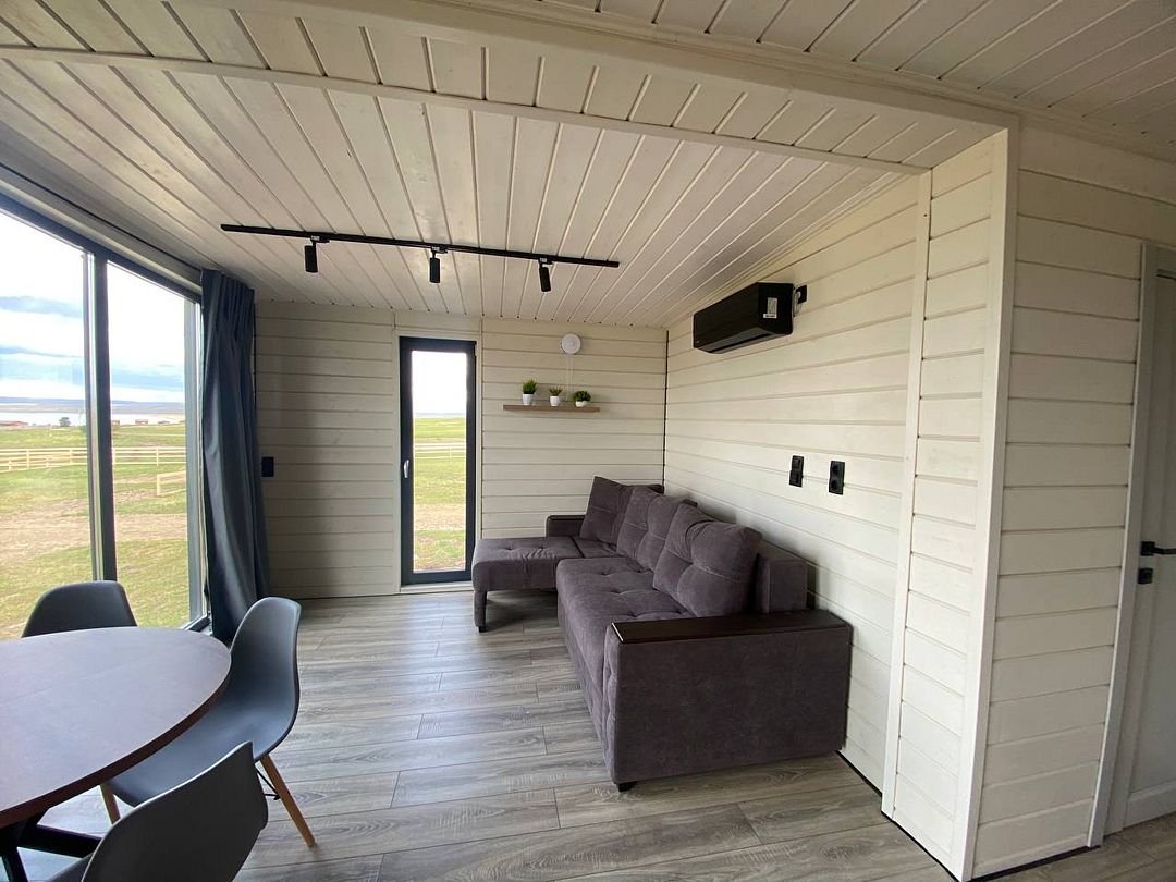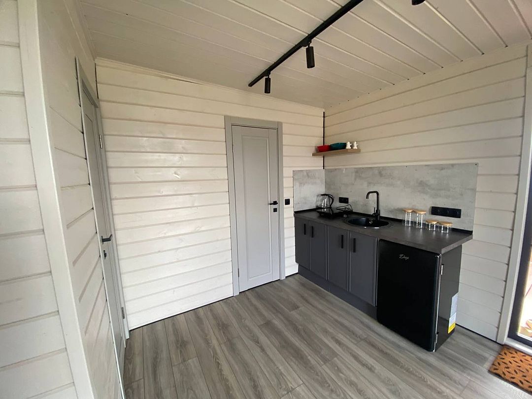 В гостиной оборудована кухня с встроенным холодильником, индукционной плитой и большой зоной готовки. Кондиционера в домике нет.