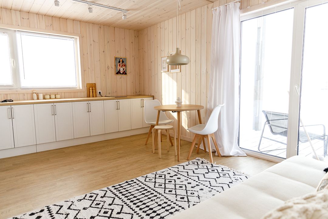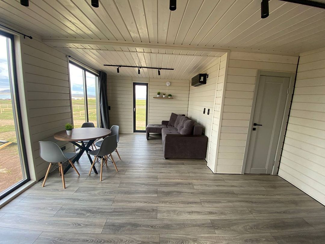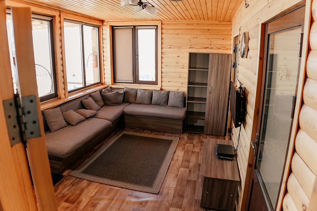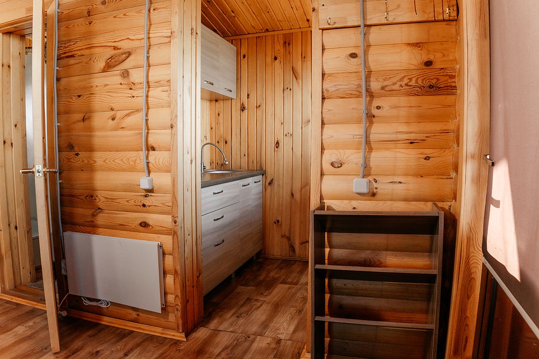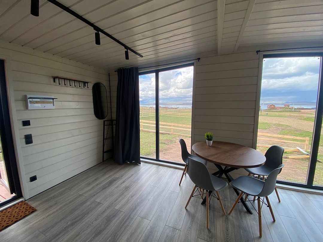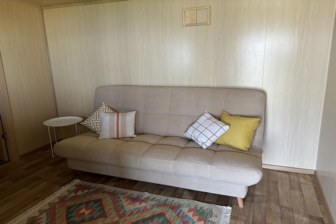 В гостиной оборудована кухня с встроенным холодильником, индукционной плитой и большой зоной готовки. Кондиционера в домике нет.