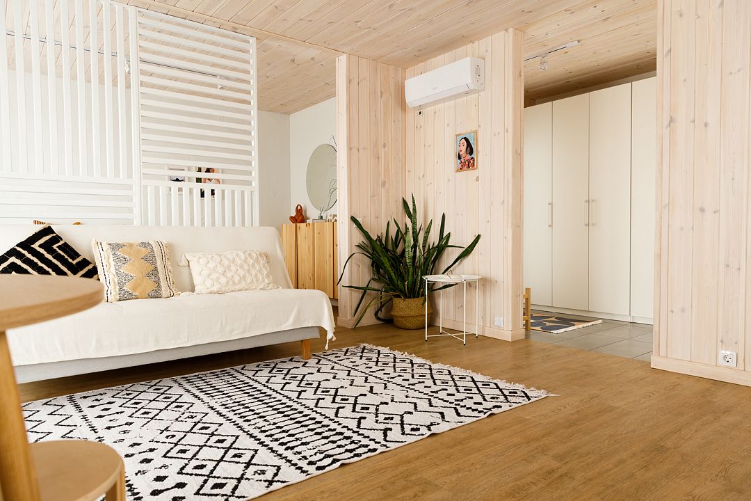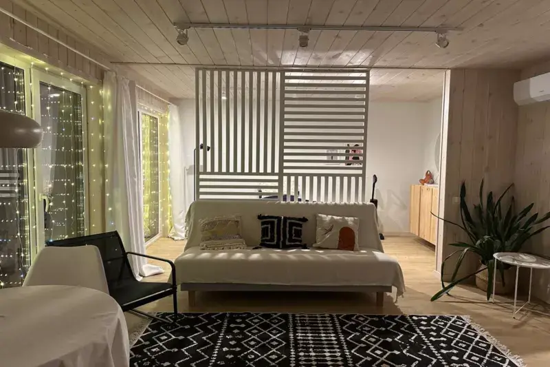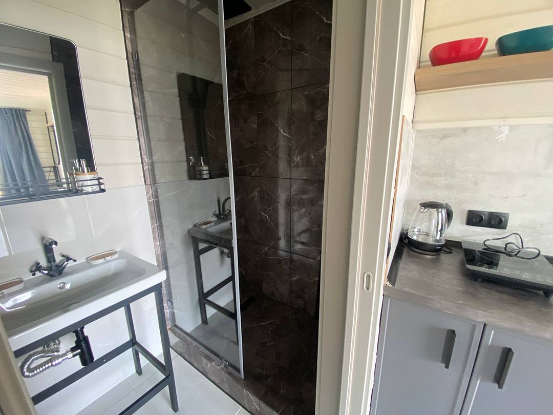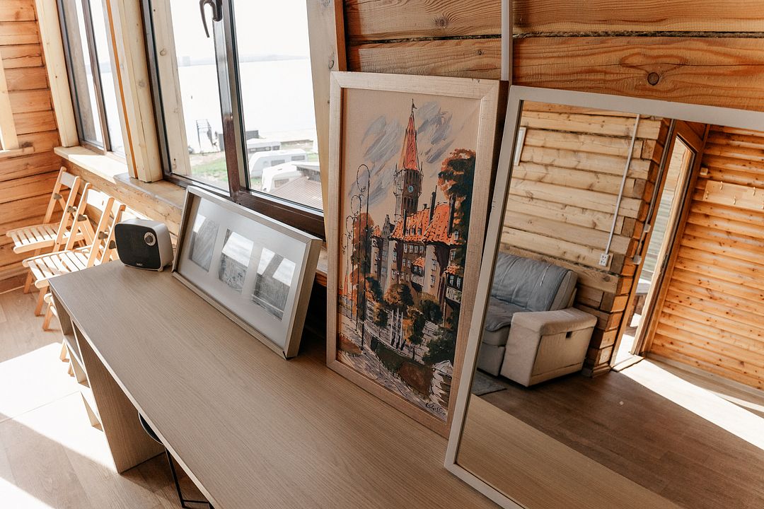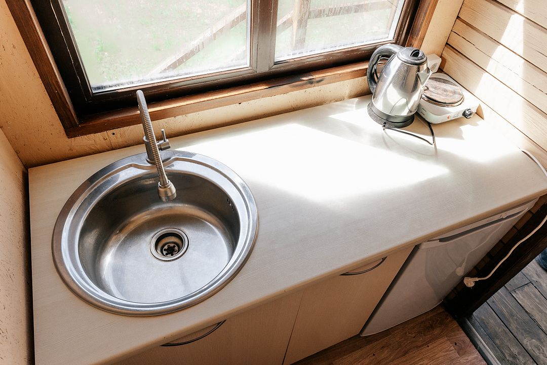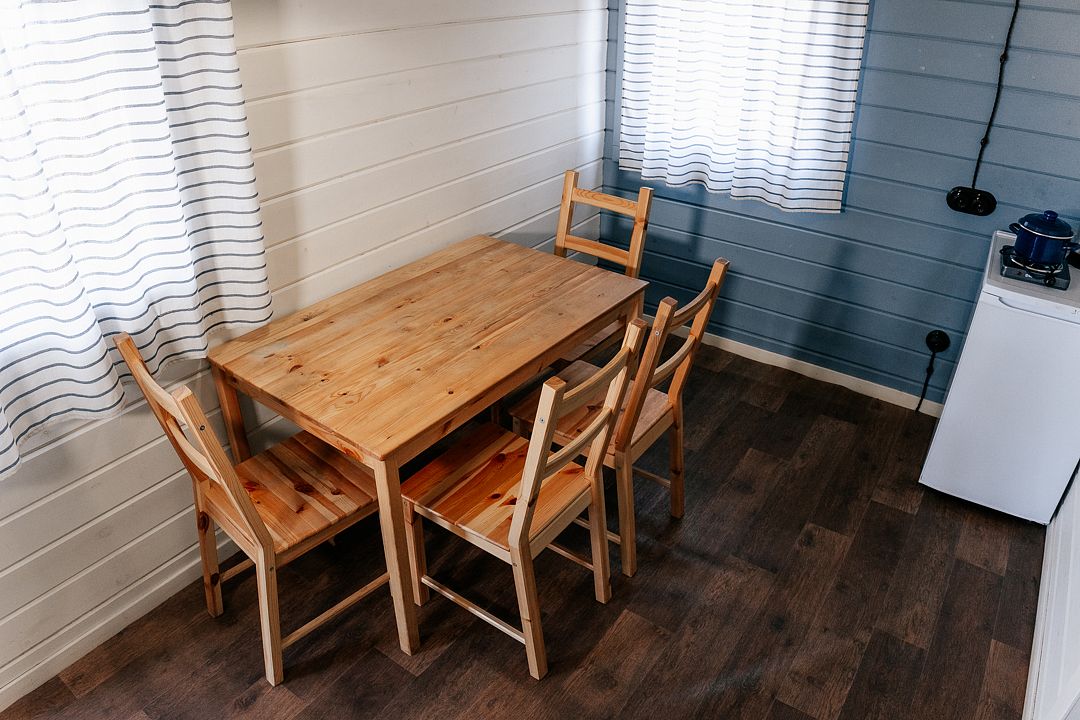 В гостиной оборудована кухня с встроенным холодильником, индукционной плитой и большой зоной готовки. Кондиционера в домике нет.