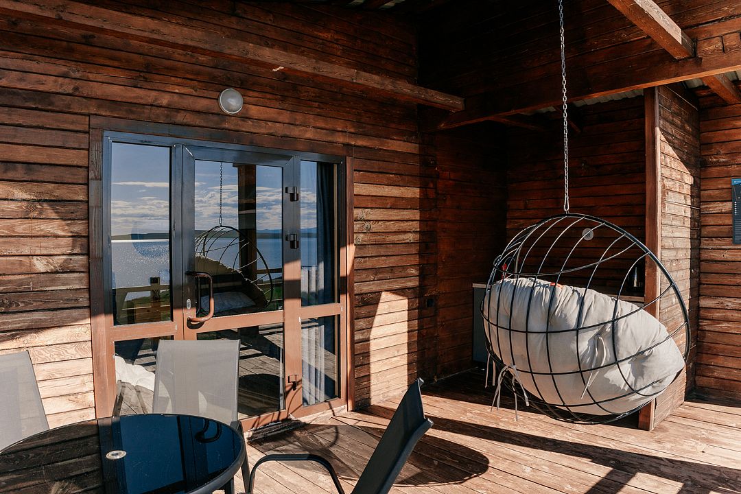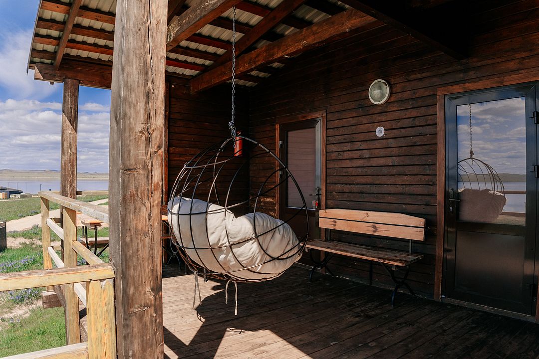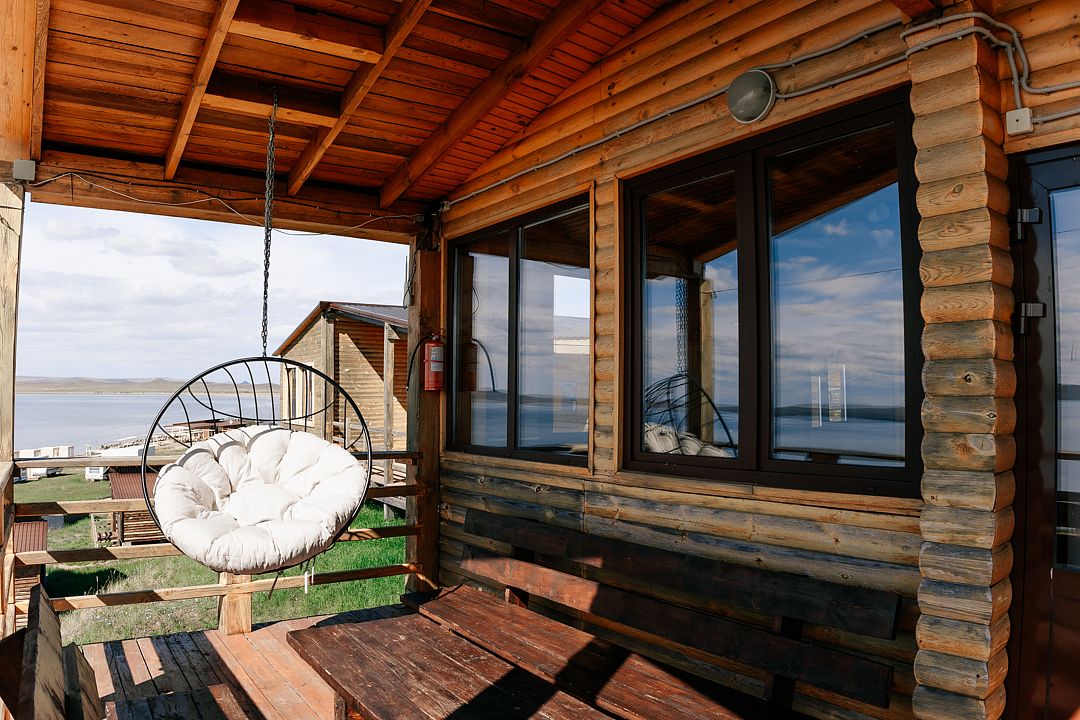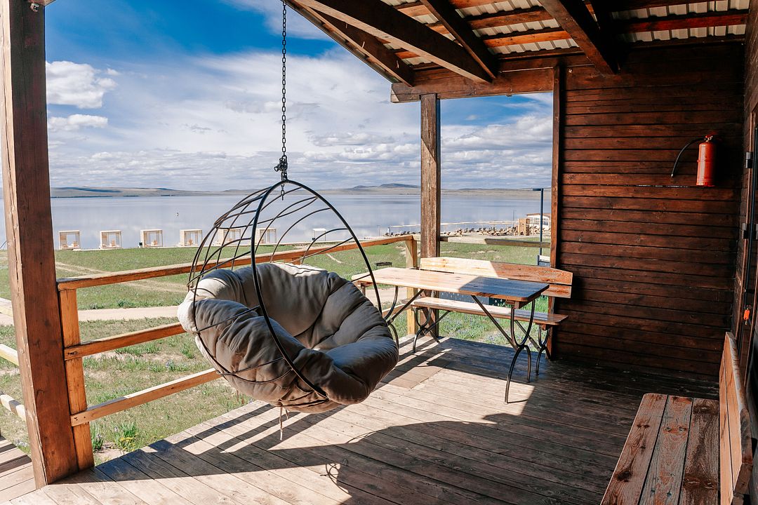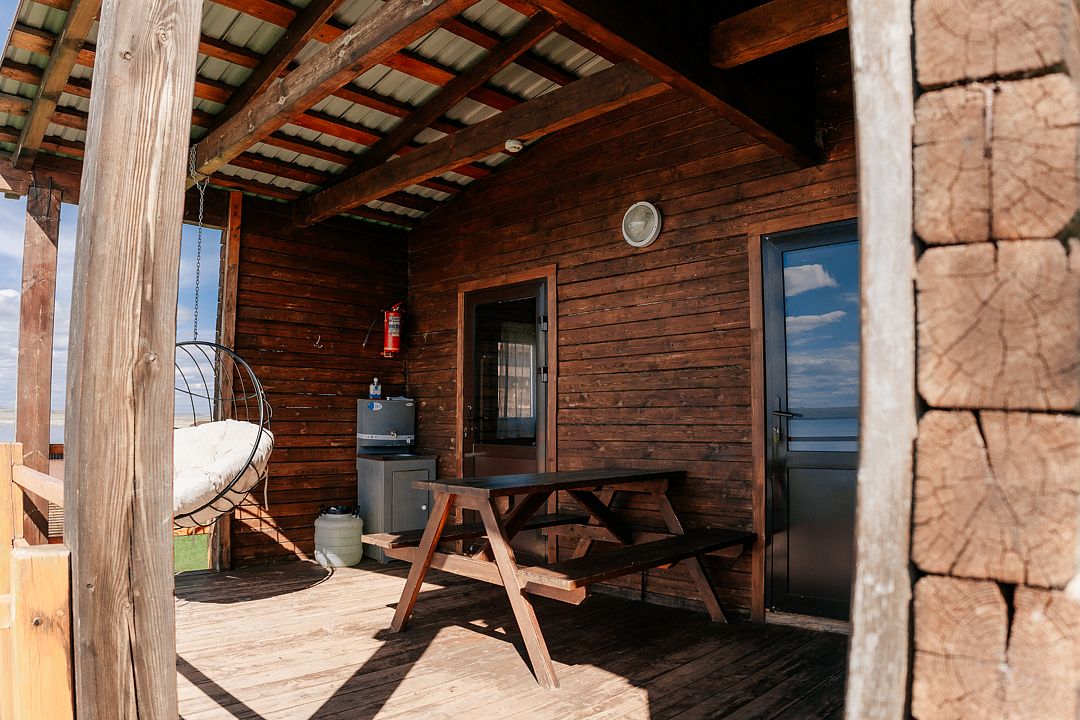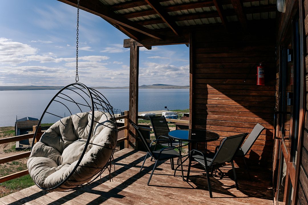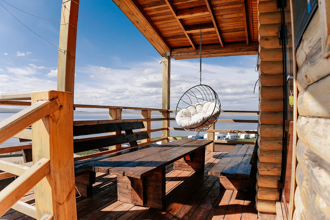 Терраса с видом на озеро оборудована качелей и мебелью из натурального дерева — столиком, скамейками. Здесь есть умывальник и емкость для воды.