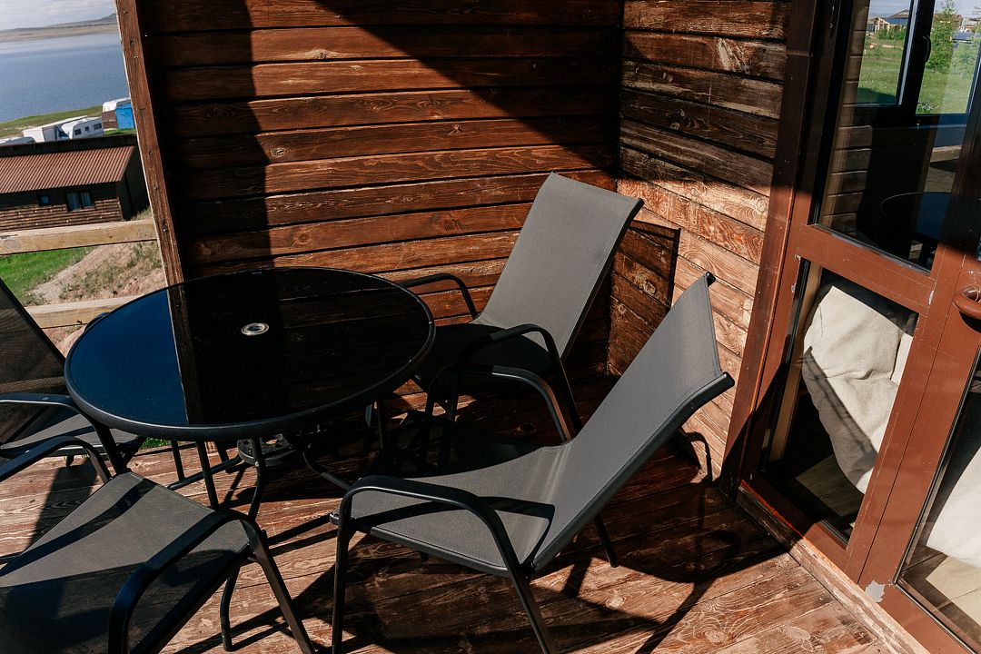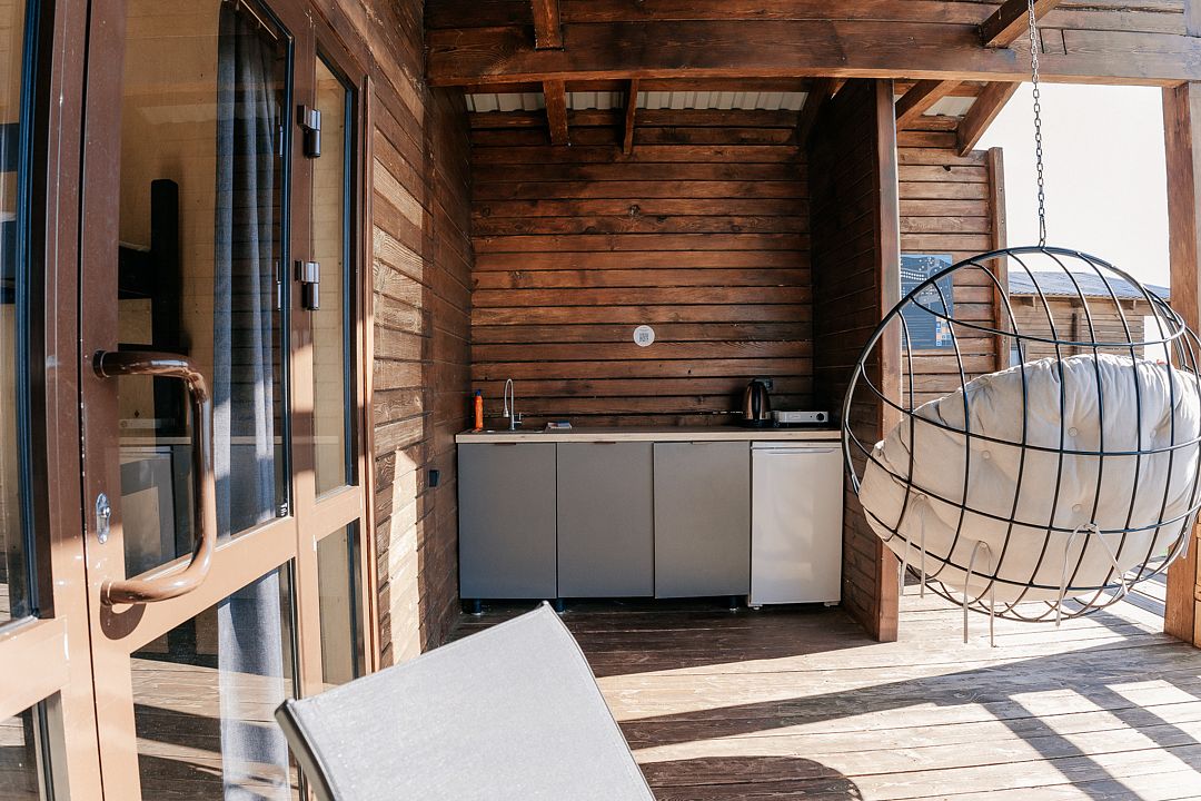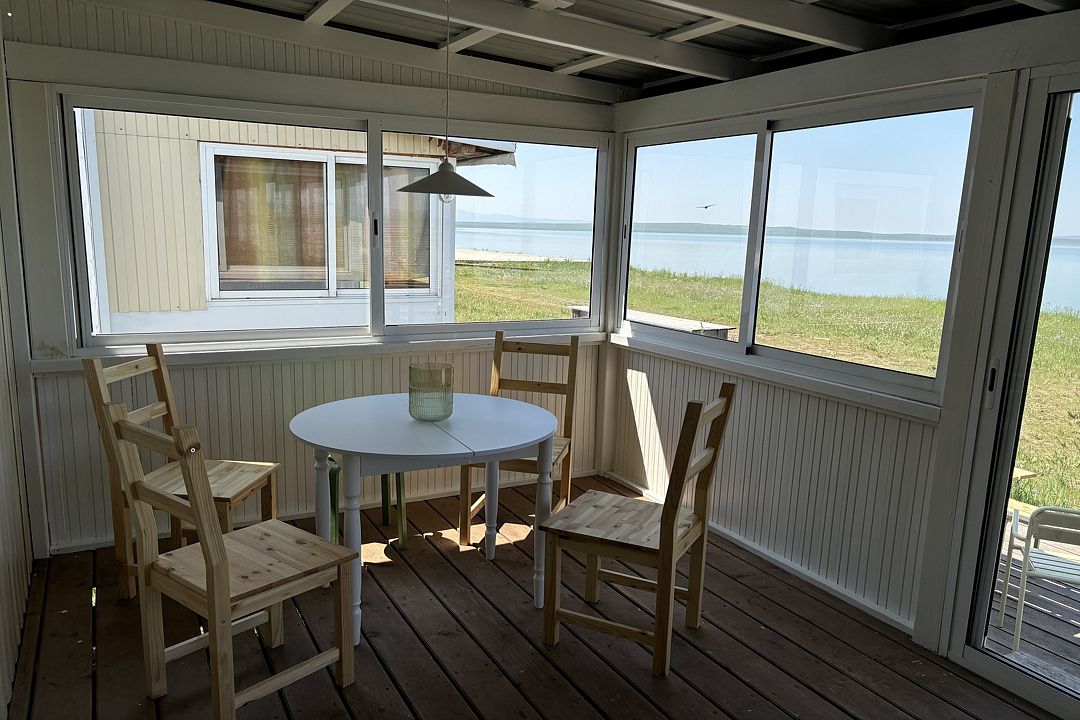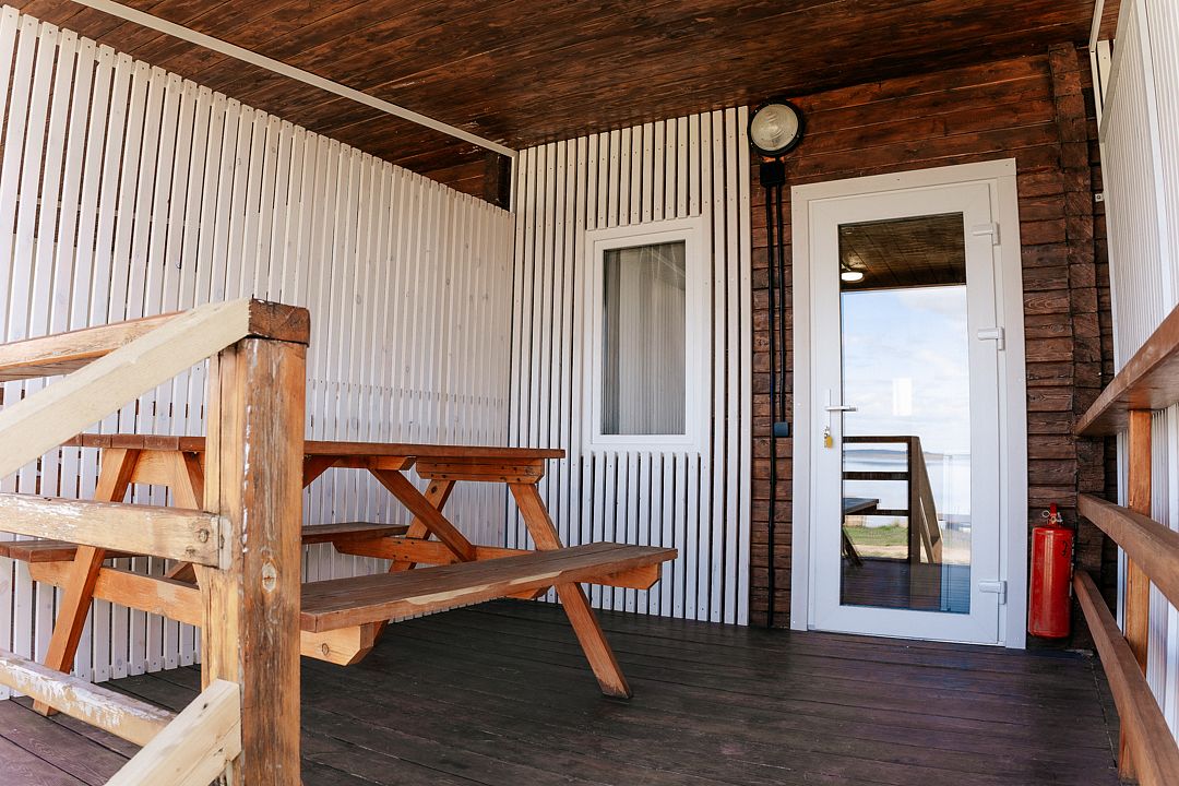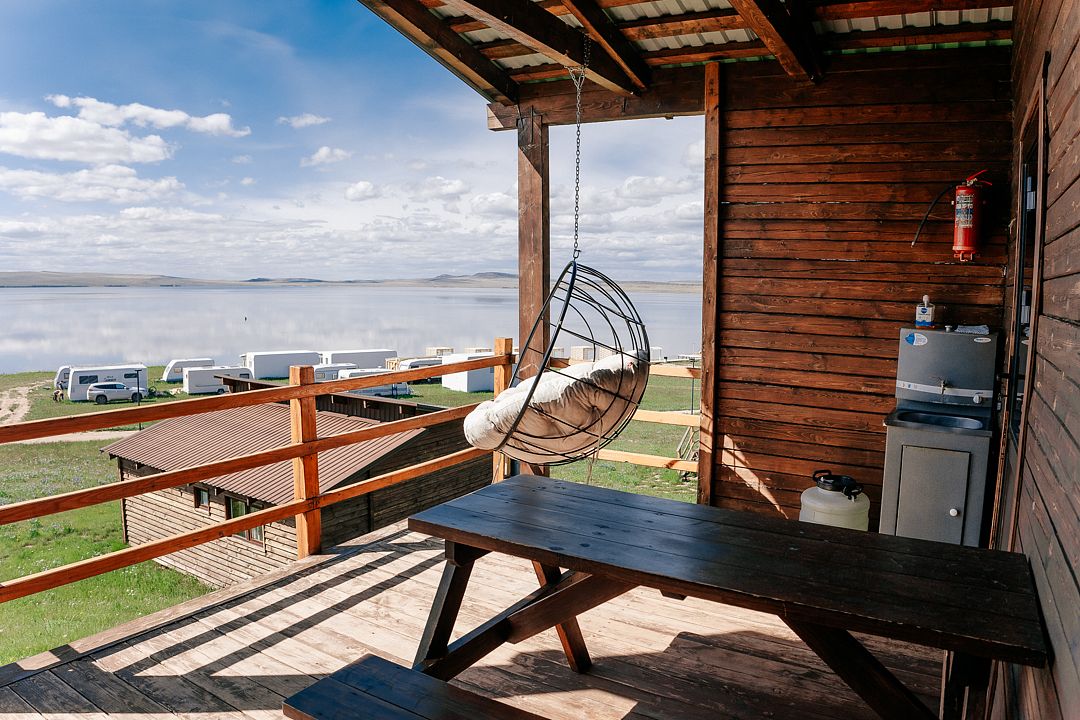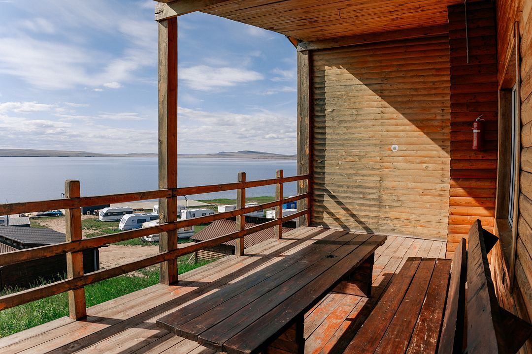 Терраса с видом на озеро оборудована качелей и мебелью из натурального дерева — столиком, скамейками. Здесь есть умывальник и емкость для воды.