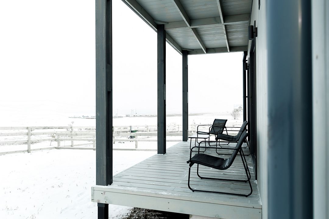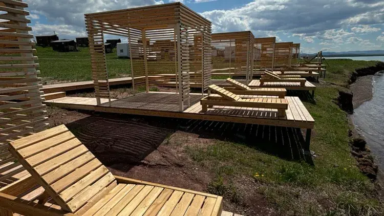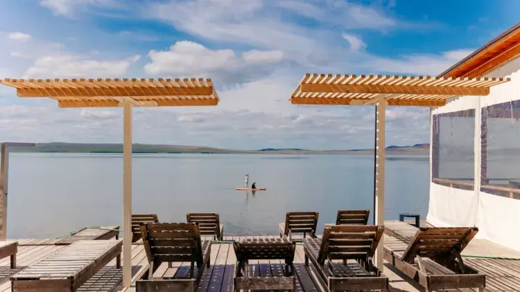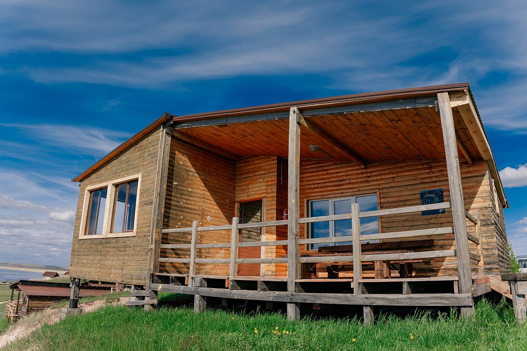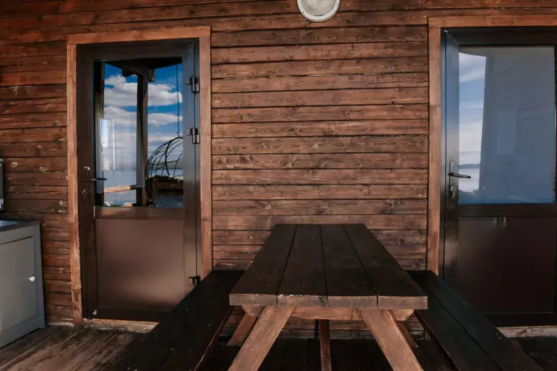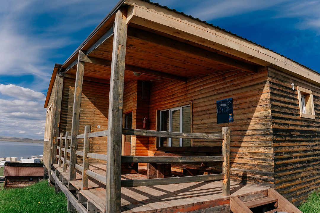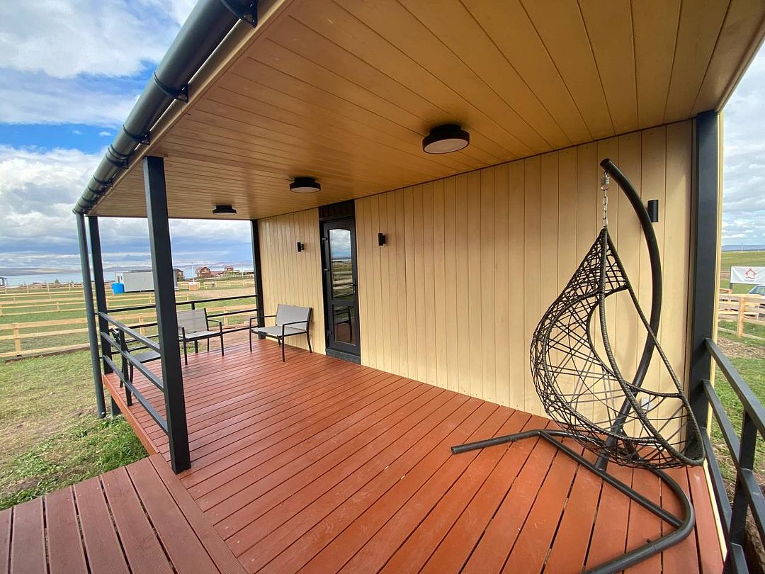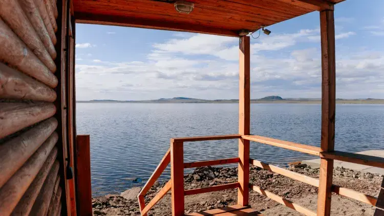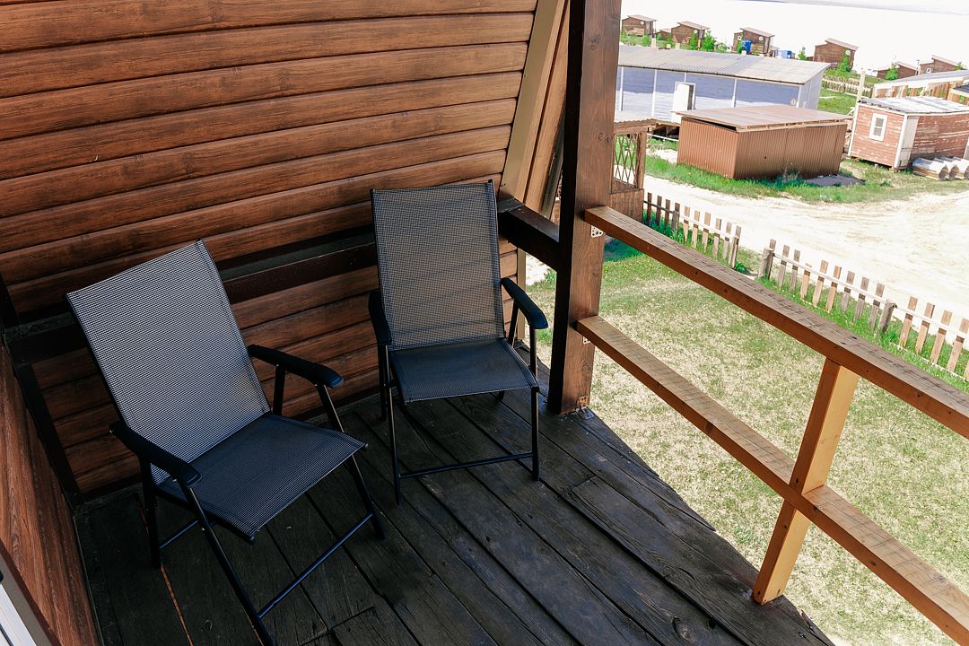 Терраса с видом на озеро оборудована качелей и мебелью из натурального дерева — столиком, скамейками. Здесь есть умывальник и емкость для воды.