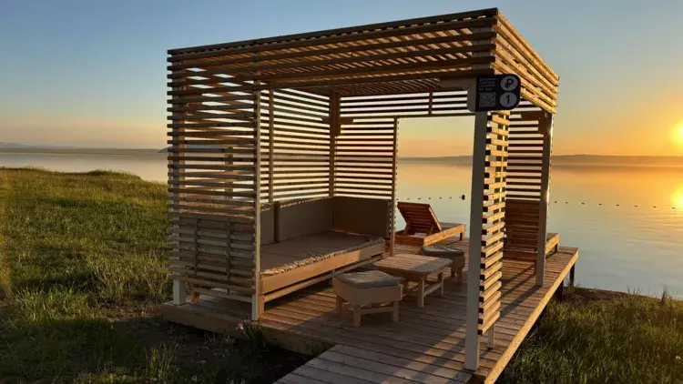 Приватный песчано–галечный пляж оборудован лежаками и предназначен только для гостей «Большого плеса». Здесь можно и нужно расслабляться, загорать на удобных лежаках и купаться в солоноватой воде чистейшего озера Белё.