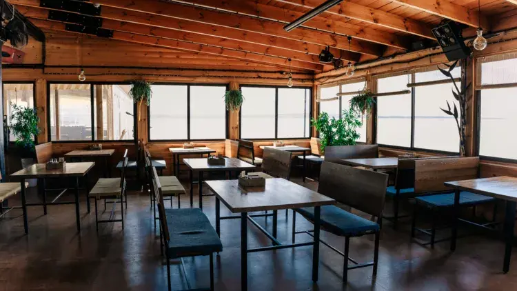 Терраса с видом на озеро оборудована качелей и мебелью — столиком, стульями и кухонной зоной с холодильником, чайником, плиткой и посудой.