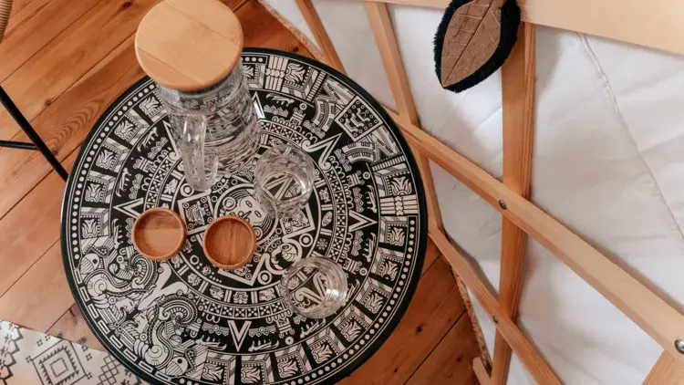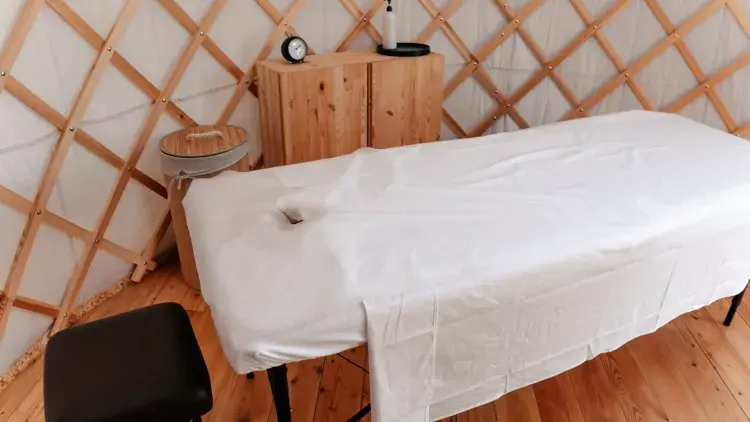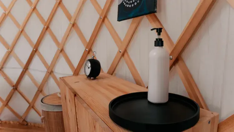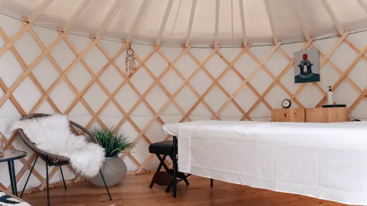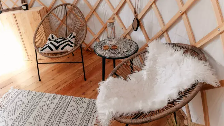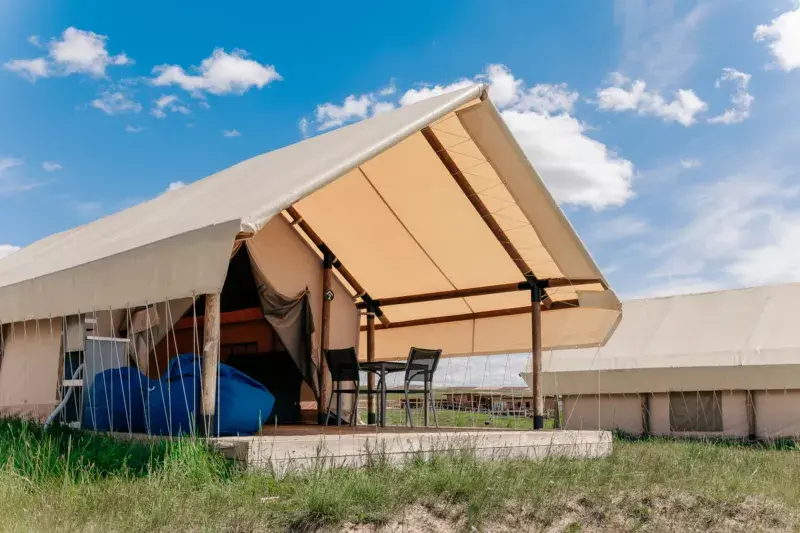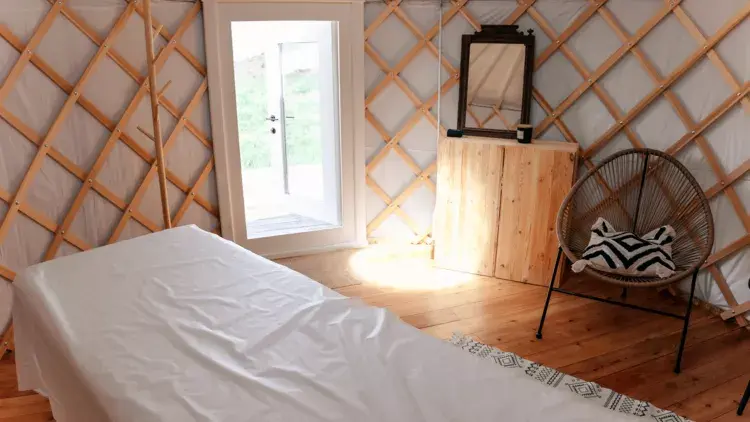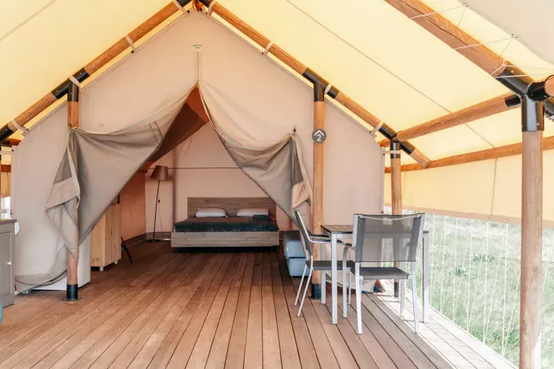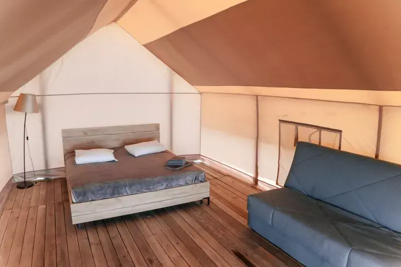 Шатер оснащен всем необходимым. Внутри имеются двуспальная кровать и раскладной диван. Есть комод, зеркало, мини-холодильник, чайник, постельные принадлежности.