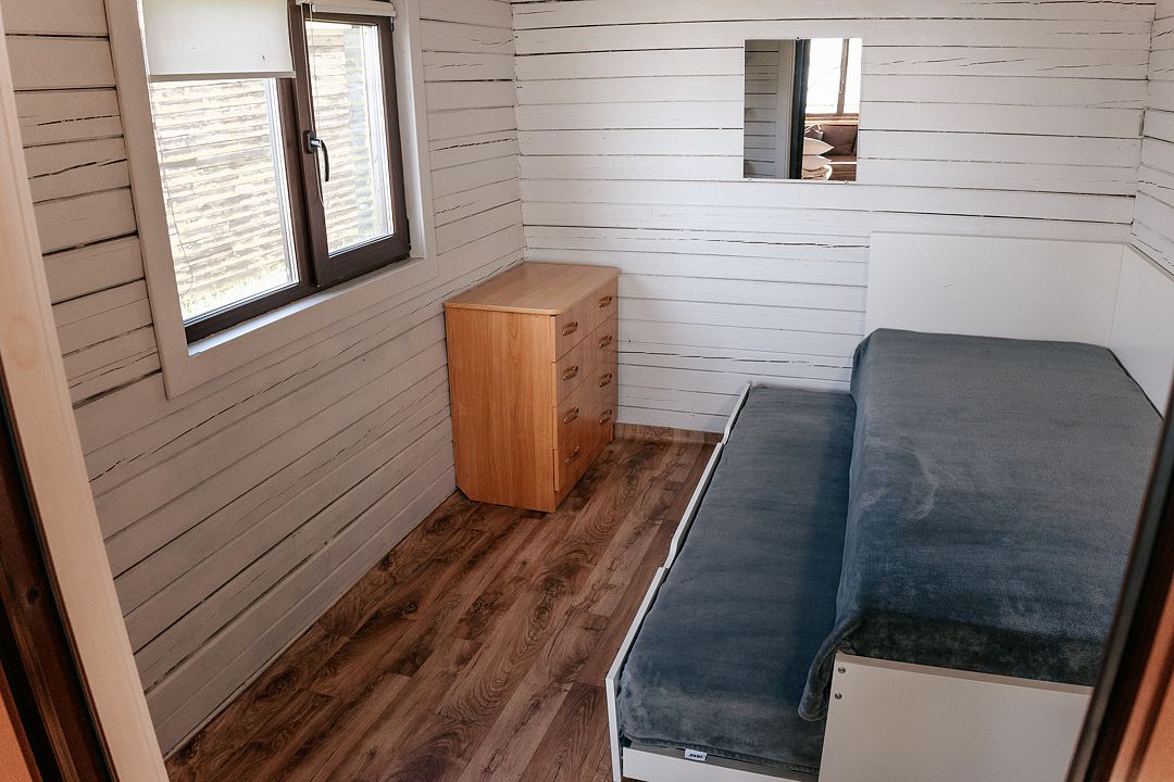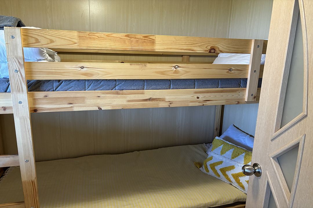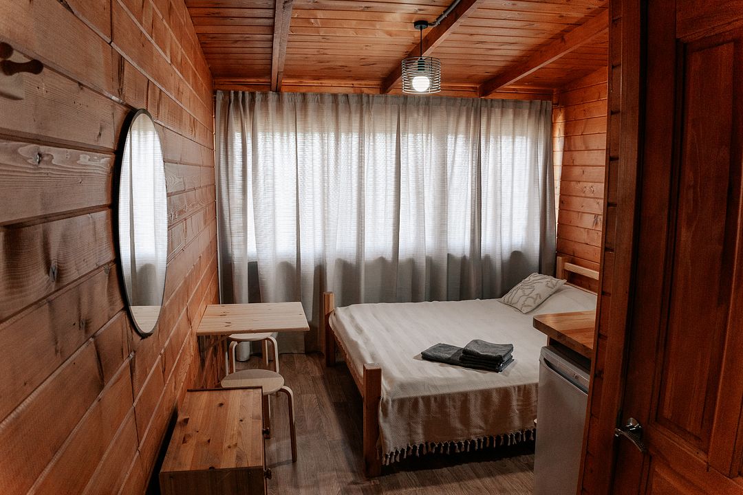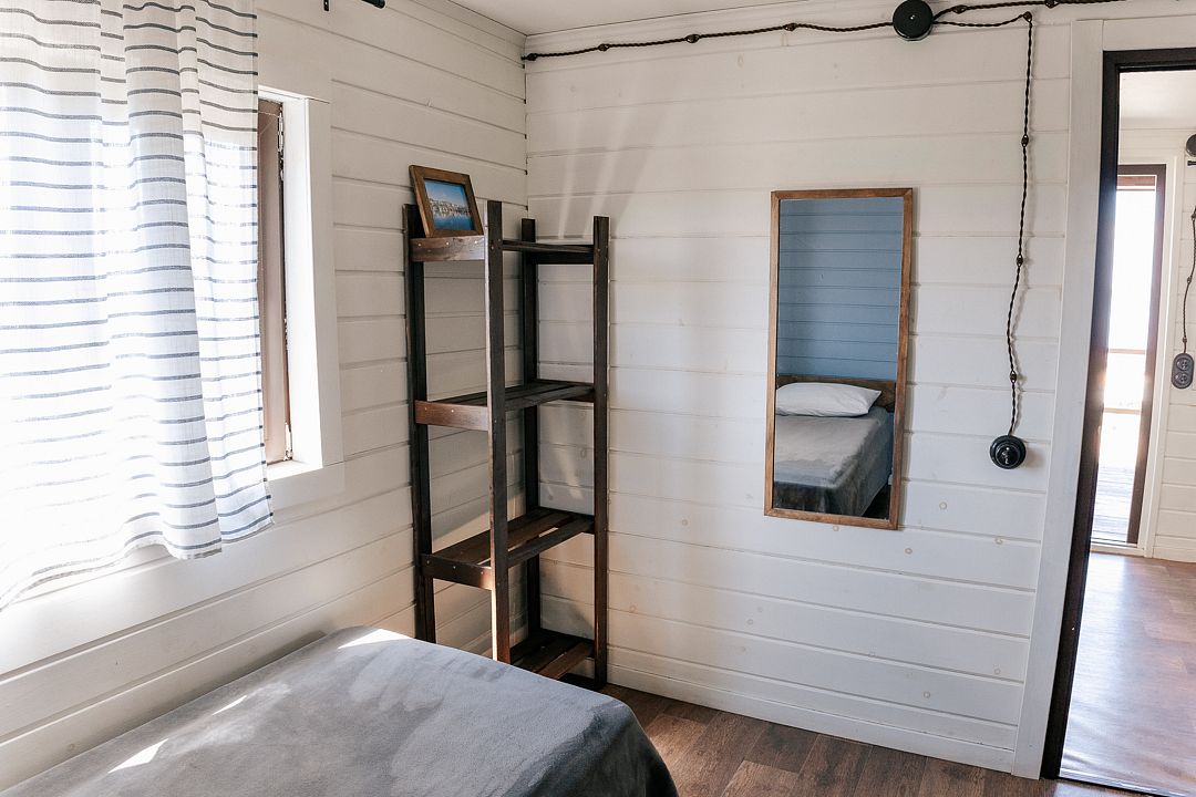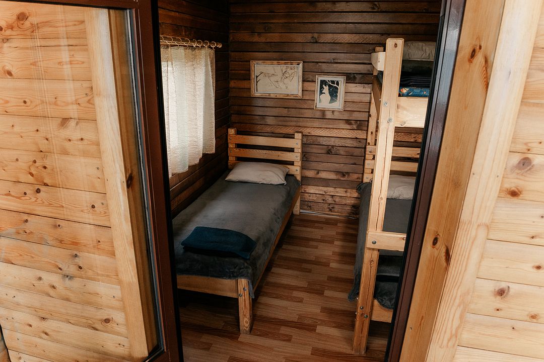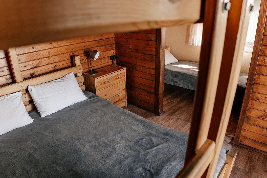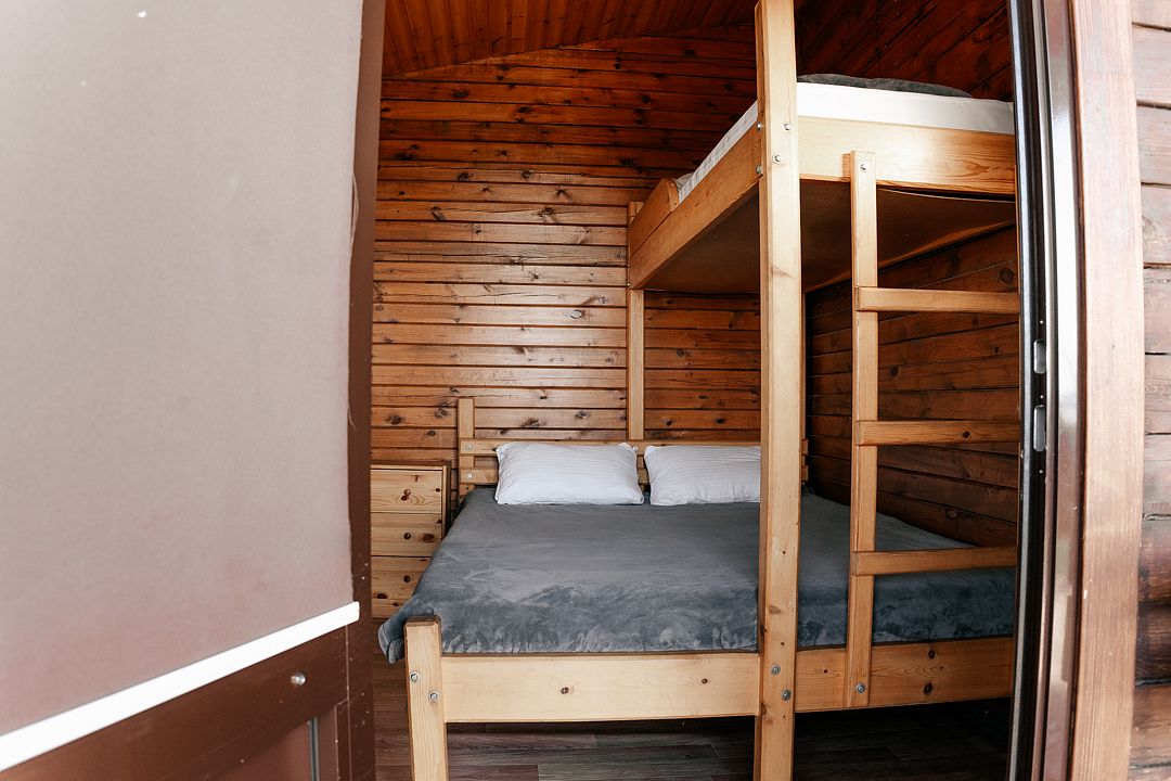 Домик идеально подходит для семейного отдыха с детьми. В комнате расположены большая двуспальная и одна двухъярусная кровати. Есть полки, зеркало, холодильник, комод и постельные принадлежности.