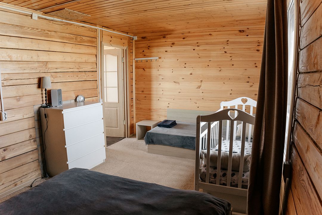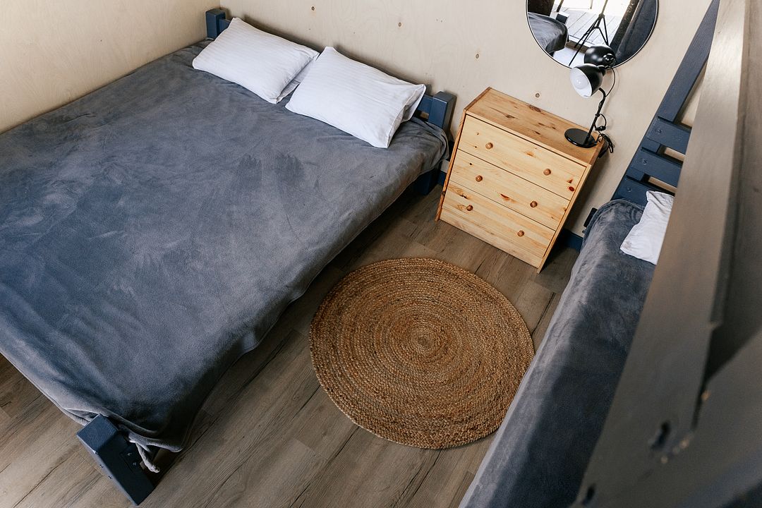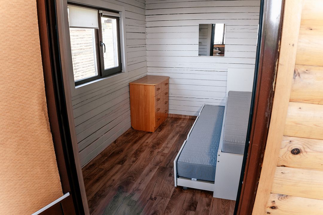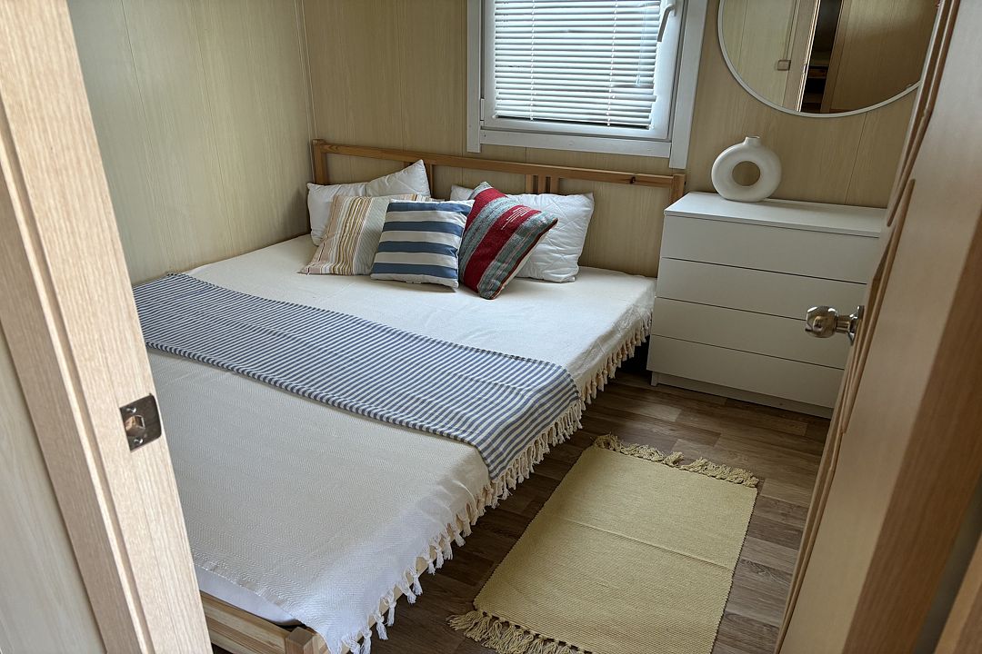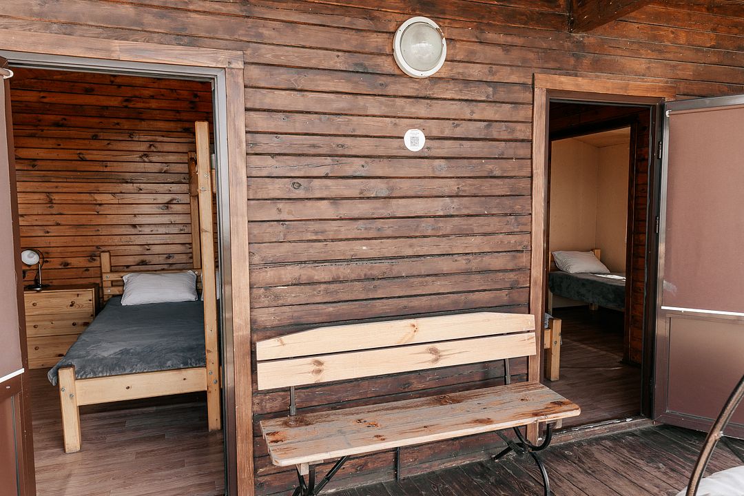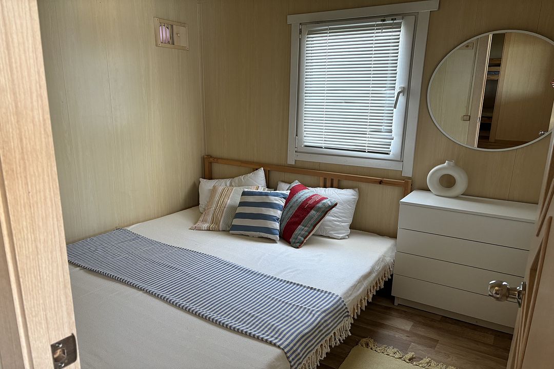 Домик идеально подходит для семейного отдыха с детьми. В комнате расположены большая двуспальная и одна двухъярусная кровати. Есть полки, зеркало, холодильник, комод и постельные принадлежности.